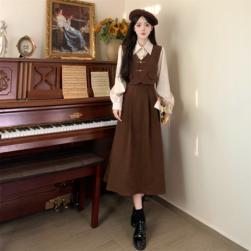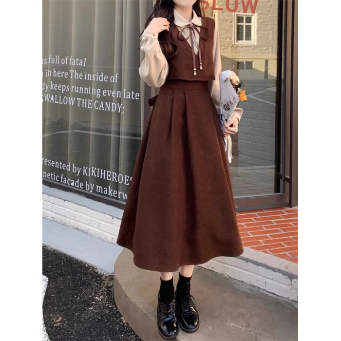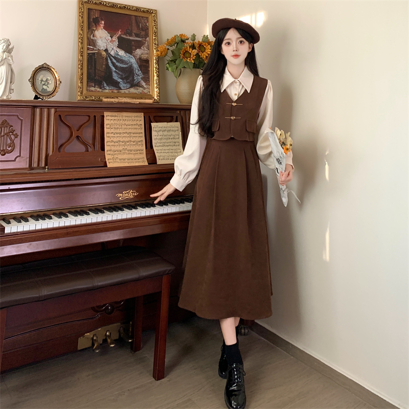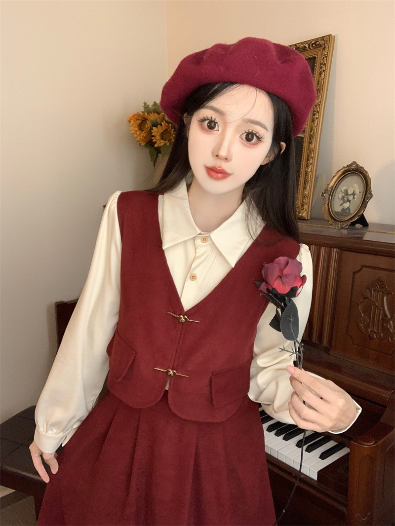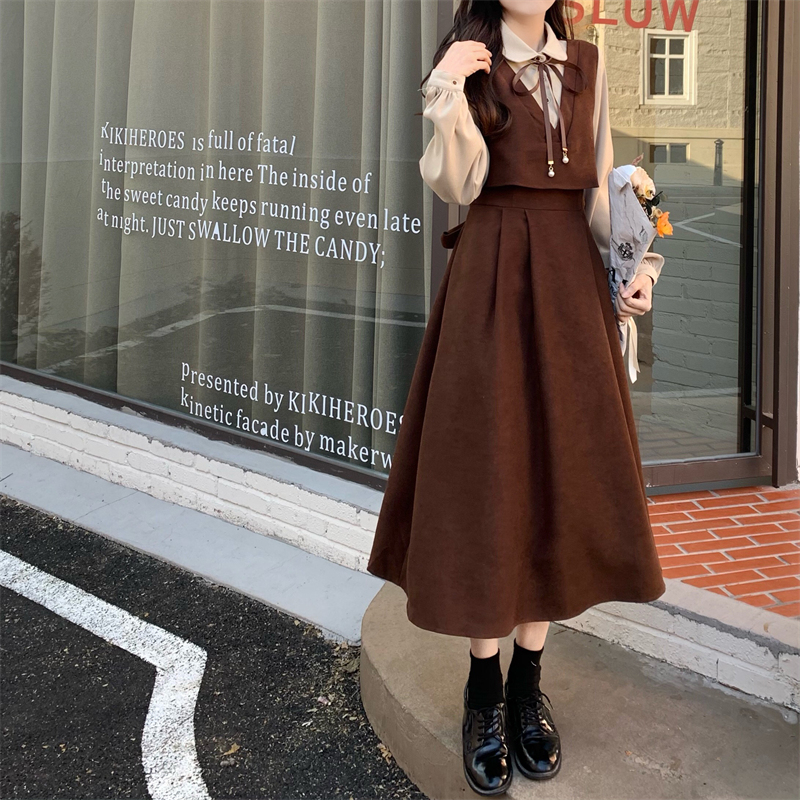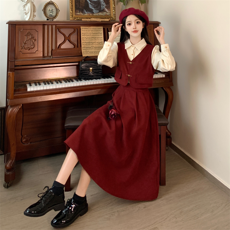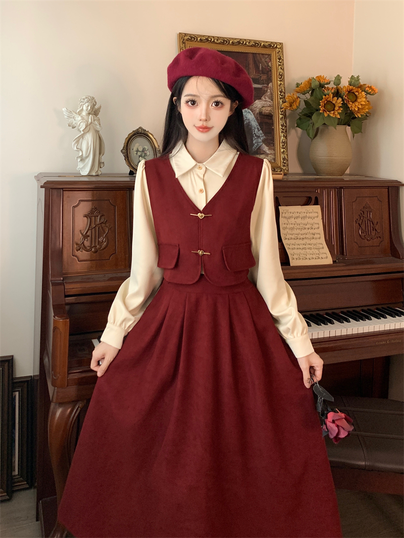 冬裝燈芯絨紅色連衣裙大碼女裝學院風假兩件套裝獨特漂亮長裙子厚