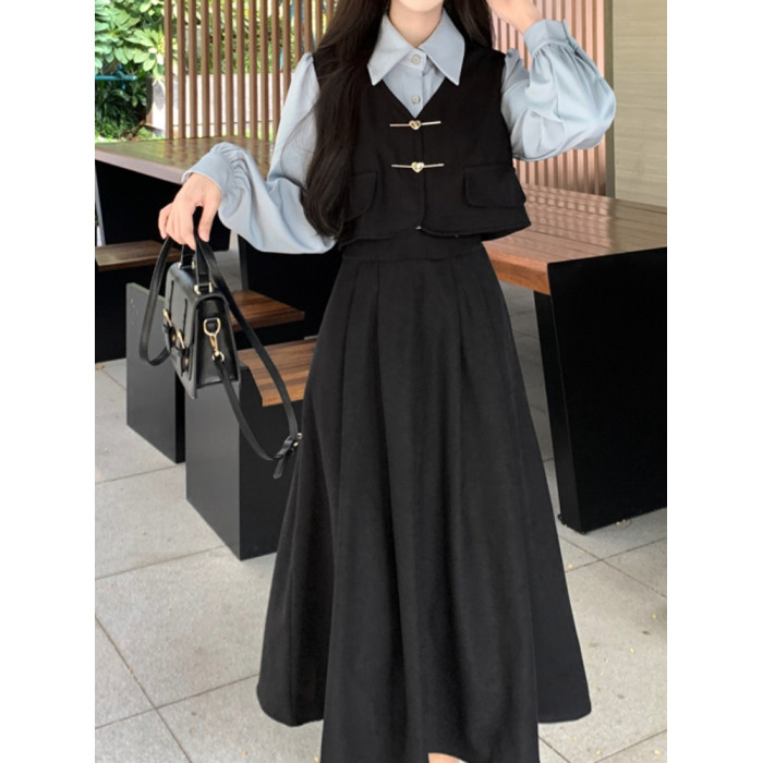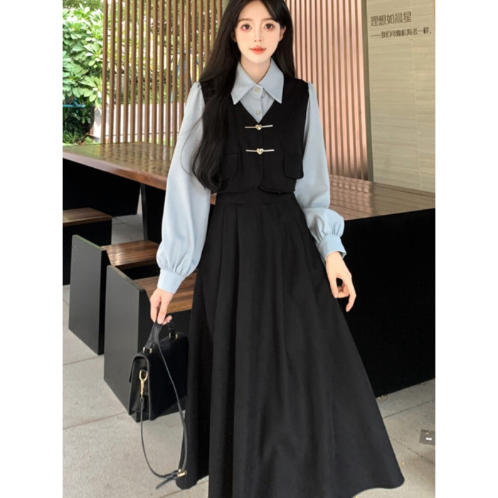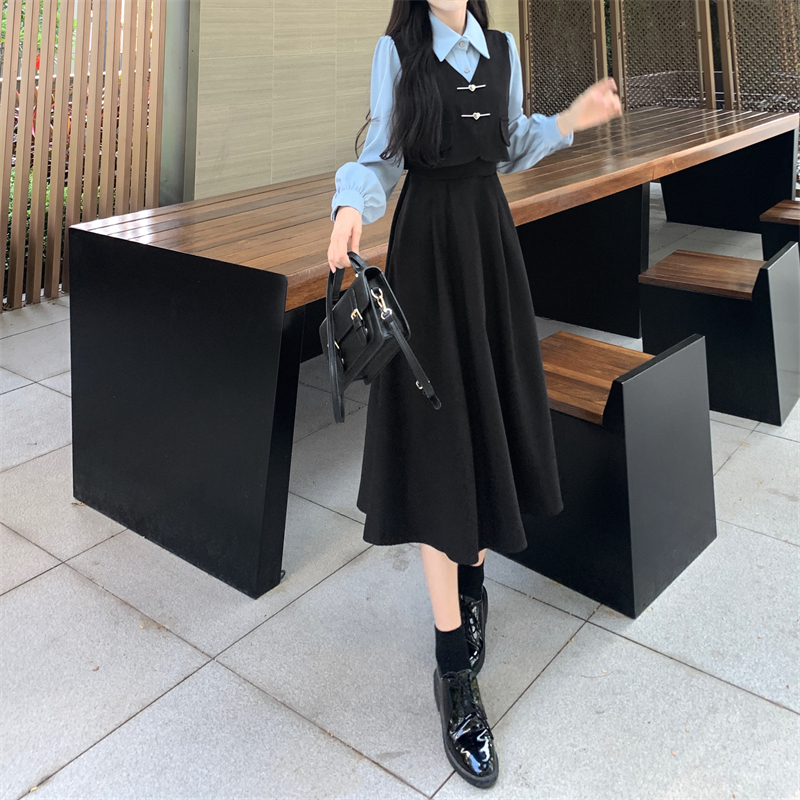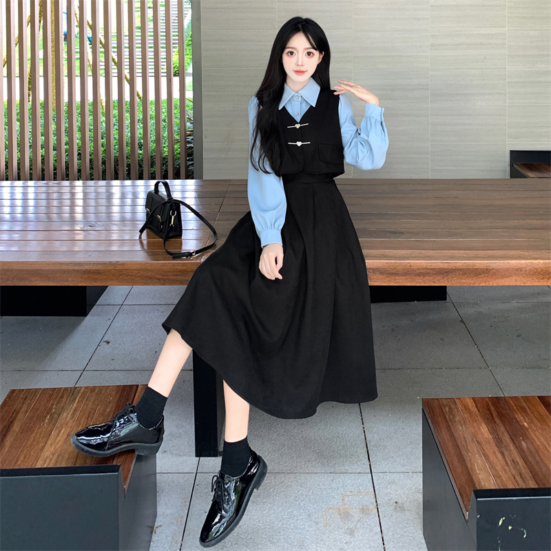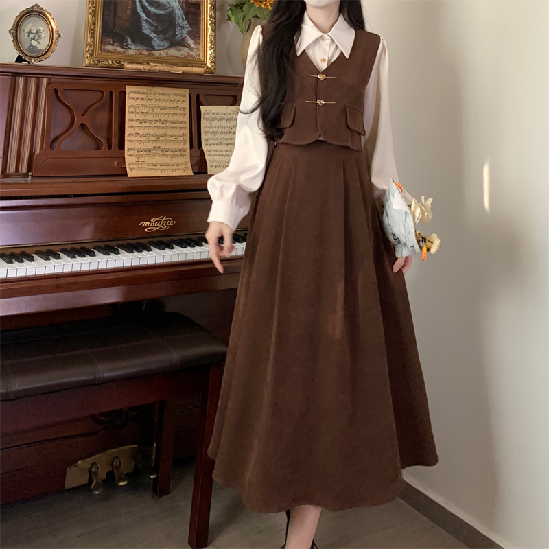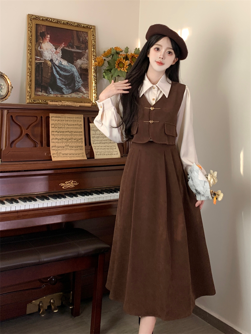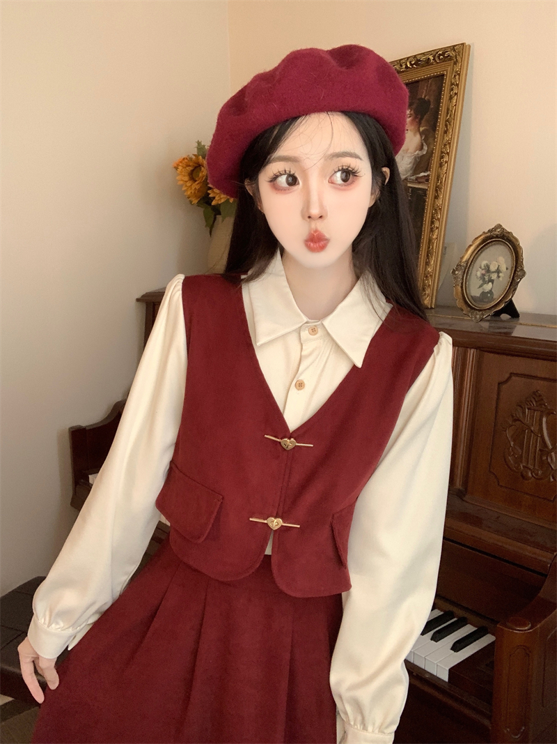 冬裝燈芯絨紅色連衣裙大碼女裝學院風假兩件套裝獨特漂亮長裙子厚