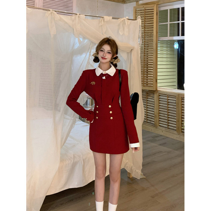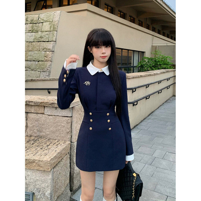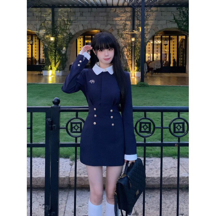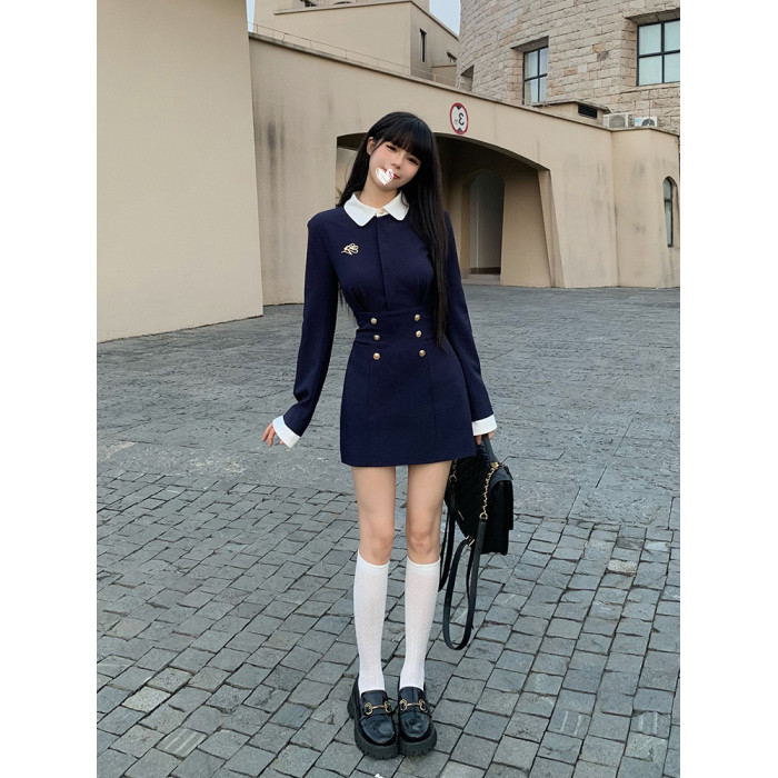 法式假兩件連衣裙子女收腰氣質設計感小衆長袖polo領a字短裙秋季