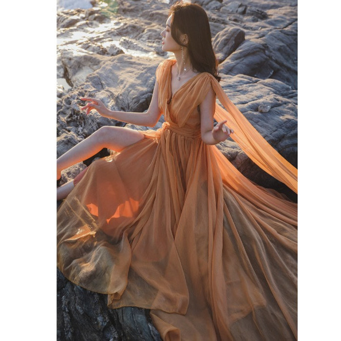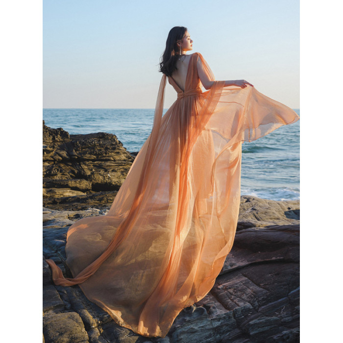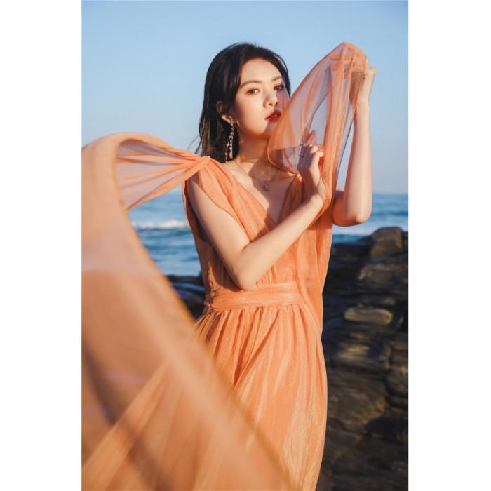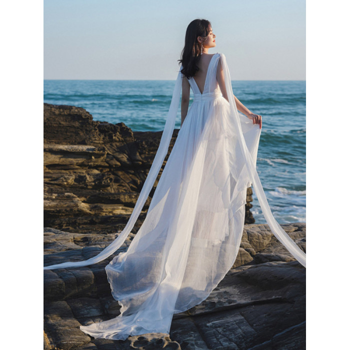 白色飄逸長裙吊帶拖地輕婚紗連衣裙超長款沙灘裙海邊拍照衣服超仙