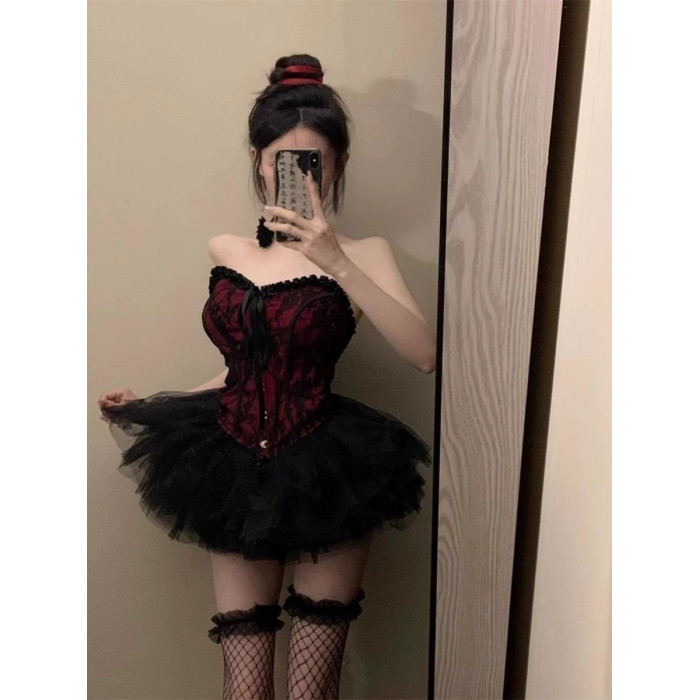 復古宮廷風性感辣妹抹胸上衣夏季新款高腰顯瘦蓬蓬短裙子兩件套女