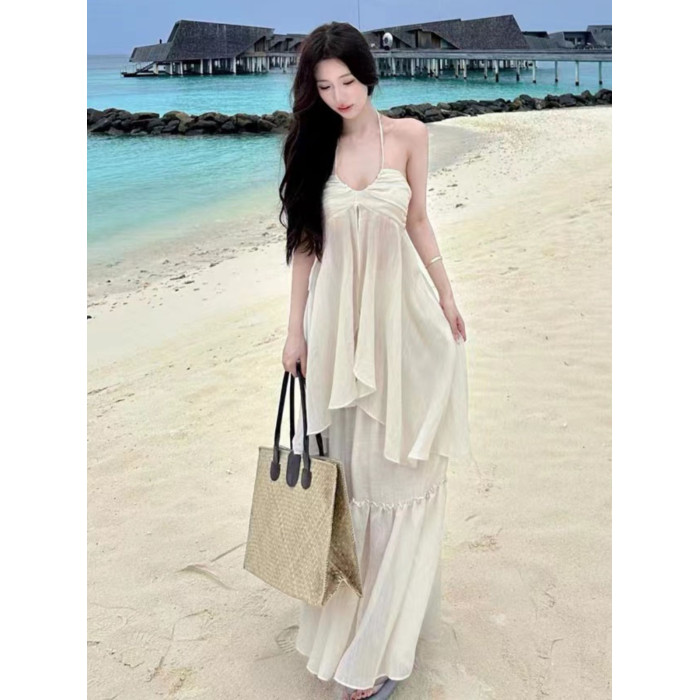 法式復古浪漫氛圍感超仙海邊度假抹胸掛脖吊帶套裝裙大擺飄逸長裙