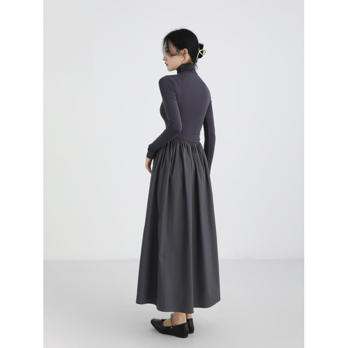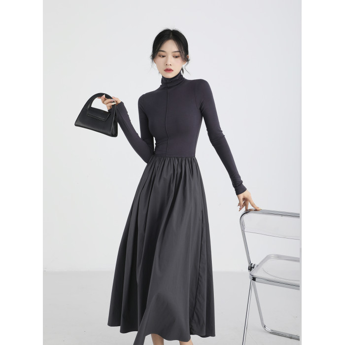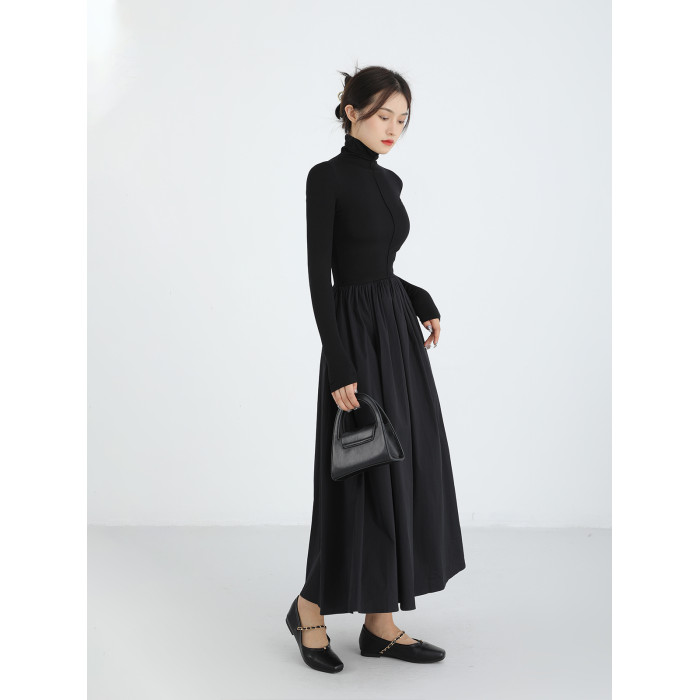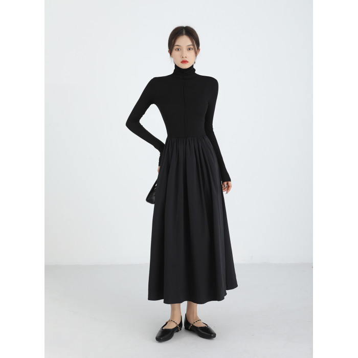 XinmonLee赫本風拼接高領A字連衣裙女秋款收腰修身顯瘦小衆設計感