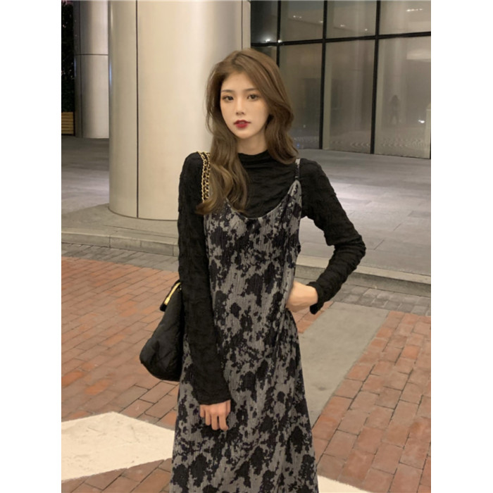 大碼復古紥染吊帶連衣裙套裝秋冬胖MM設計感寬松遮肉中長款裙子
