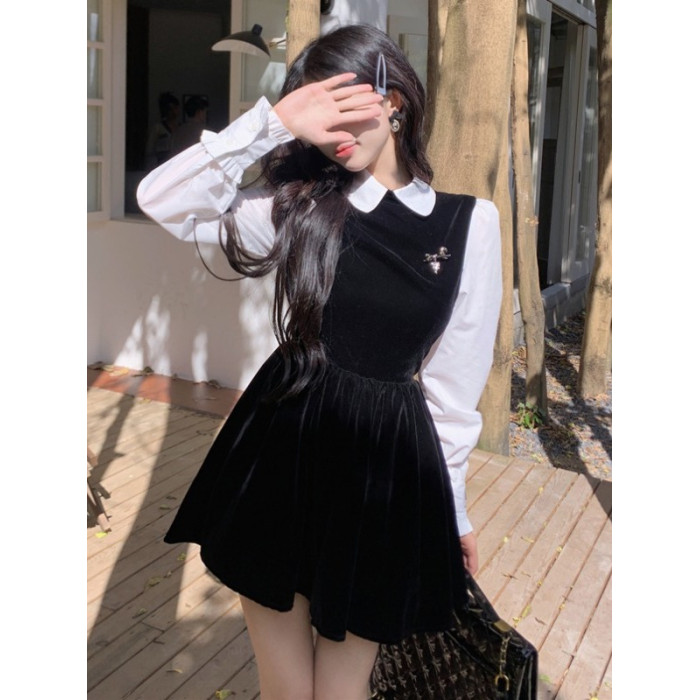 韓系溫柔風減齡高級感娃娃領長袖小黑裙小個子高級精緻連衣裙秋季