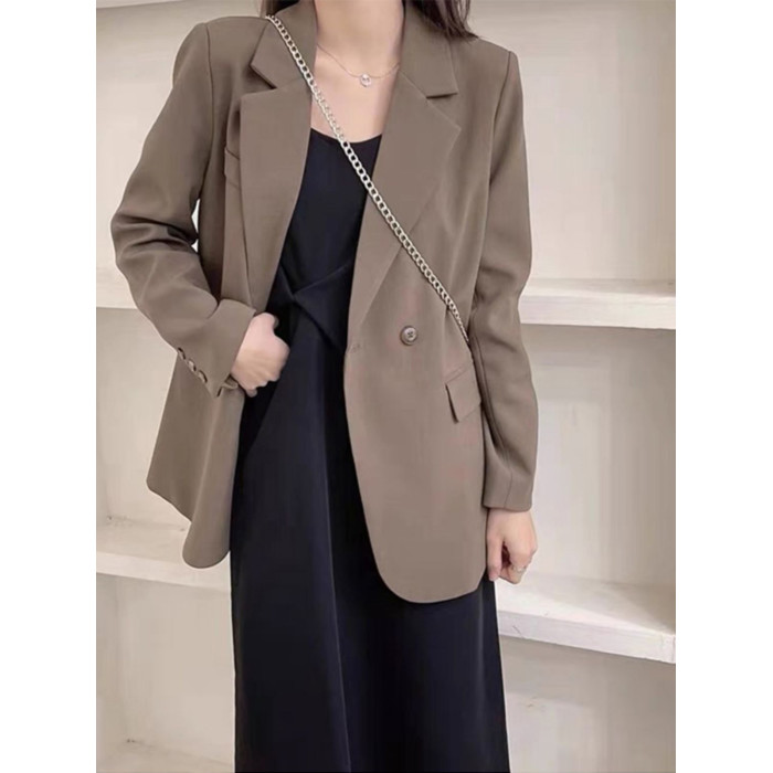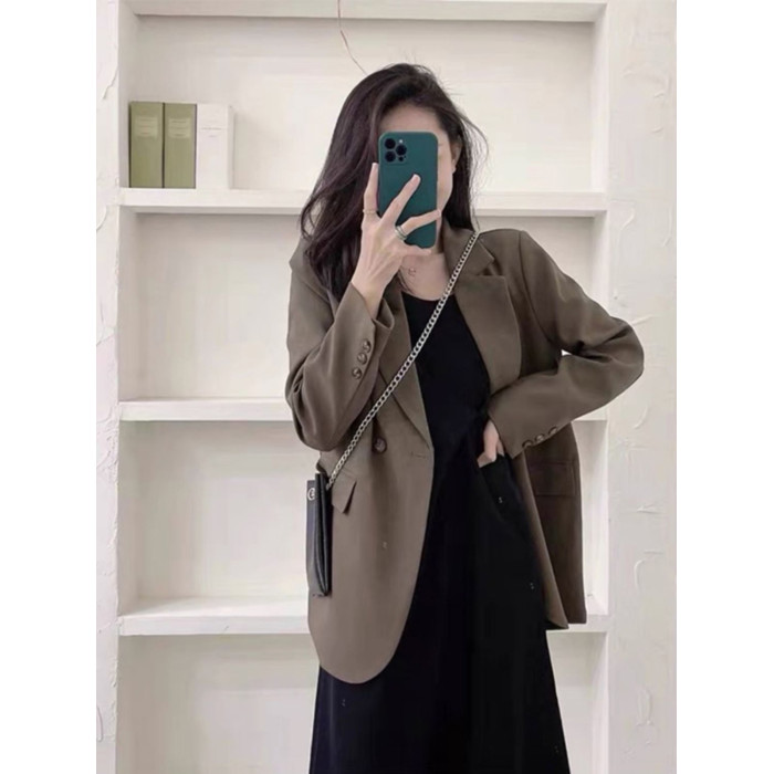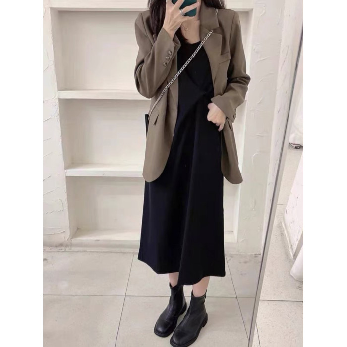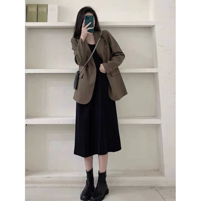 春秋新款大碼胖mm鹽系穿搭遮肉顯瘦西裝外套吊帶連衣裙兩件套裝女