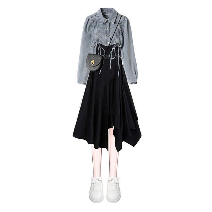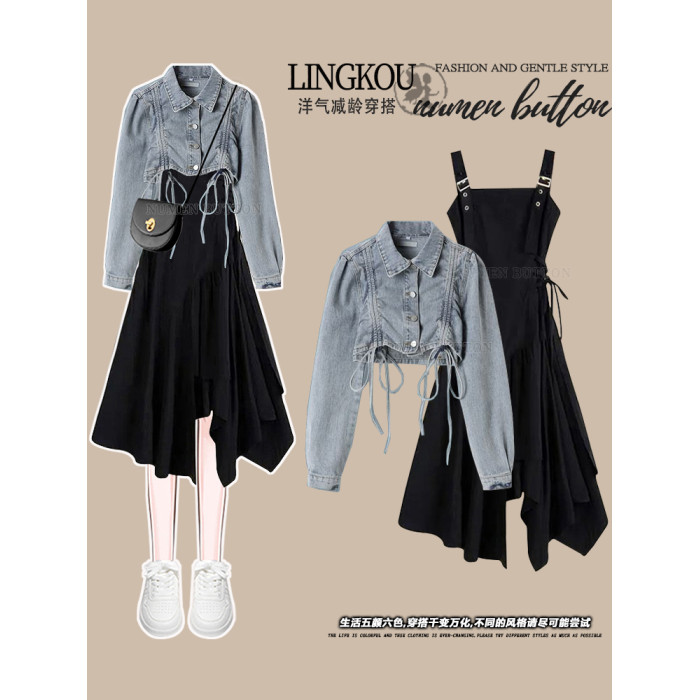 大碼春秋牛仔套裝女設計感寬松外套氣質不規則吊帶連衣裙兩件套