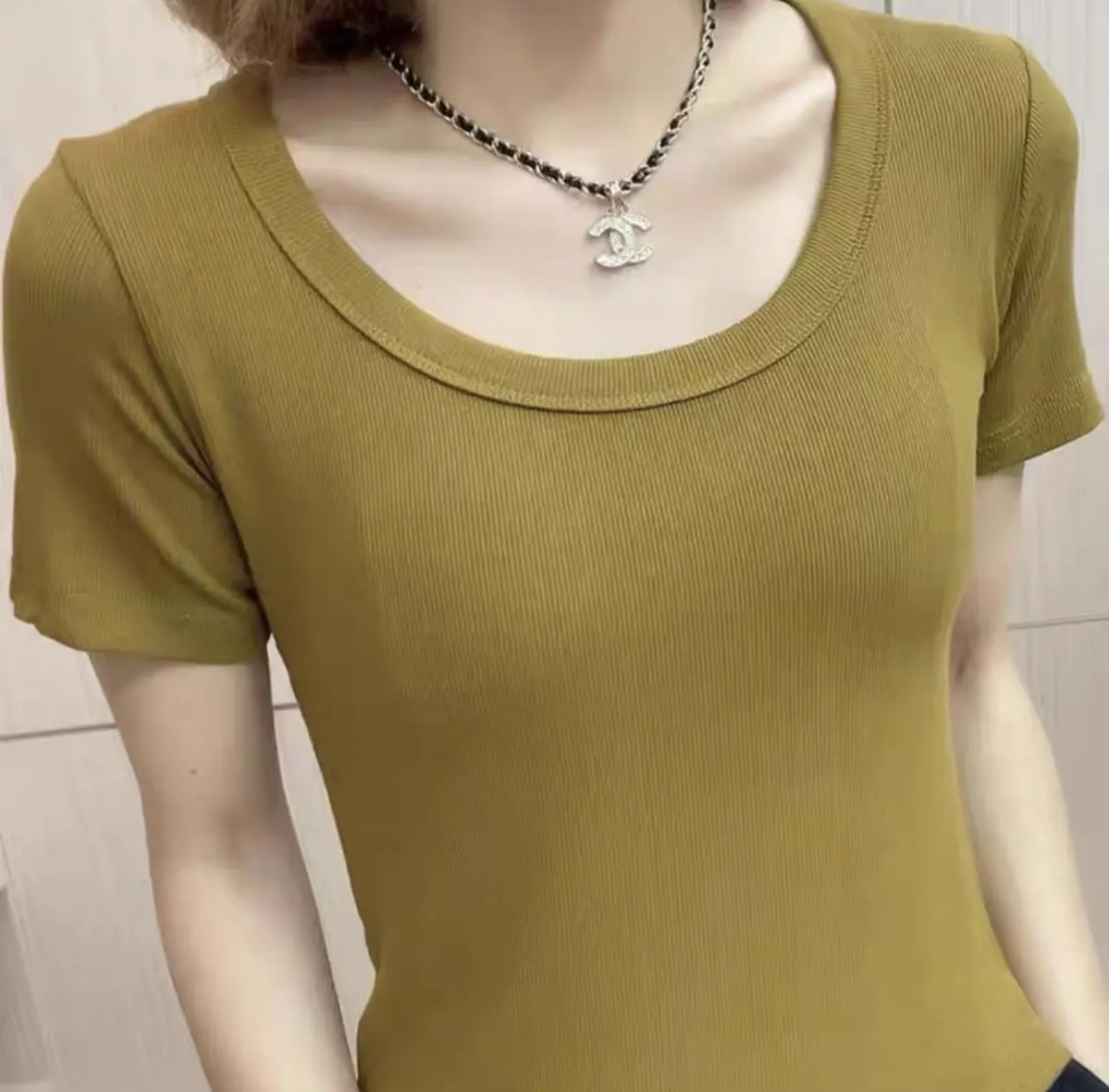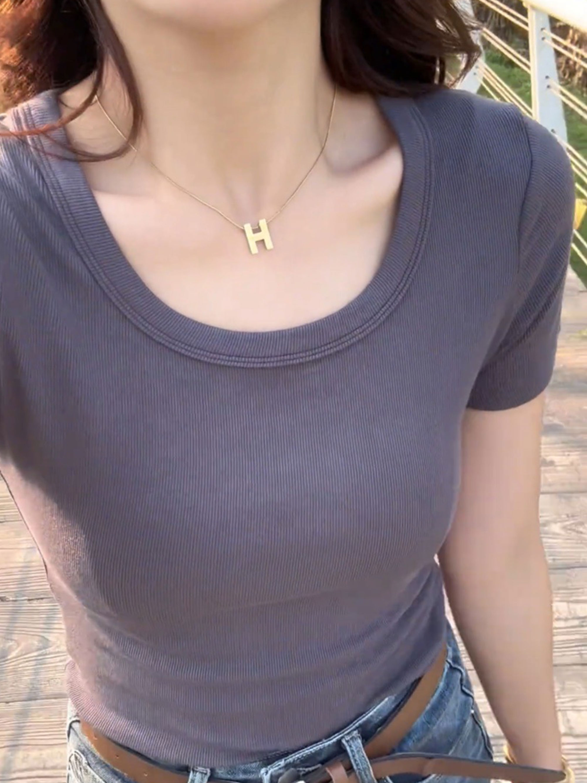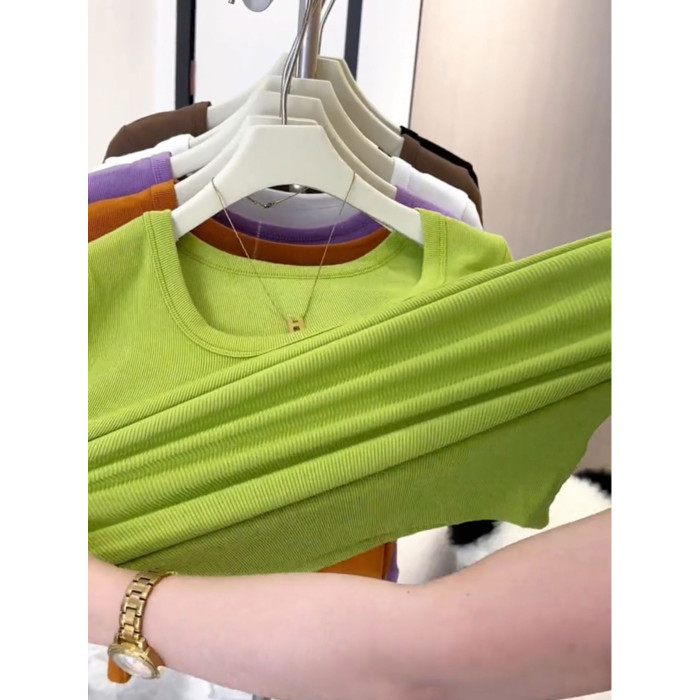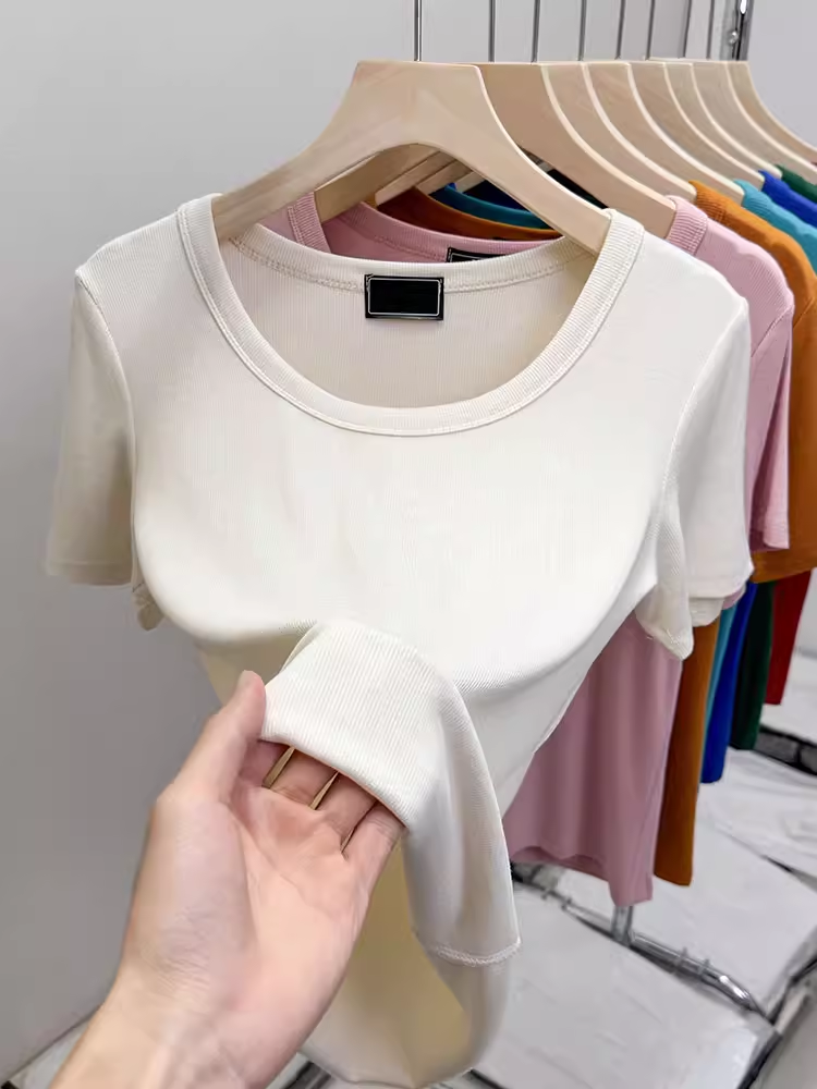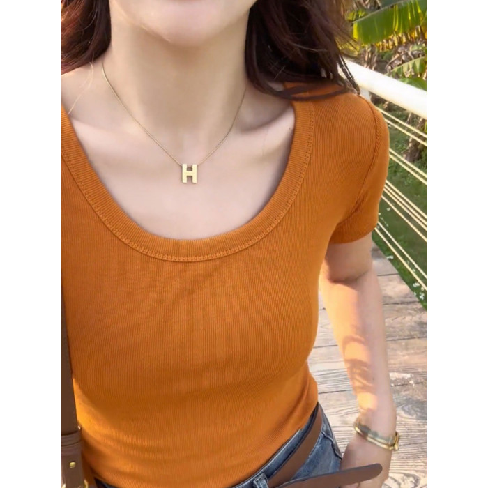 歐貨低領螺紋短袖上衣女修身百搭洋氣顯瘦緊身爆款U領鎖骨t恤女夏