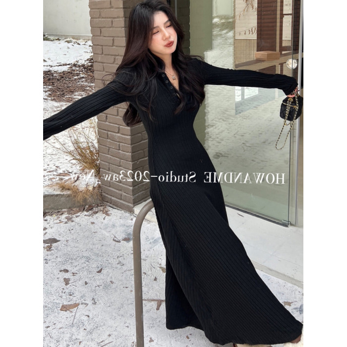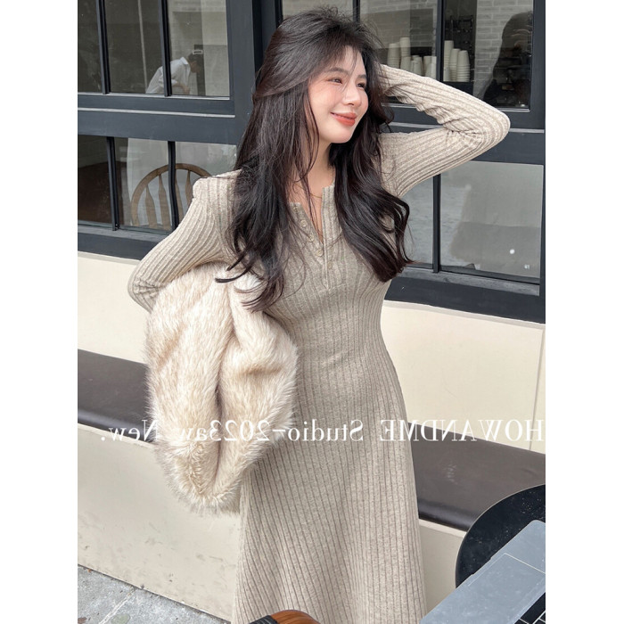 赫本風針織連衣裙女秋冬新款配大衣修身顯瘦打底內搭包臀過膝長裙