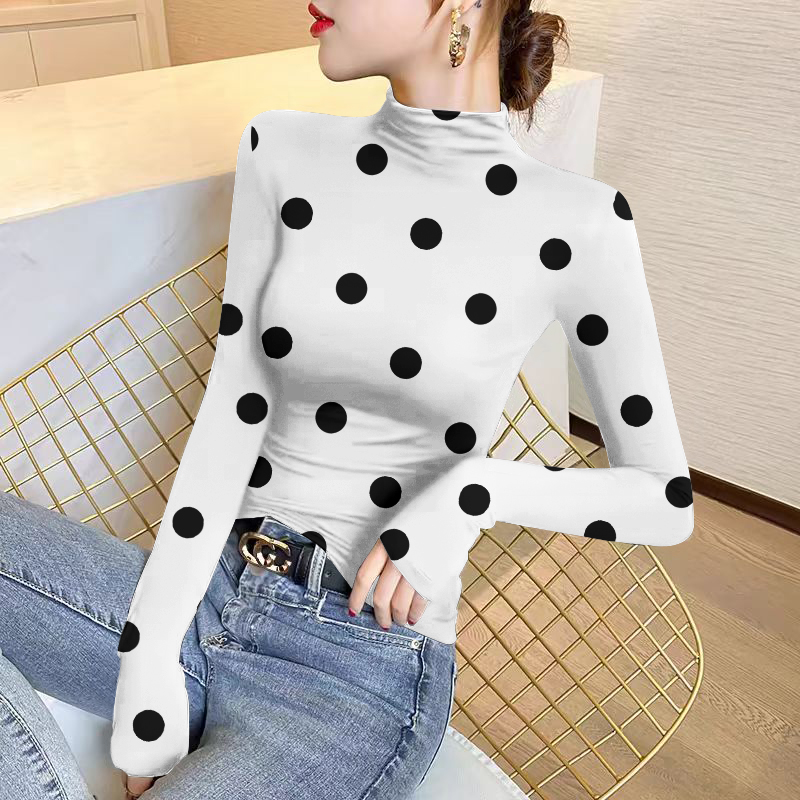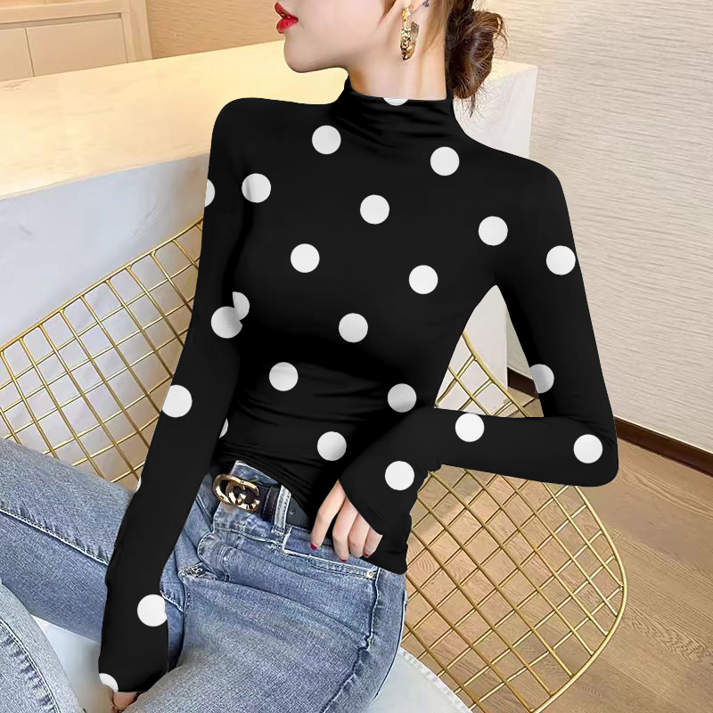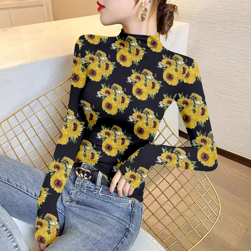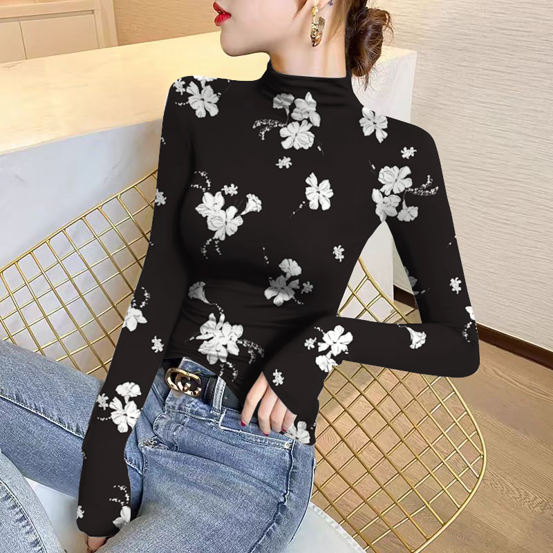 保暖德絨半高領長袖t恤女士秋冬修身顯瘦印花打底衫加絨加厚上衣