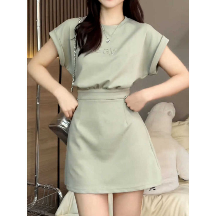 設計感字母浮雕短袖連衣裙夏季新款大碼胖mm收腰顯瘦別致短款裙子