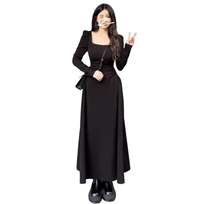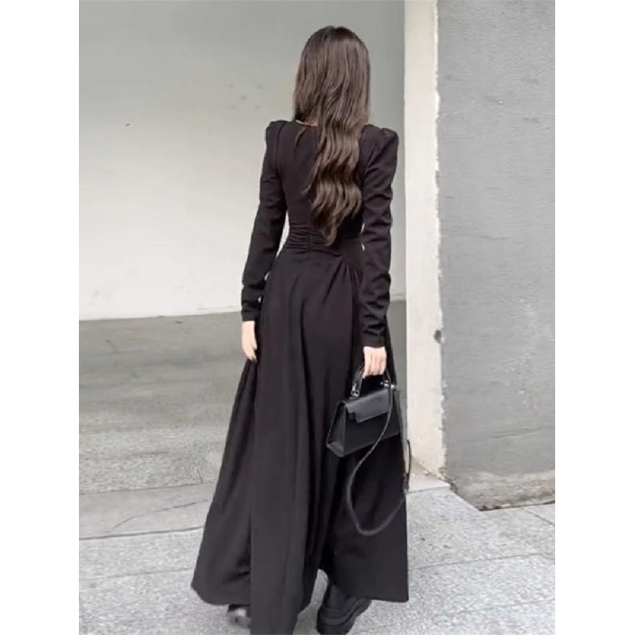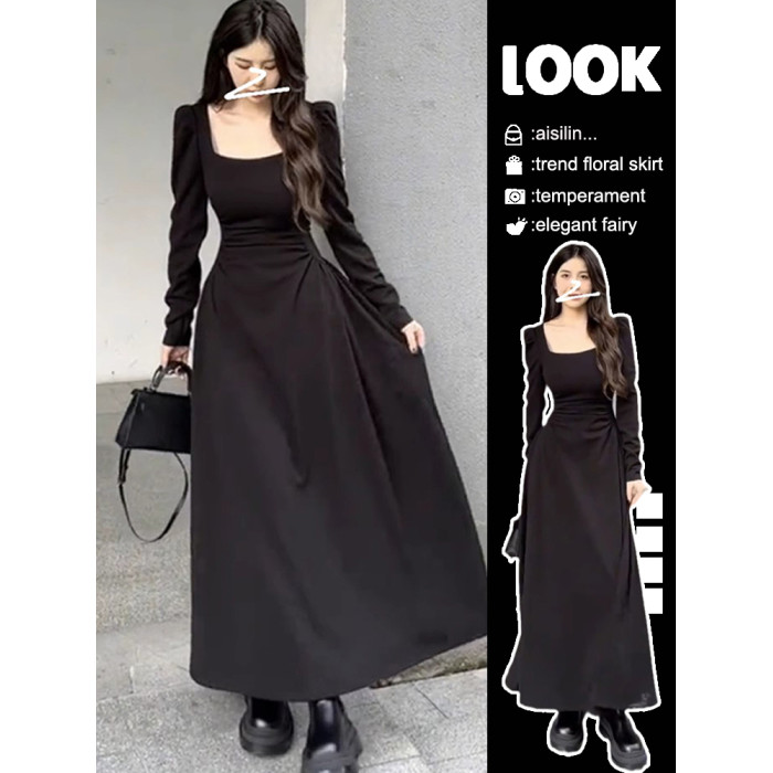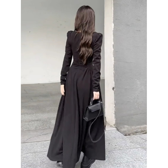 法式高級感黑色長袖連衣裙子女秋冬季2025新款小個子收腰方領長裙