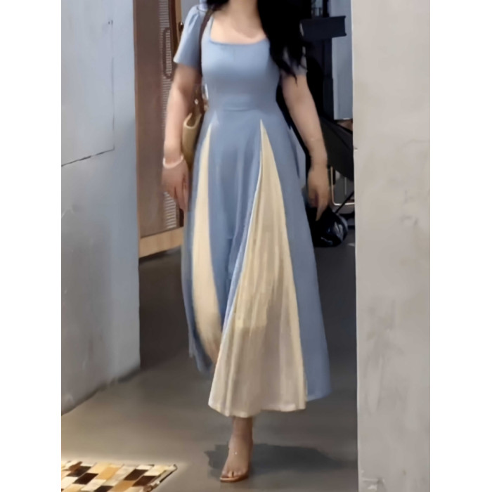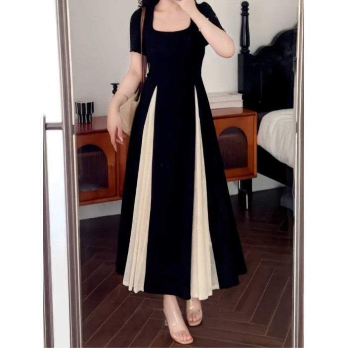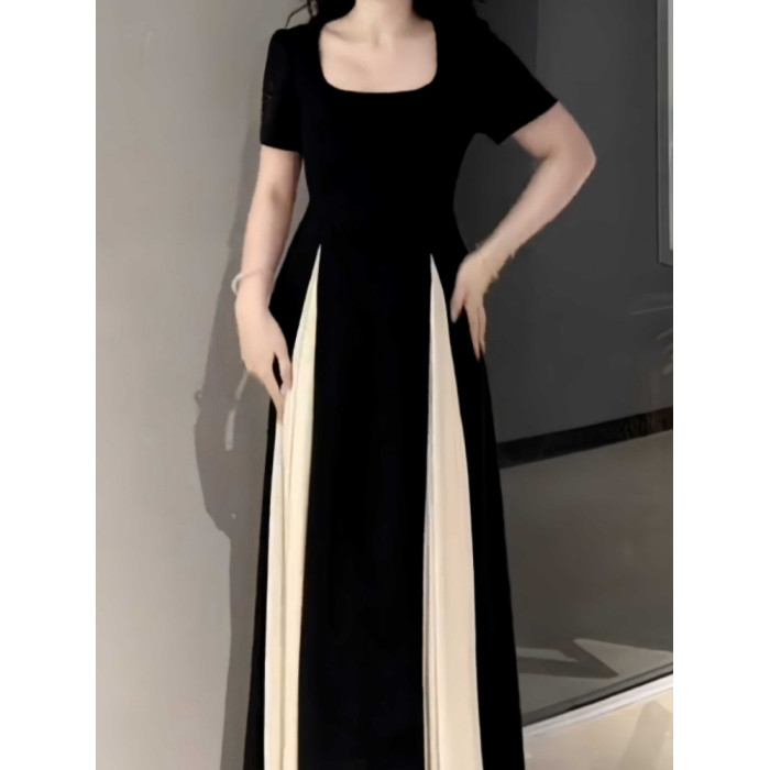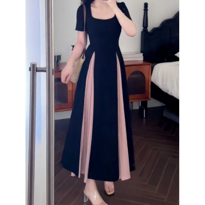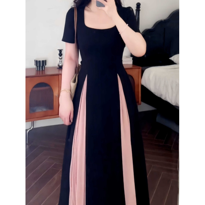 大碼法式網紗拼接別致連衣裙女夏季2025新款胖mm收腰氣質小黑裙子