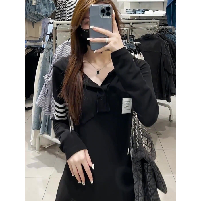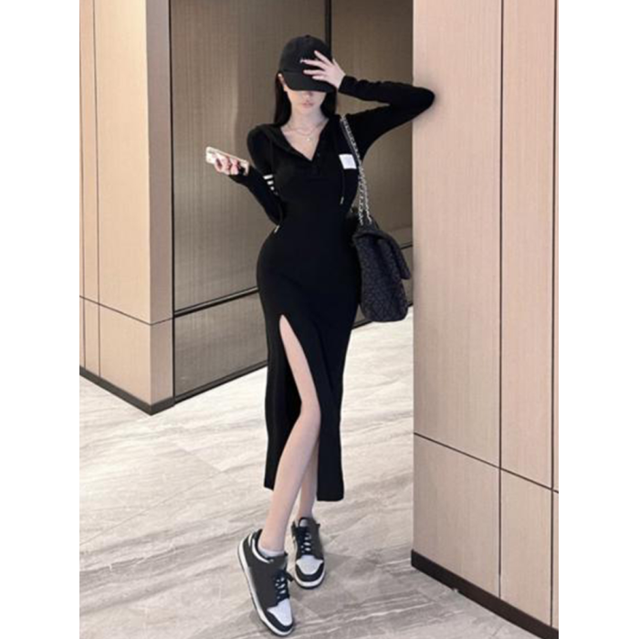 黑色v領連帽開叉連衣裙女春秋季新款辣妹性感修身顯瘦中長款裙子
