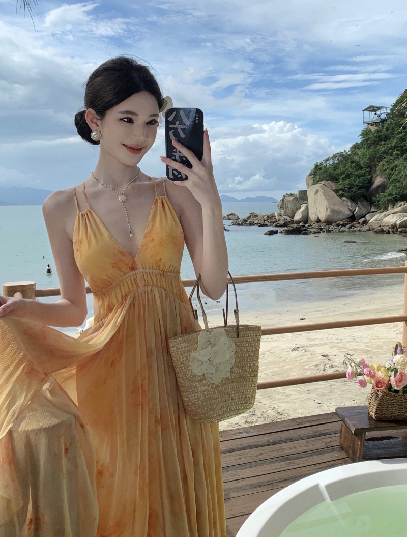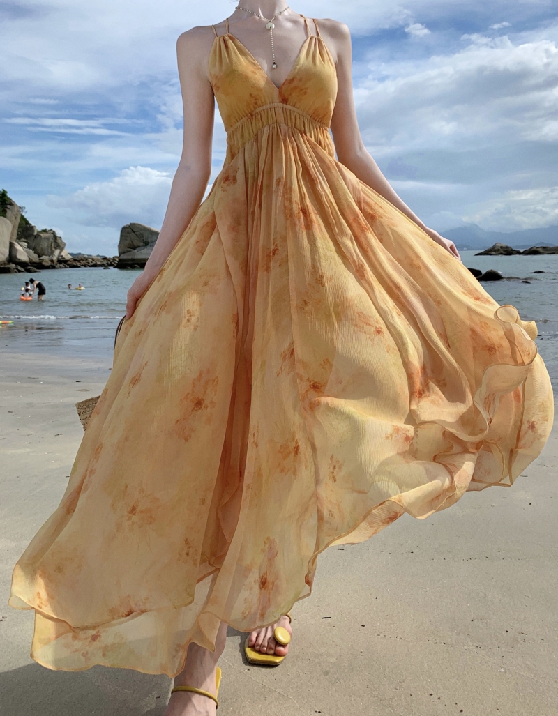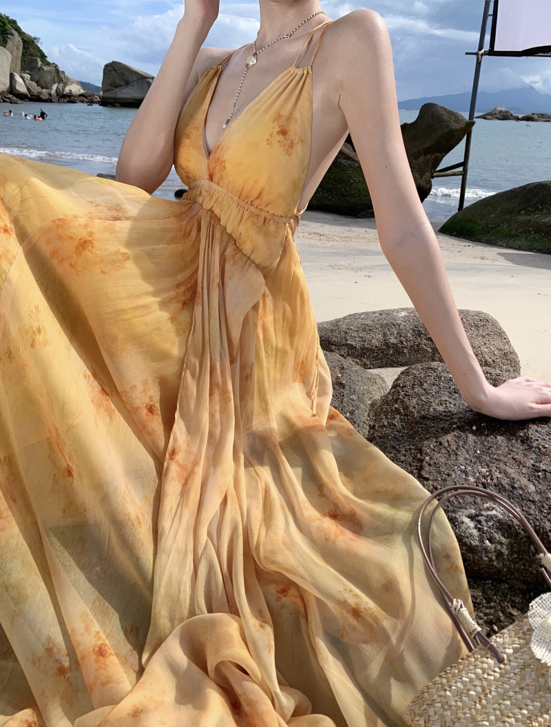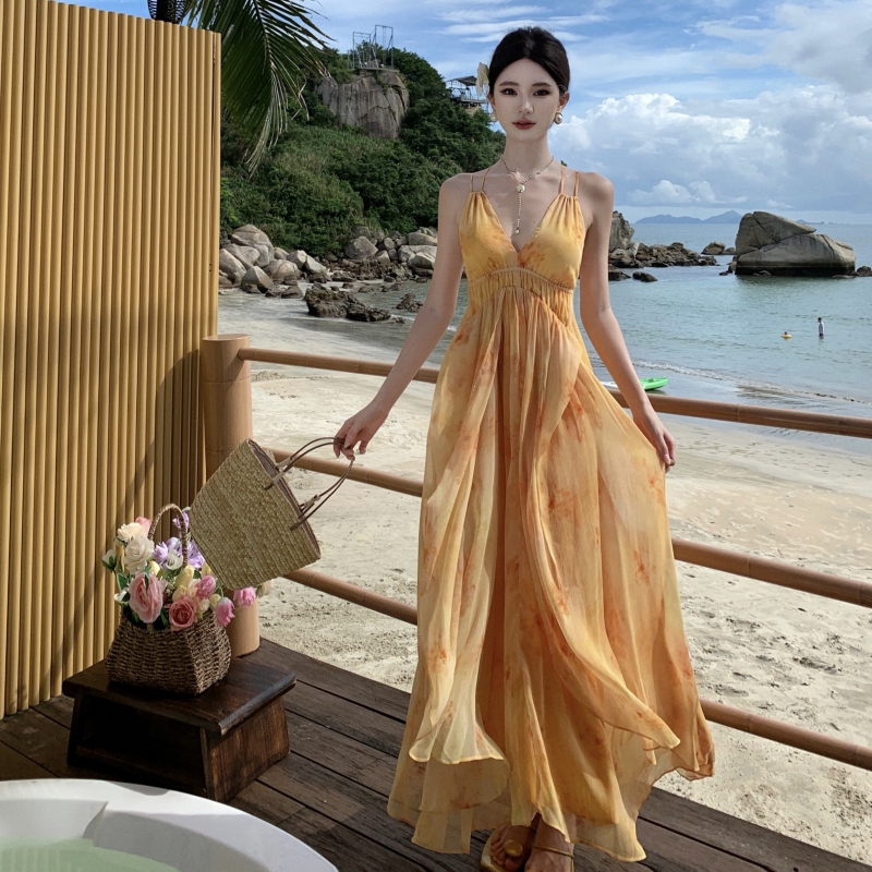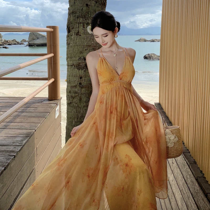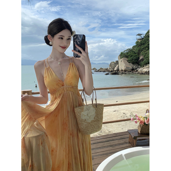 法式復古油畫暈染v領吊帶連衣裙女夏海邊度假長裙溫柔氣質仙女裙
