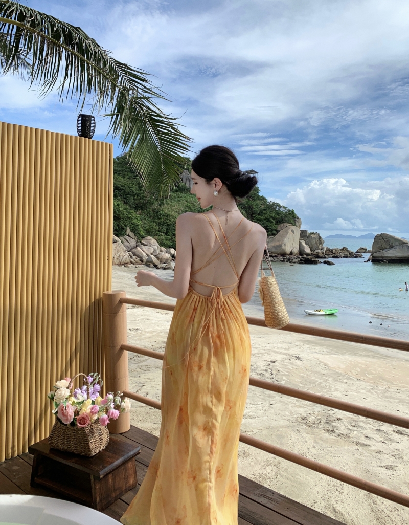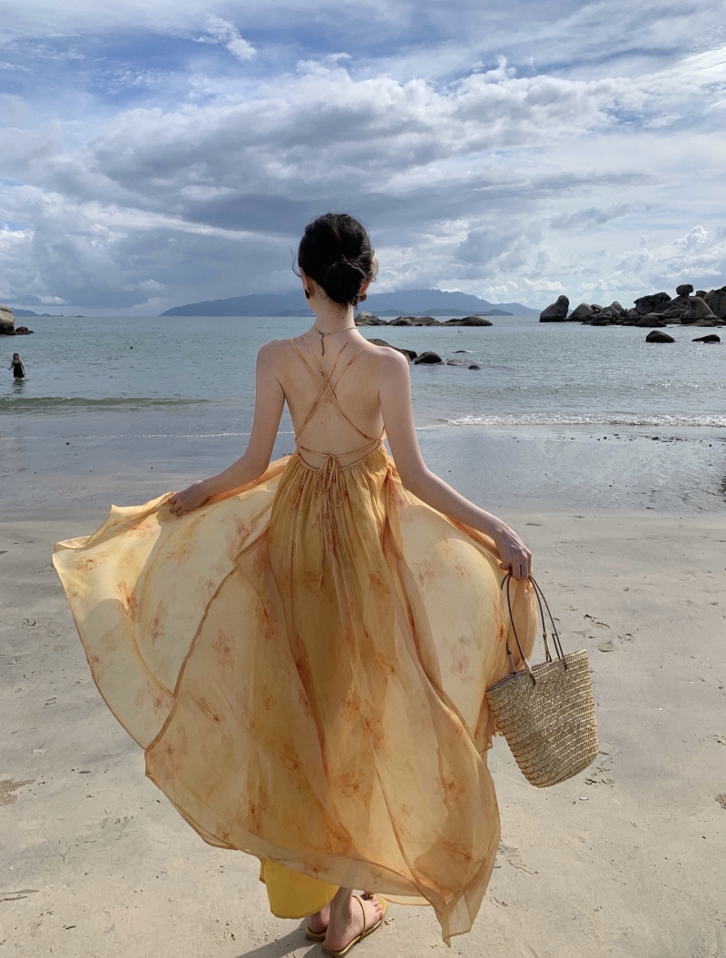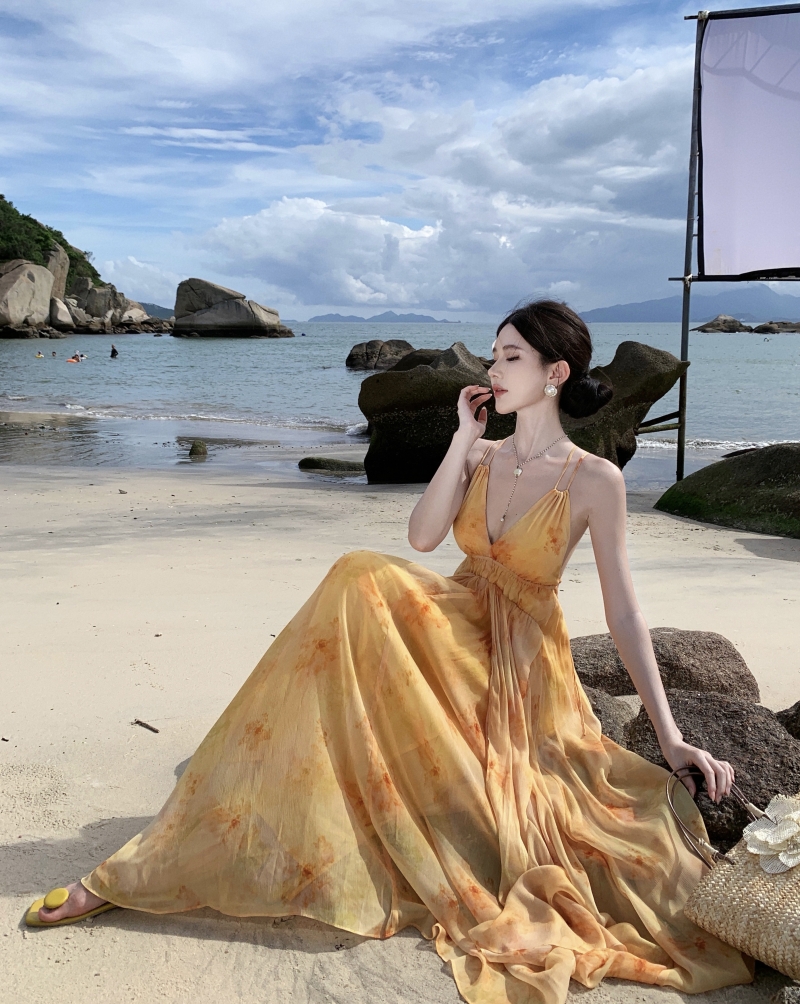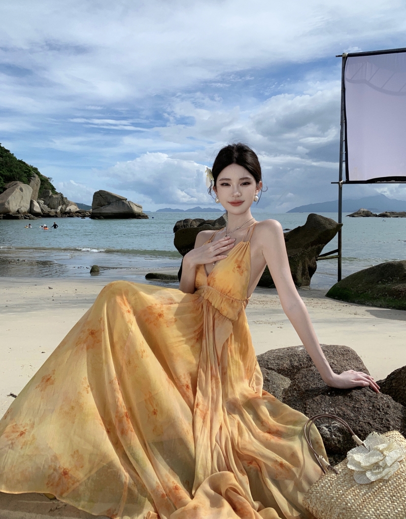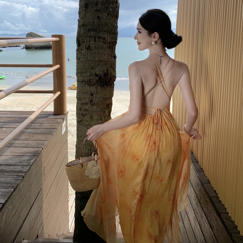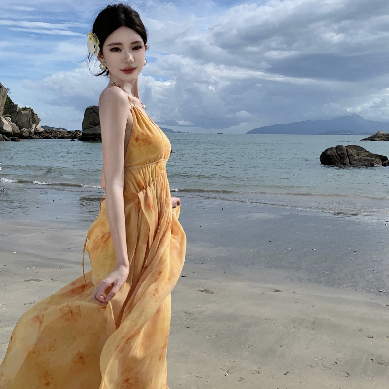法式復古油畫暈染v領吊帶連衣裙女夏海邊度假長裙溫柔氣質仙女裙