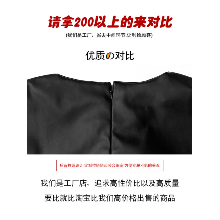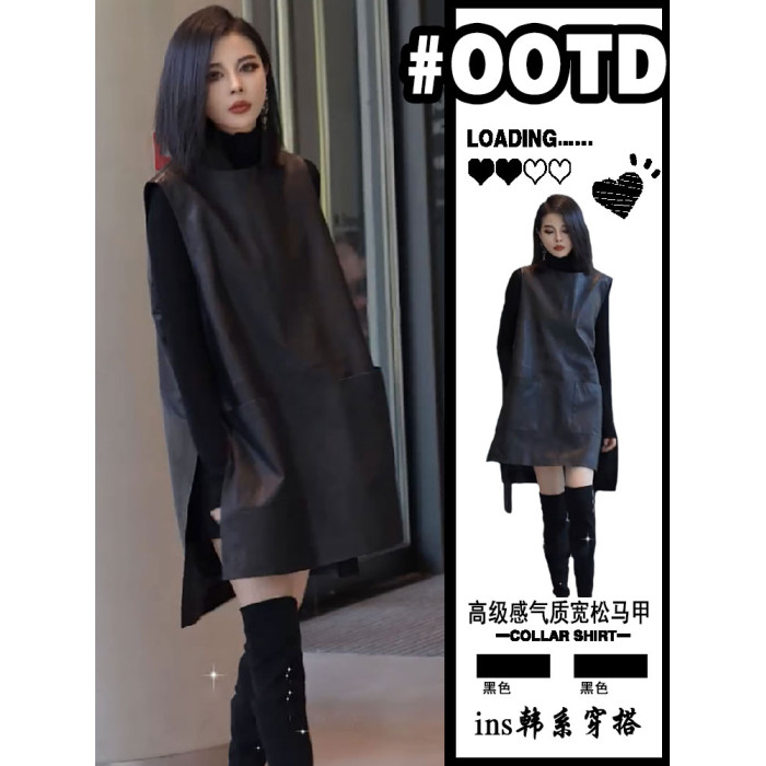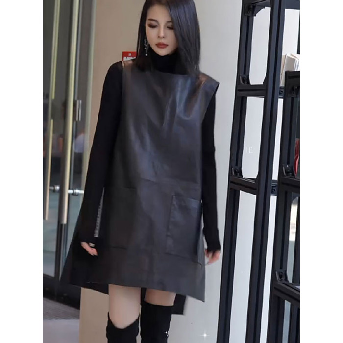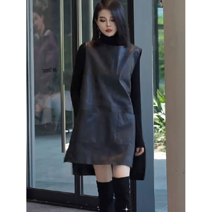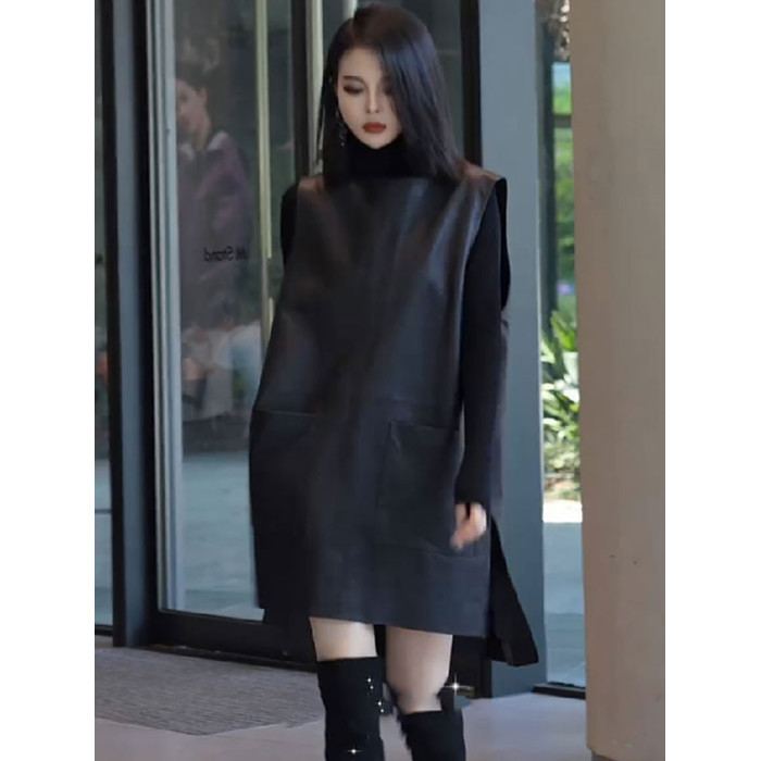 歐貨黑色pu皮無袖背心連衣裙2025新款春秋款曡穿馬甲裙開叉中長裙