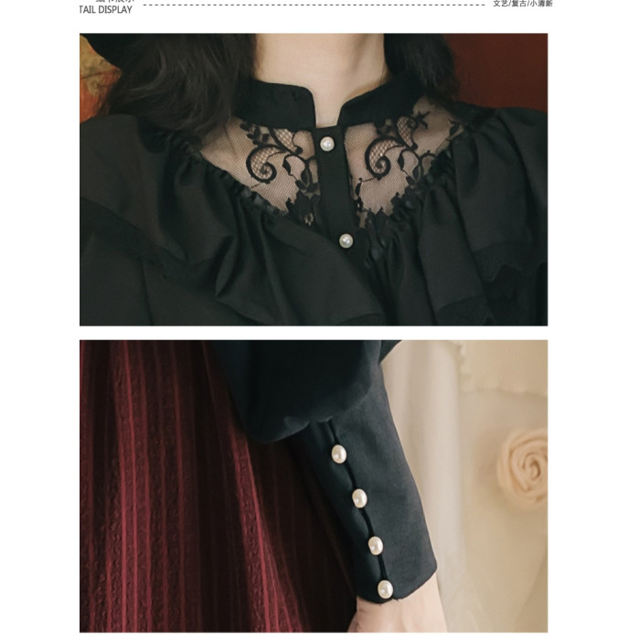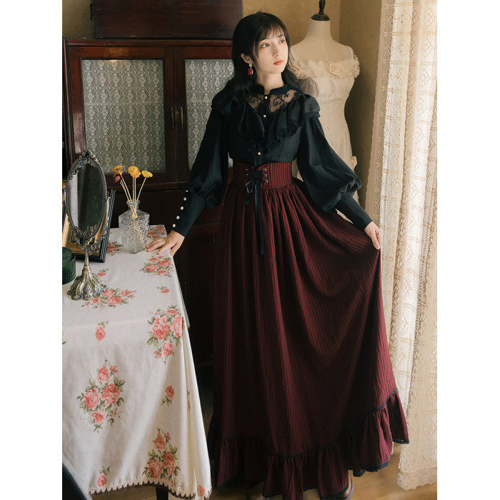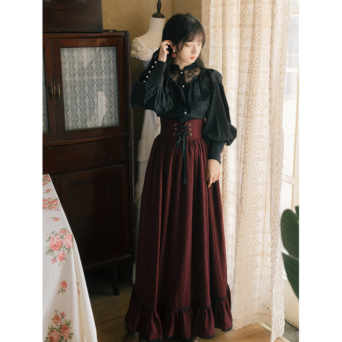 法式歐式宮廷復古長袖蕾絲襯衫條紋長裙兩件套連衣裙暗黑系Lolita