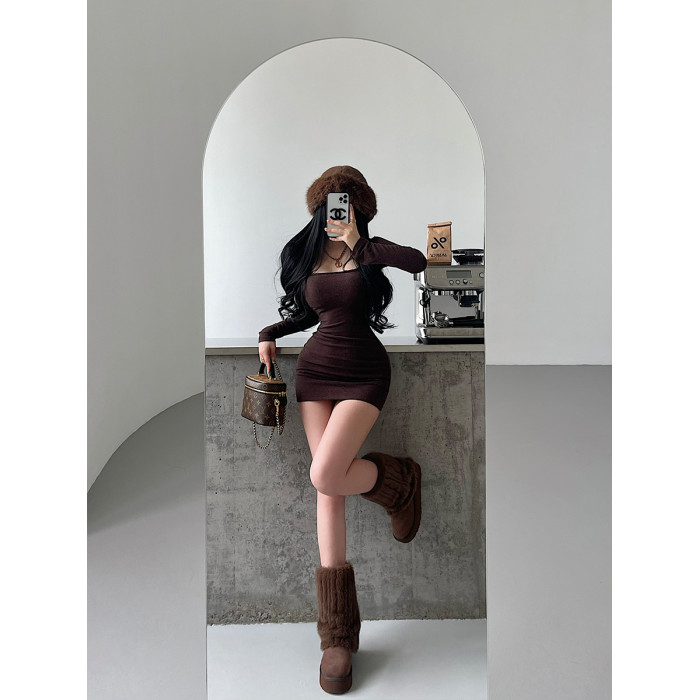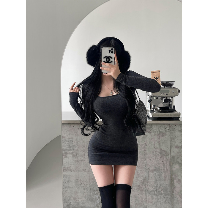 YoungGirlDay純欲性感方領修身顯瘦德絨長袖包臀連衣裙短裙含胸墊
