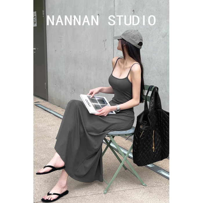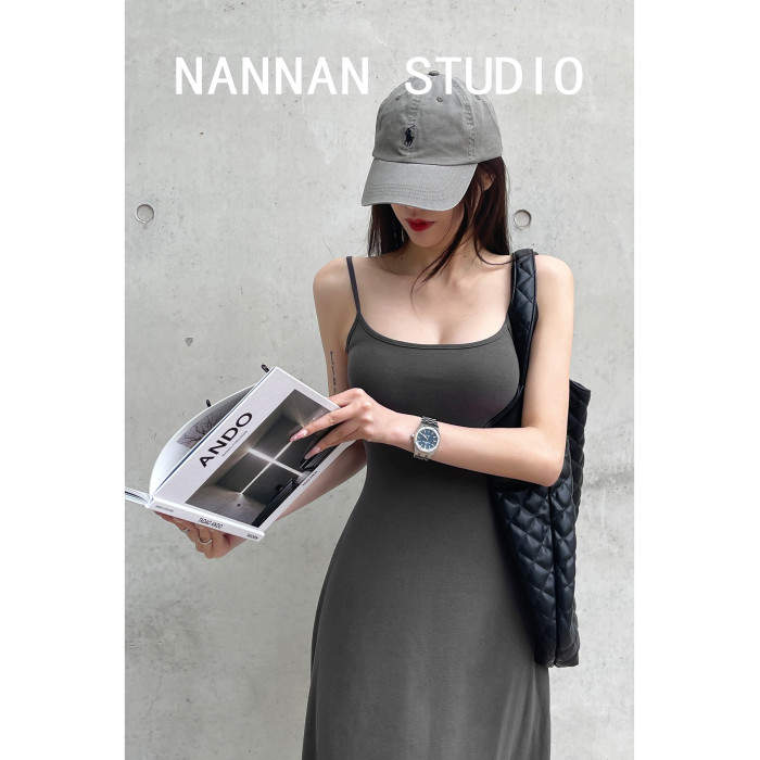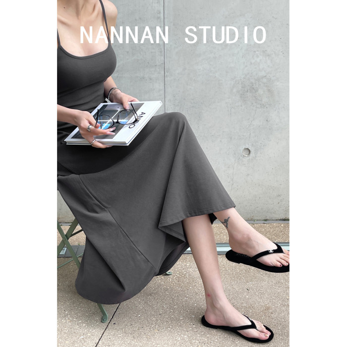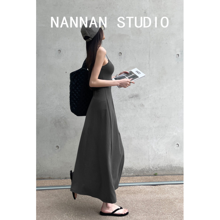 美式時髦出街簡約休閒大裙擺吊帶連衣裙女寬松春秋日常通勤長裙子