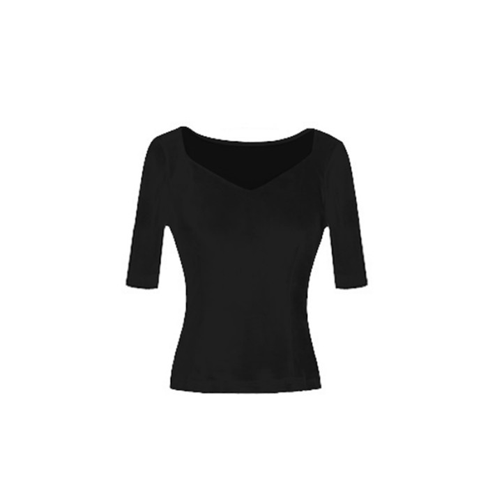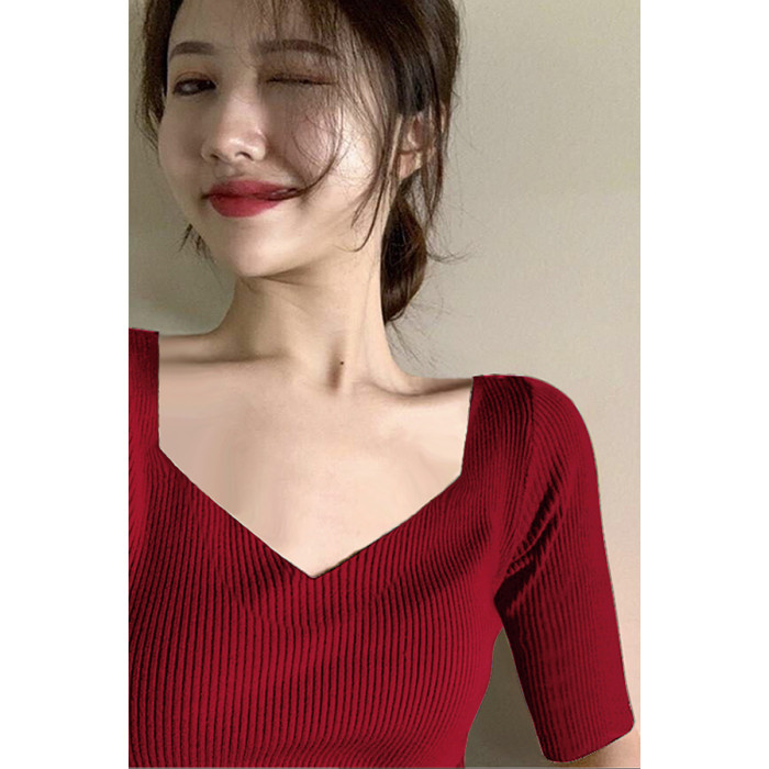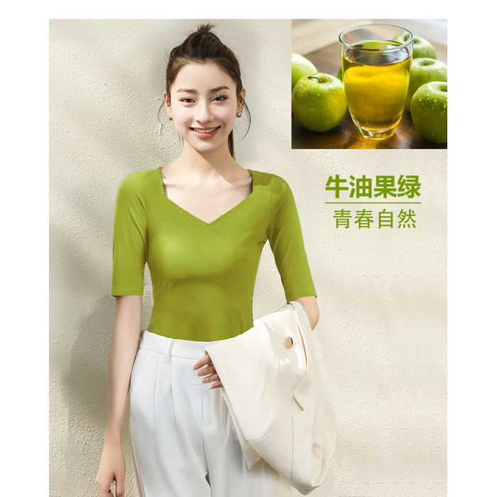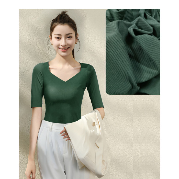 2025夏裝新款v領短袖羅紋針織t恤女修身緊身中袖打底衫上衣女