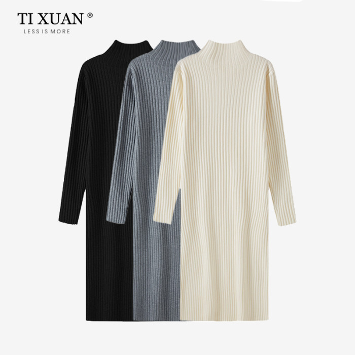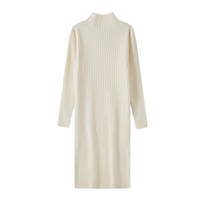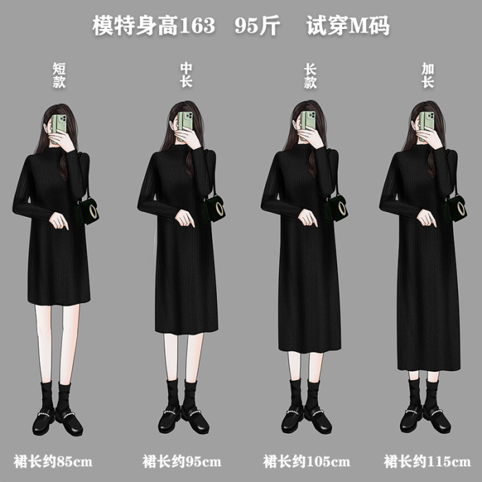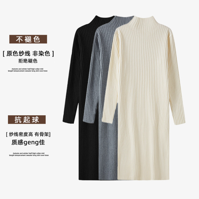 秋冬配大衣毛衣裙女半高領寬松長袖內搭中長款打底過膝針織連衣裙