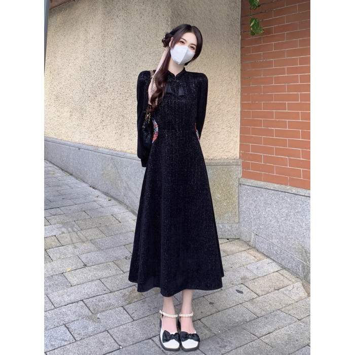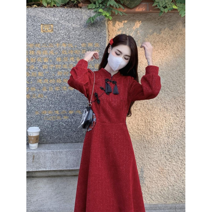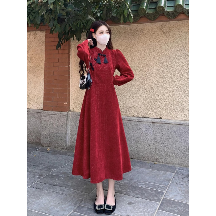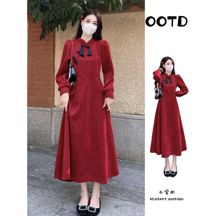 高級感國風盤釦紅色改良旗袍裙大碼胖mm新中式復古收腰顯瘦連衣裙