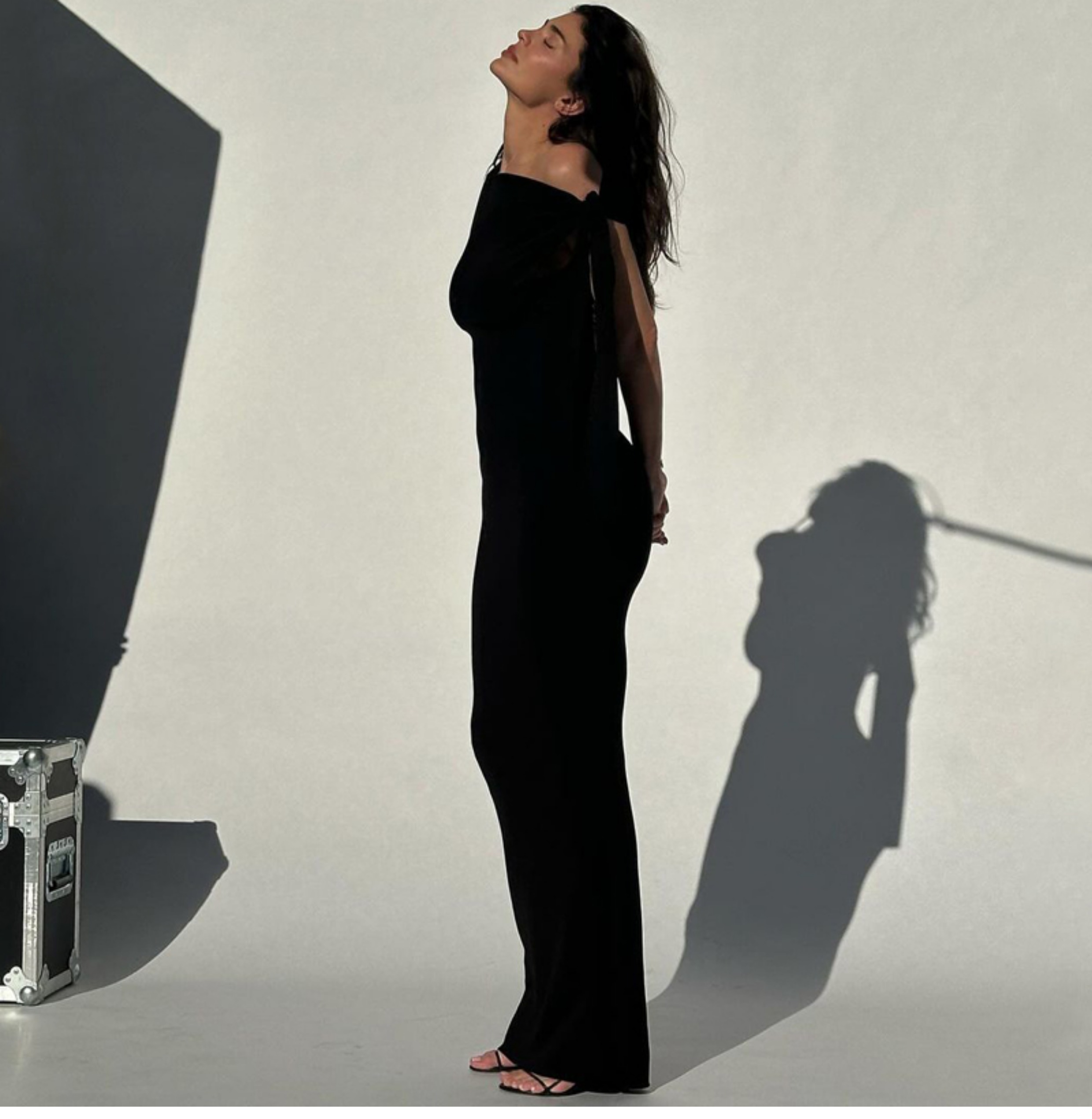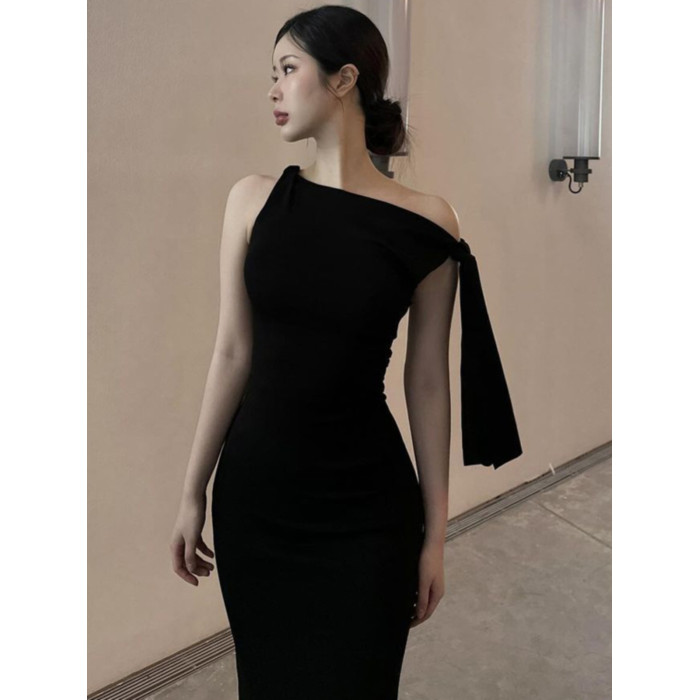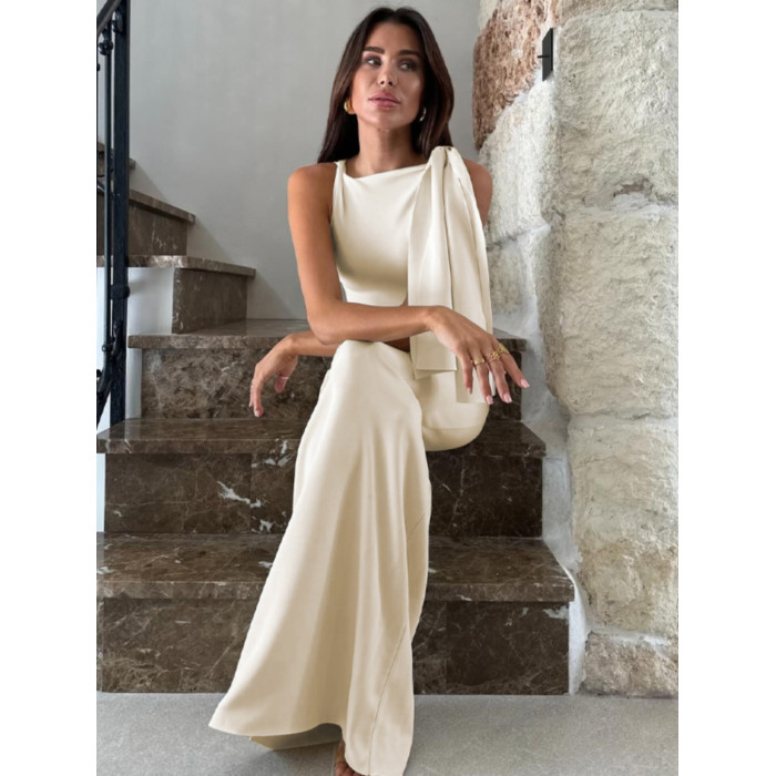 歐美風設計感綁帶露肩無袖連衣裙女夏季氣質高腰修身顯瘦過膝長裙
