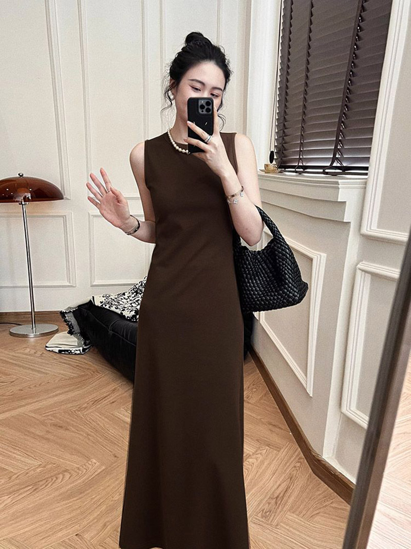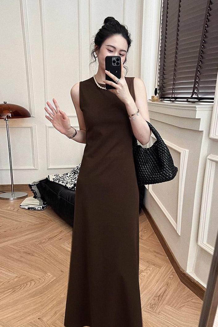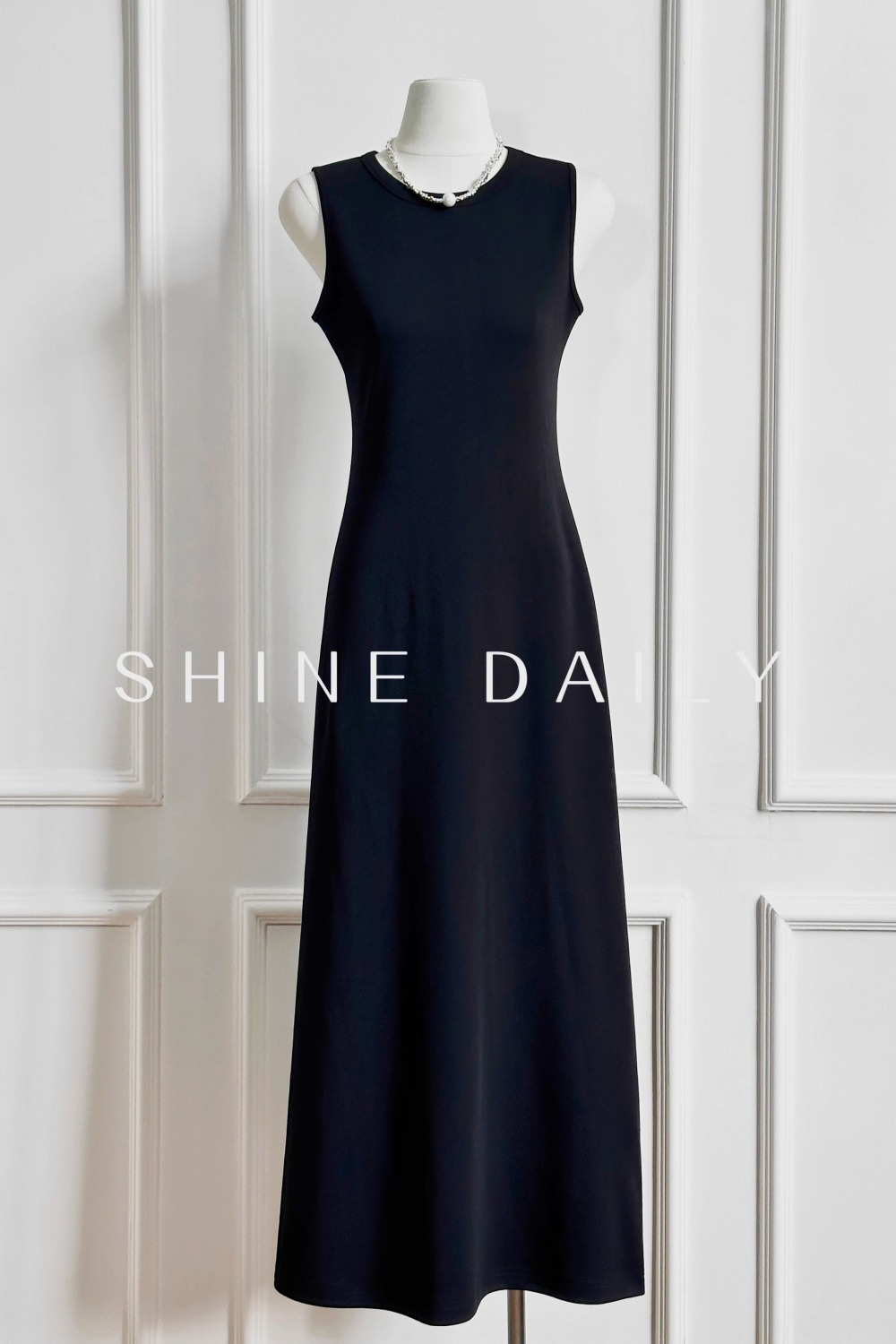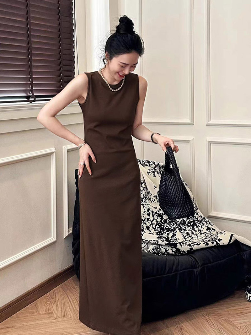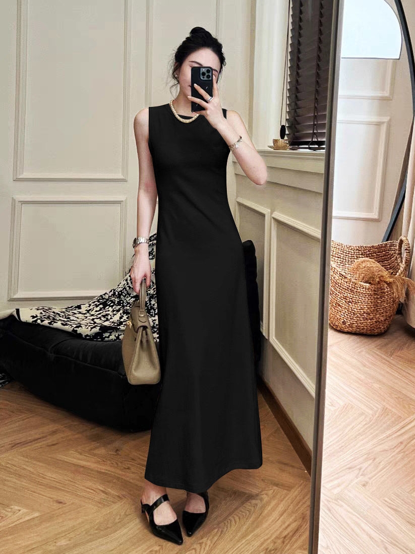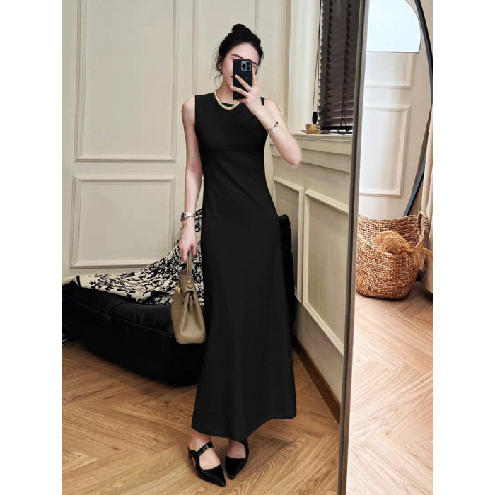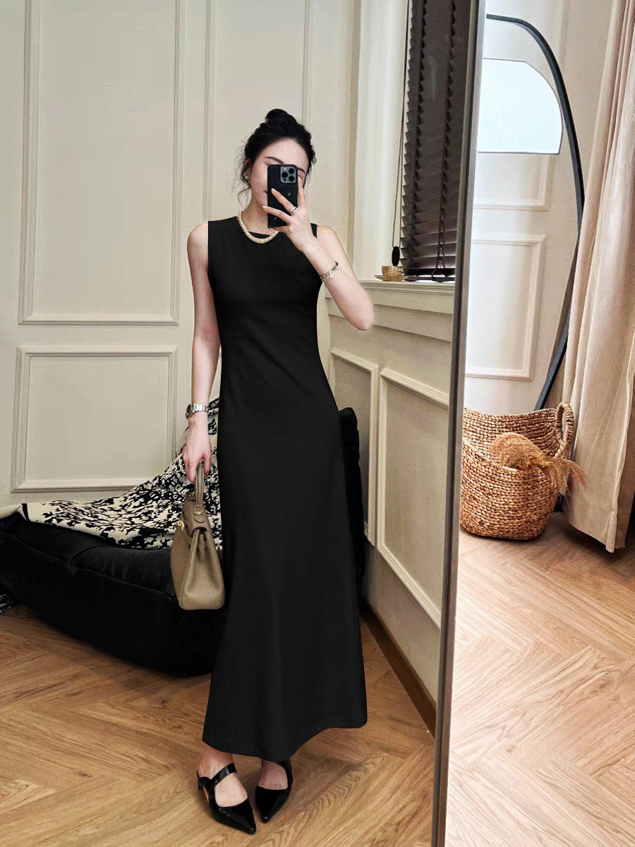 【棉羅紋高品質】法式優雅修身無袖背心式連衣裙顯瘦顯高女長裙