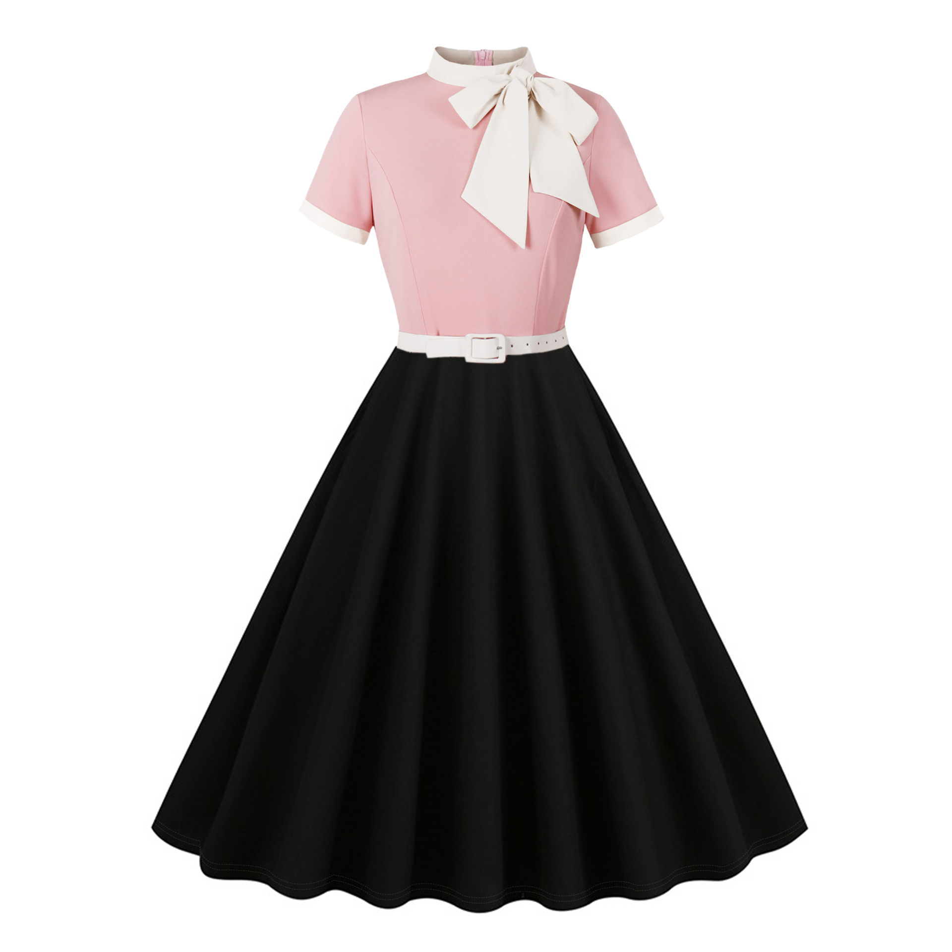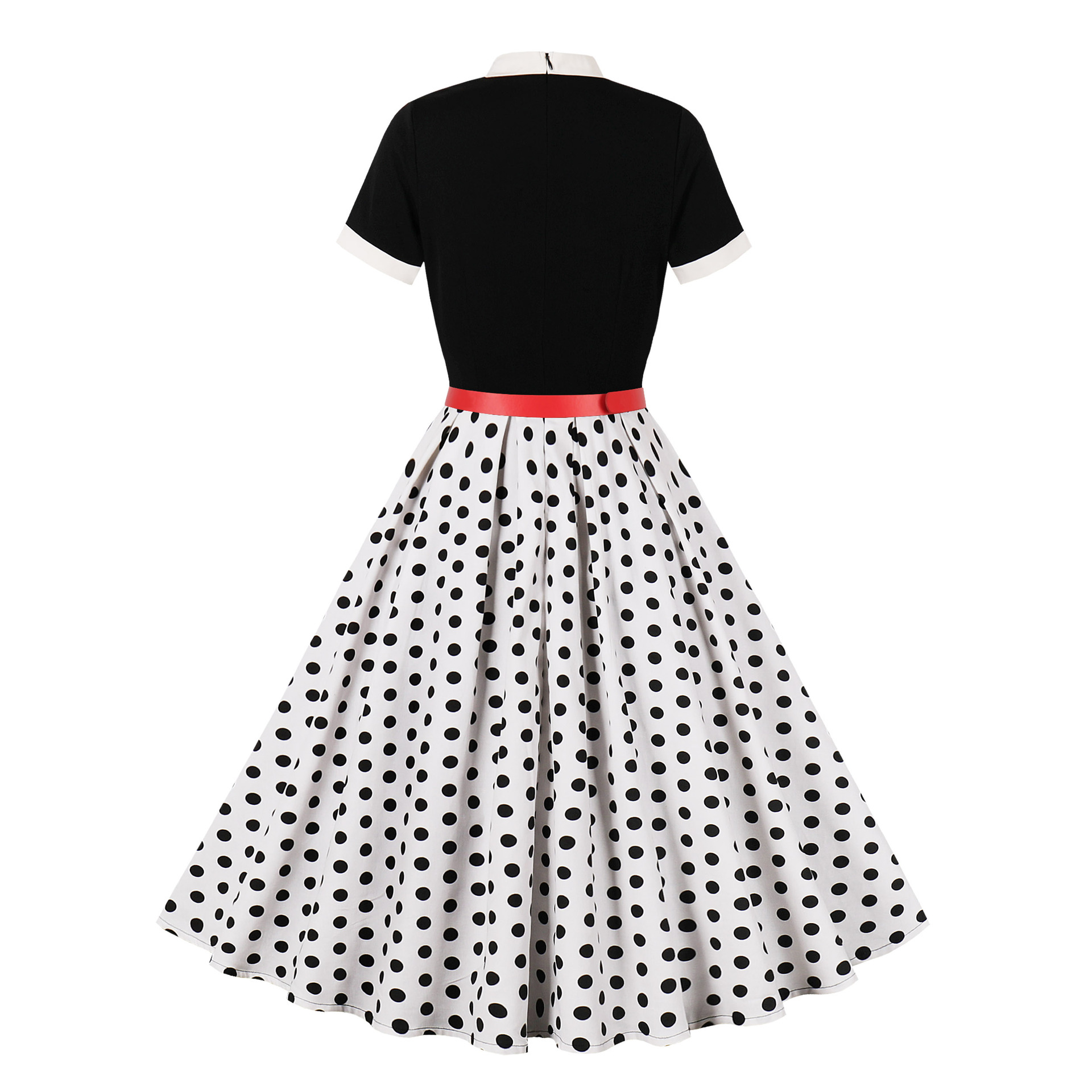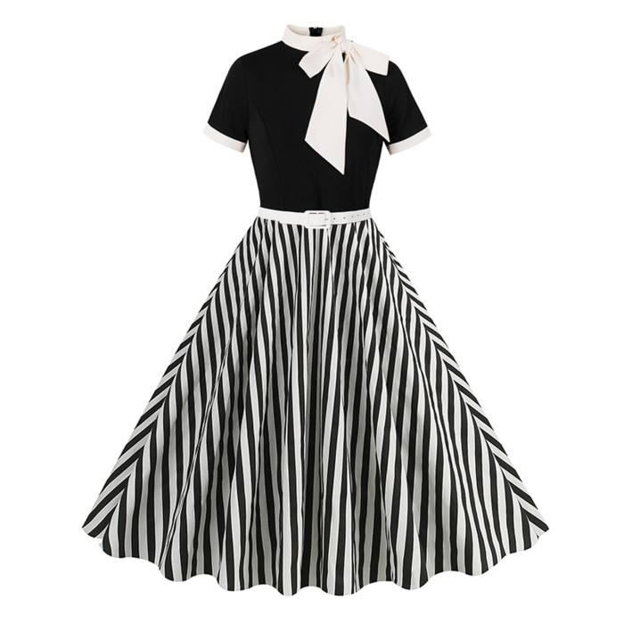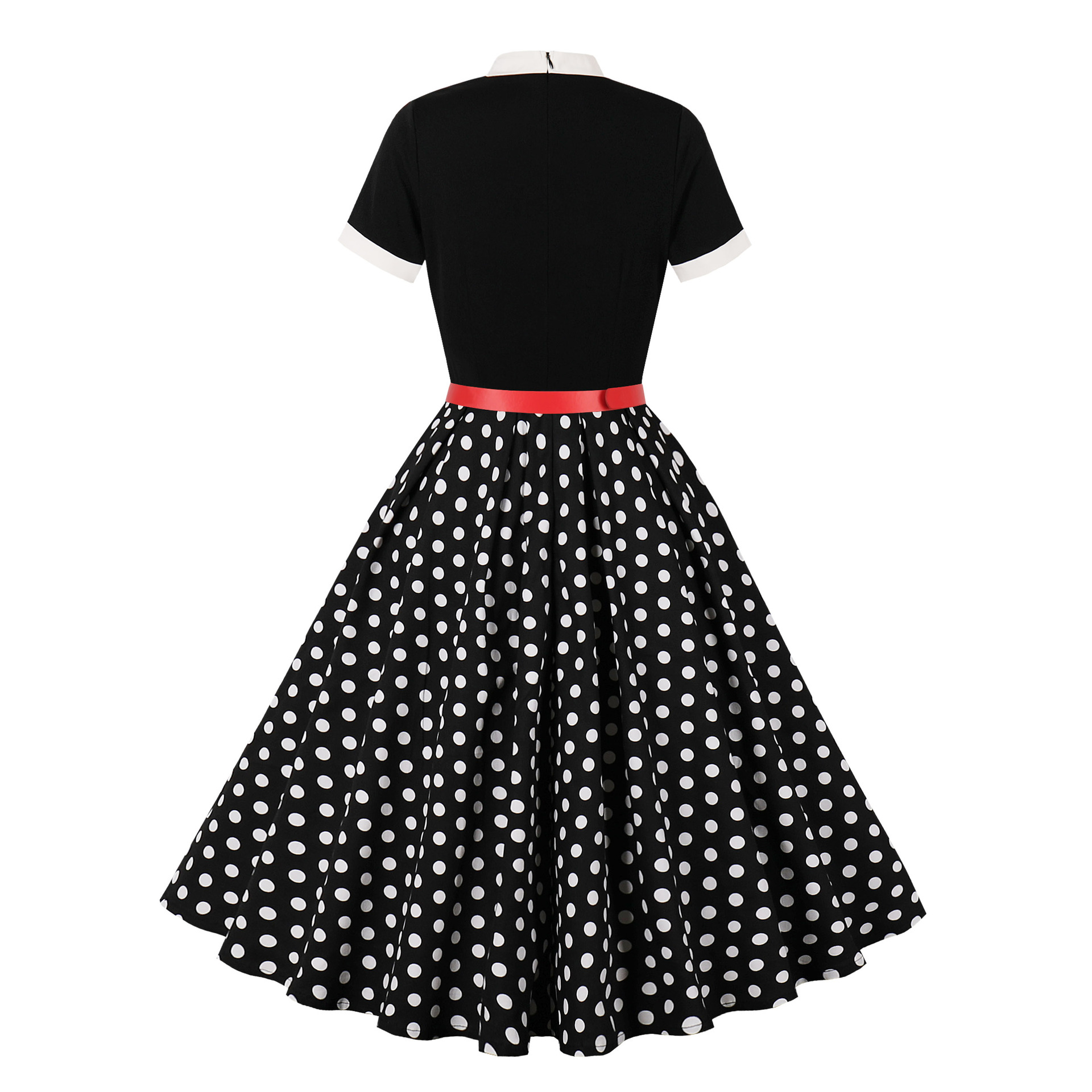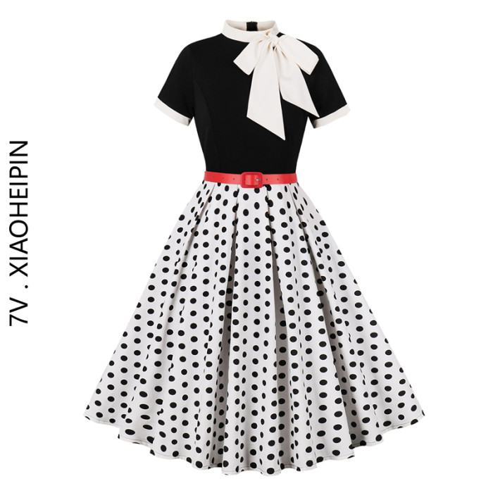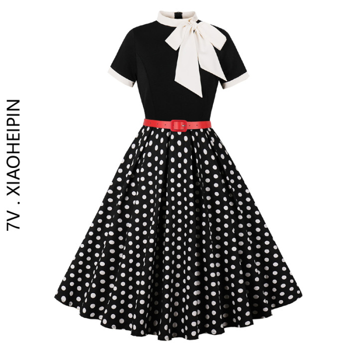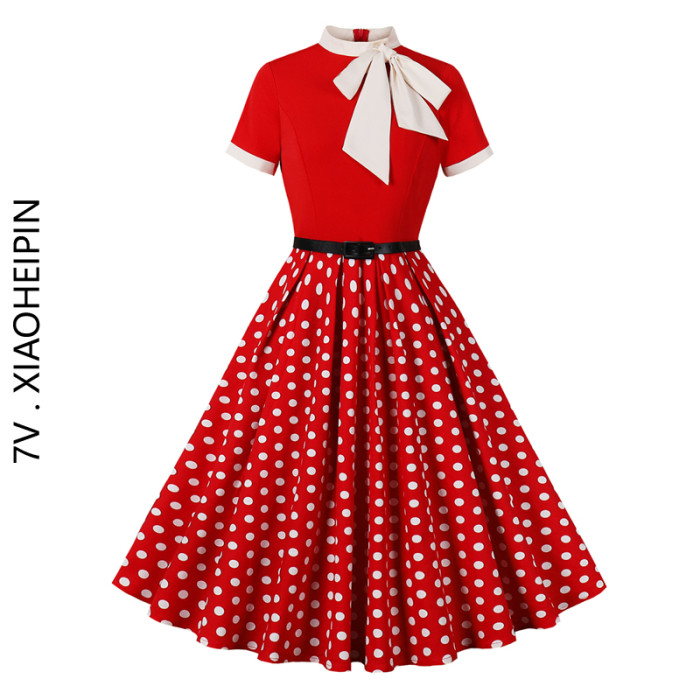 歐美懷舊復古年代赫本女裝大擺顯瘦印花綁帶蝴蝶結立領波點連衣裙