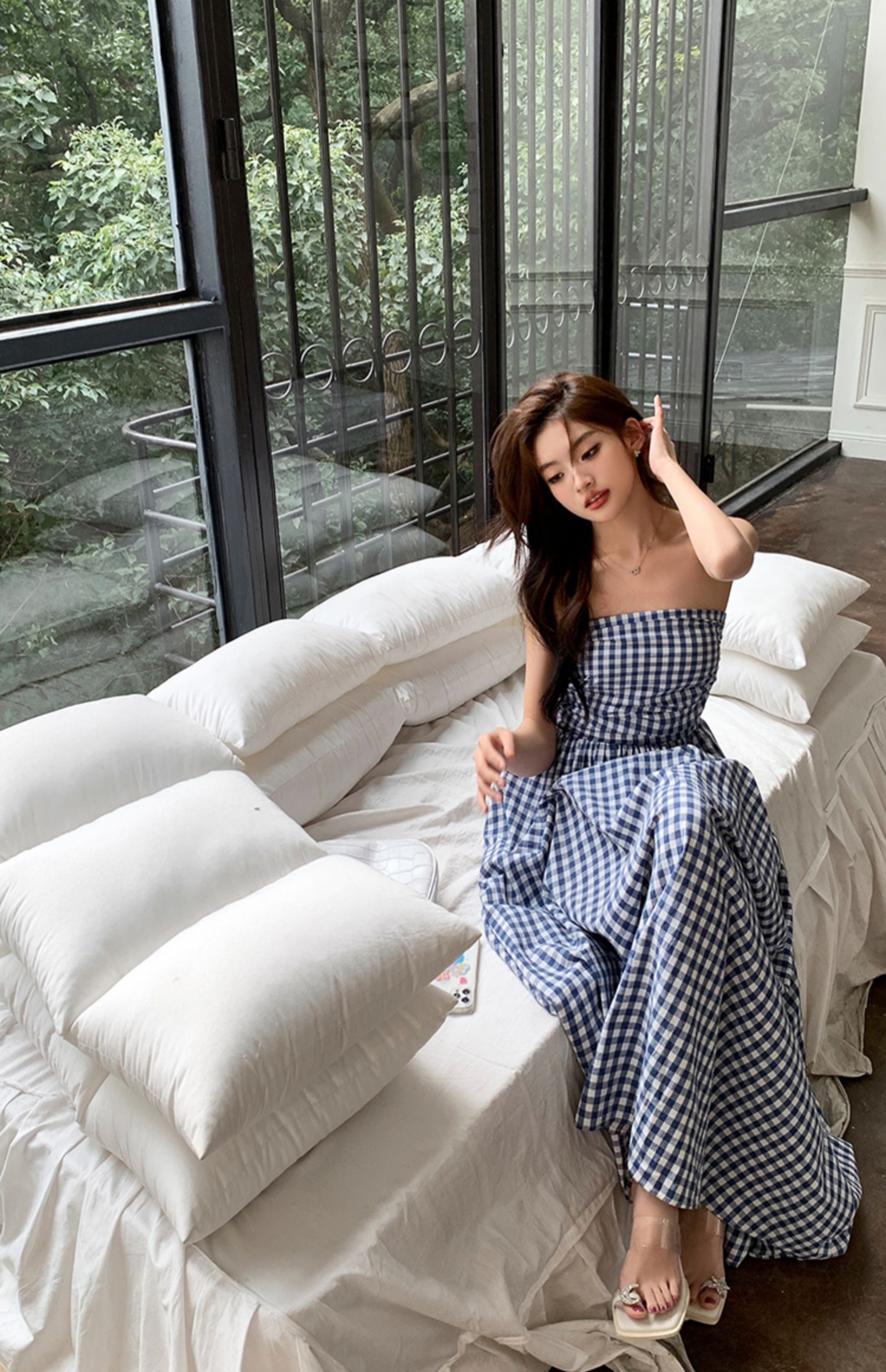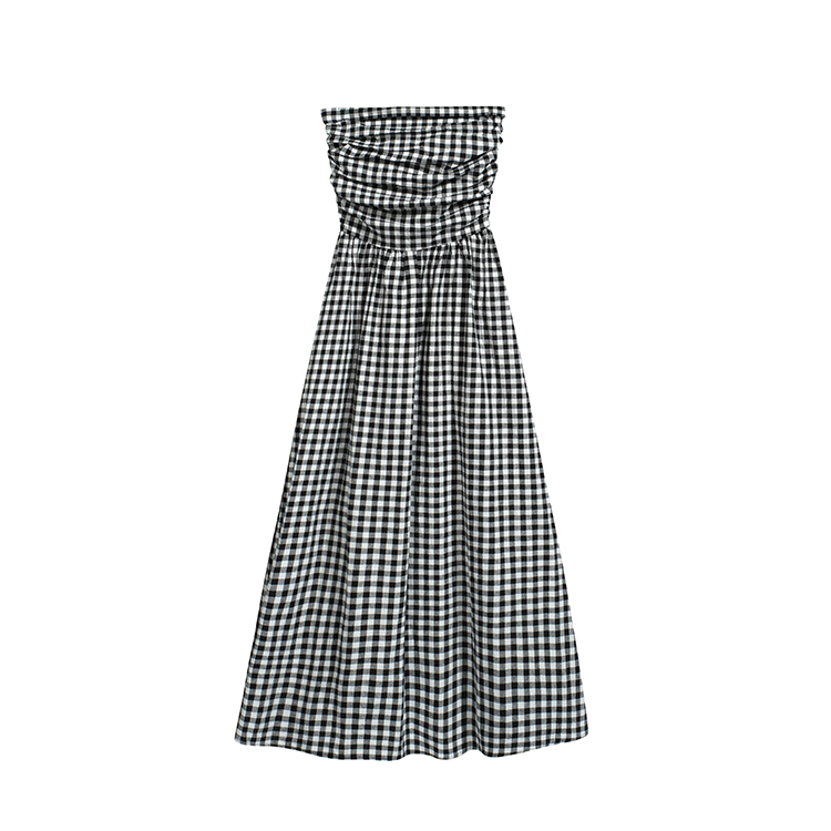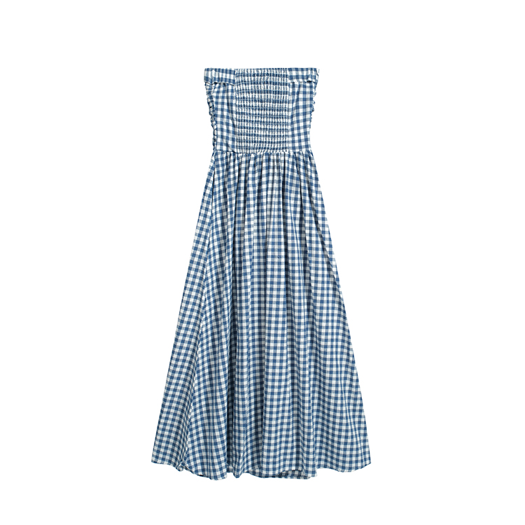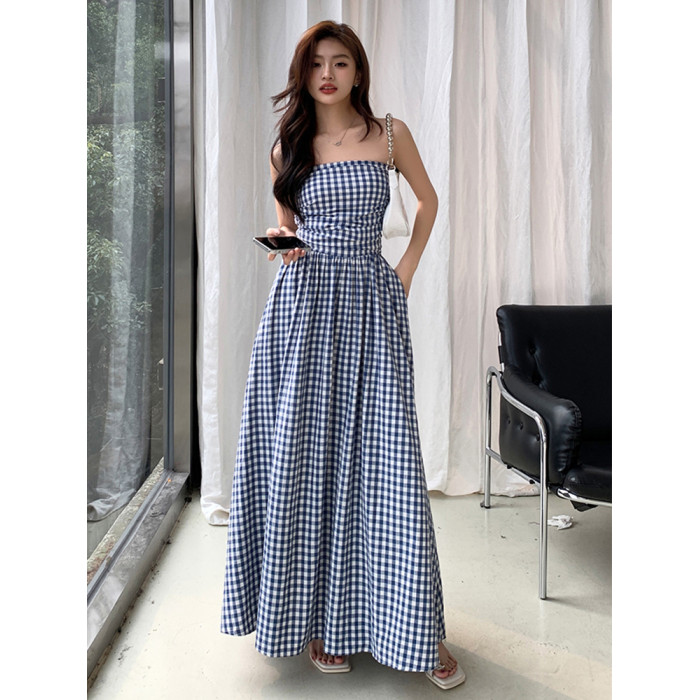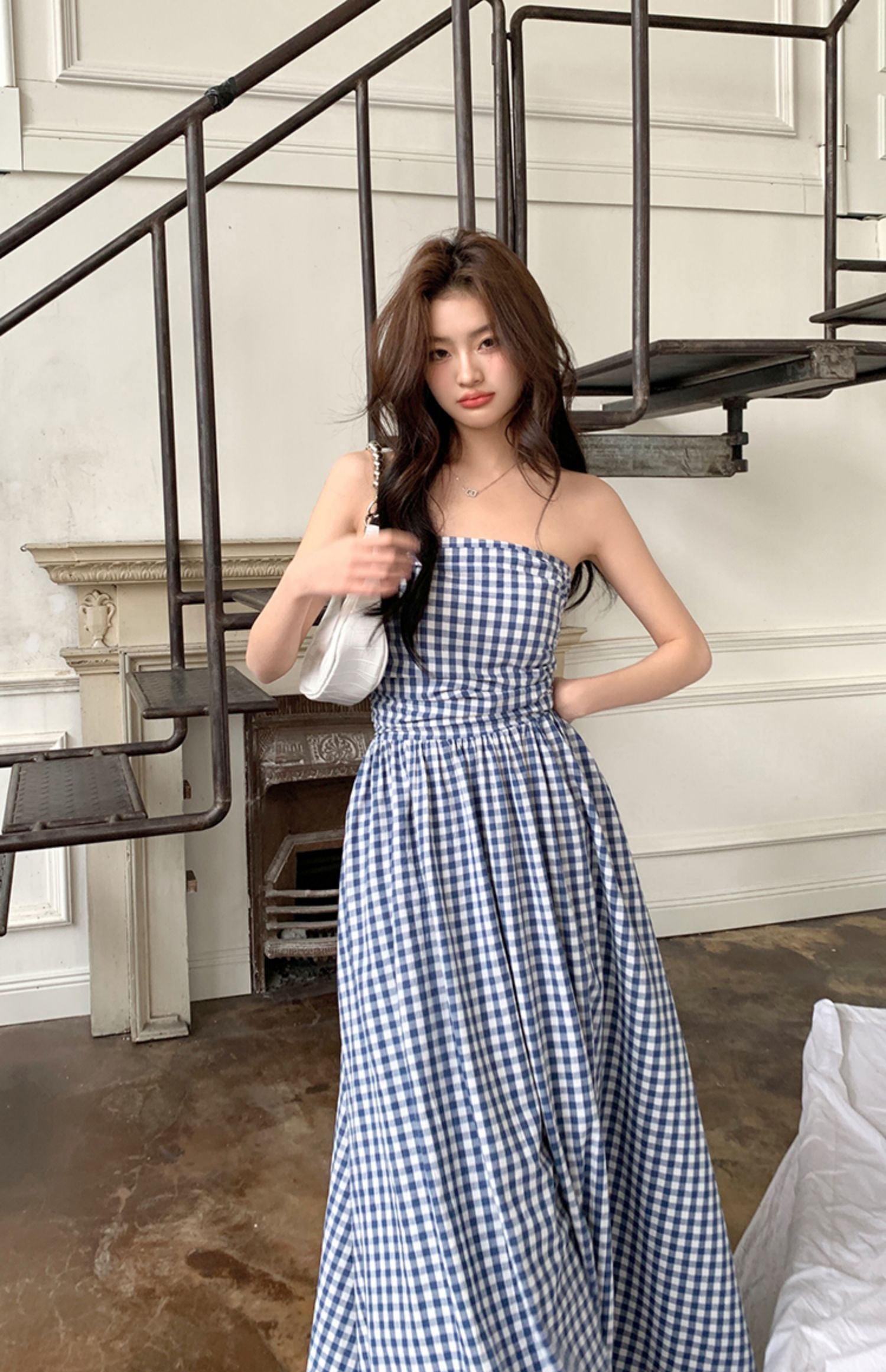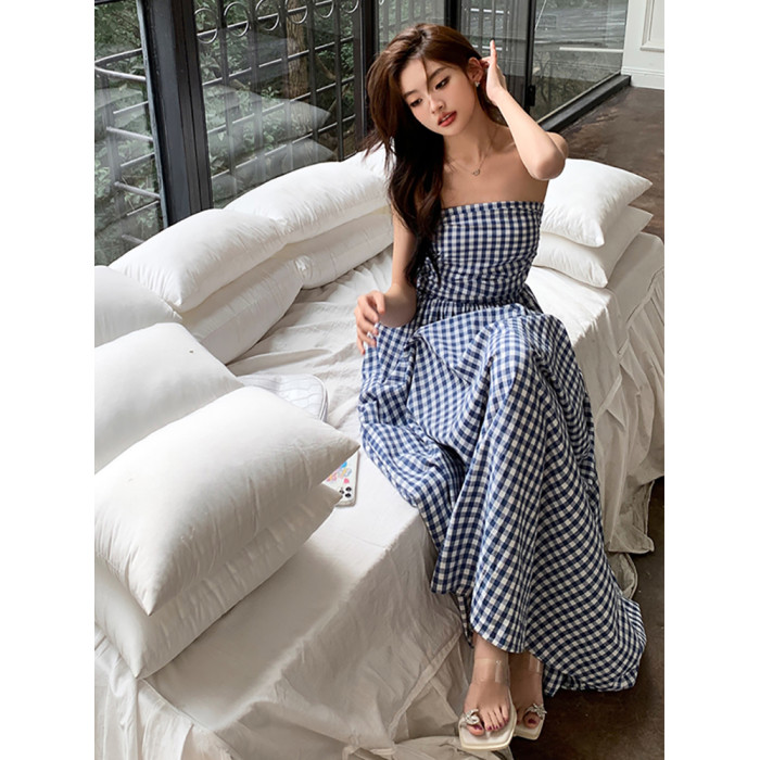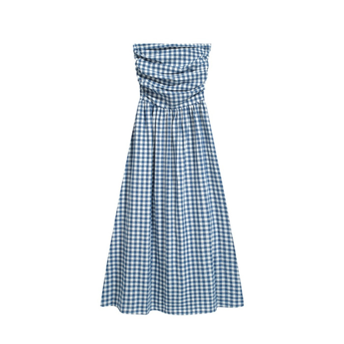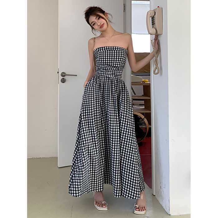格子抹胸裙一字肩連衣裙女夏季法式氣質設計感收腰海邊度假長裙子