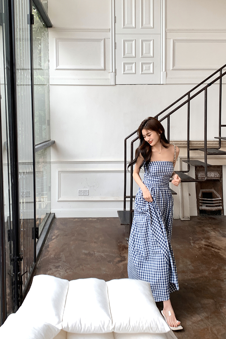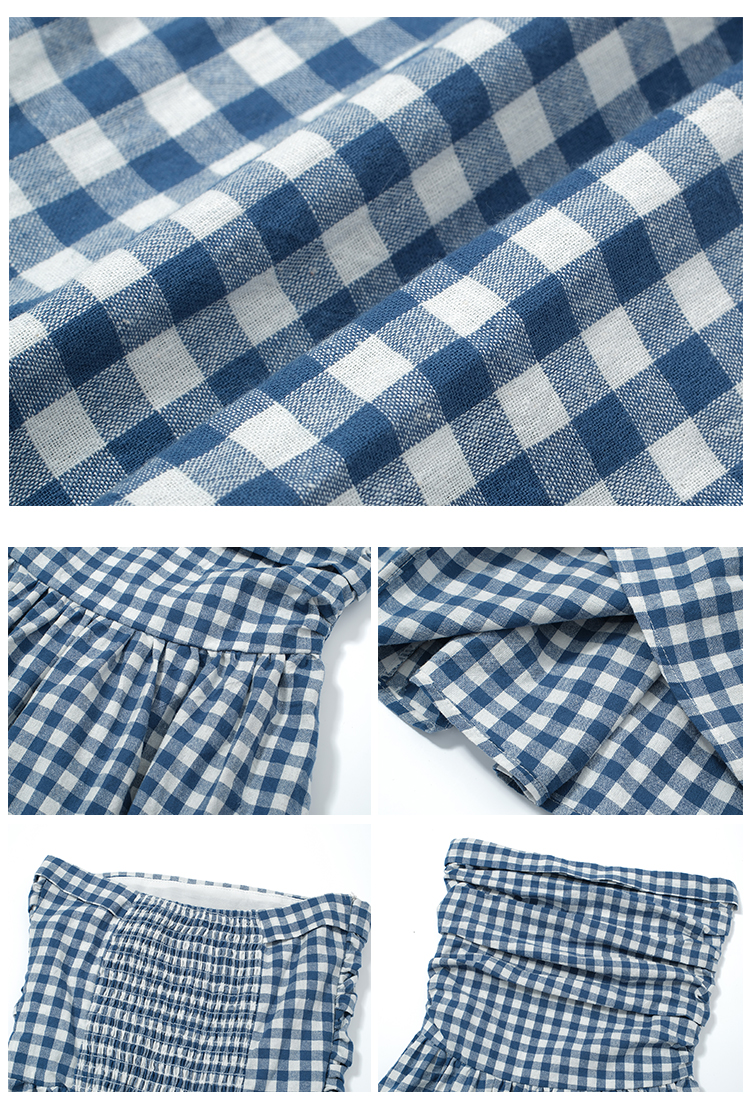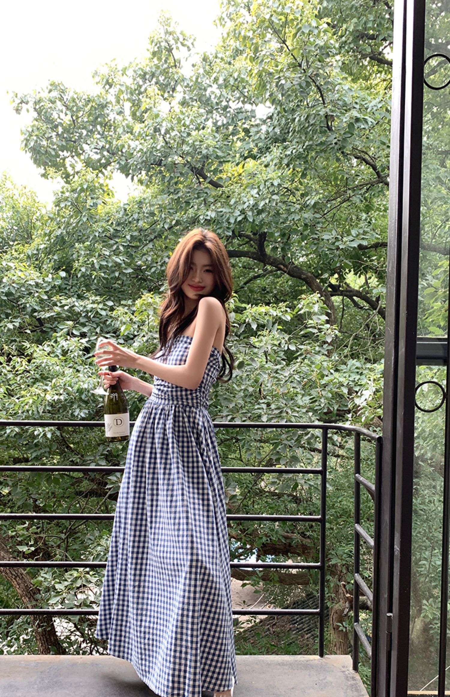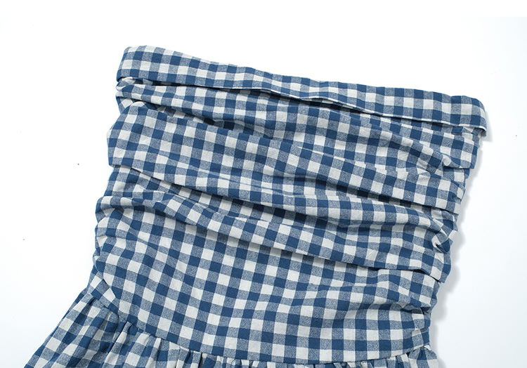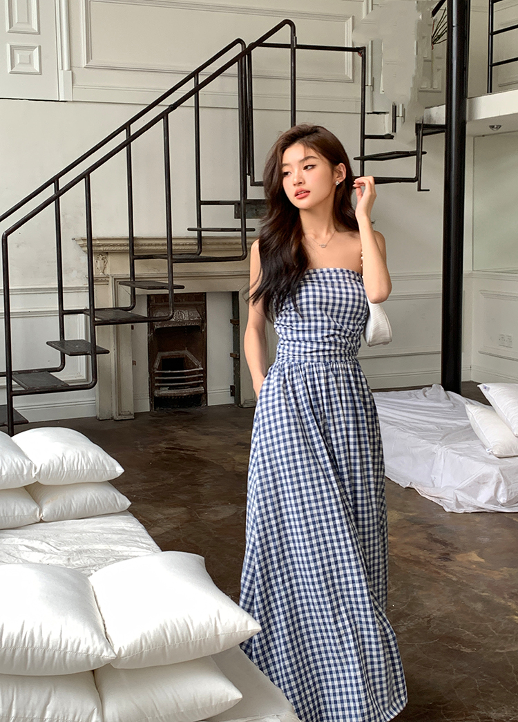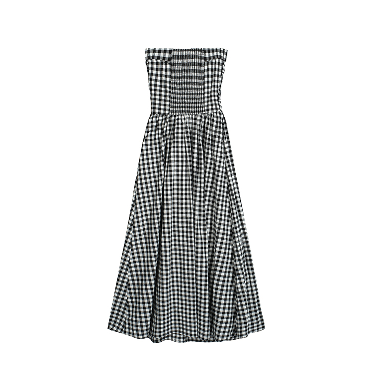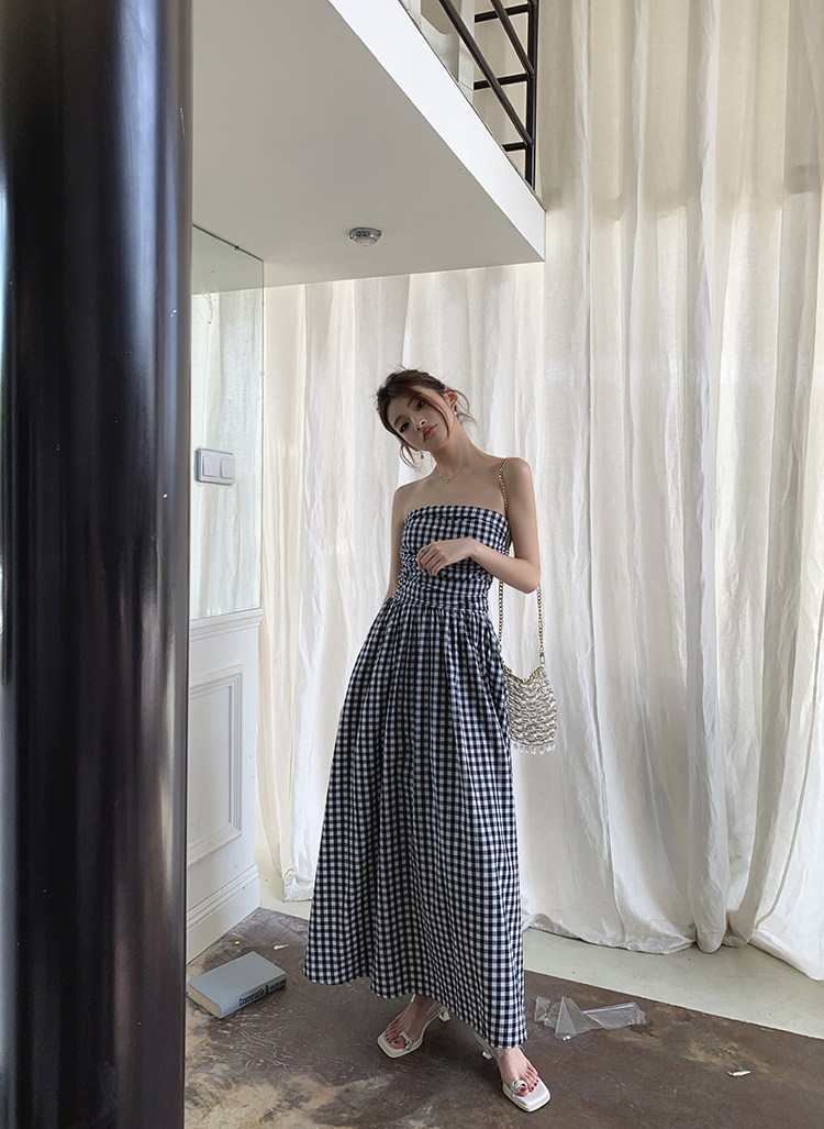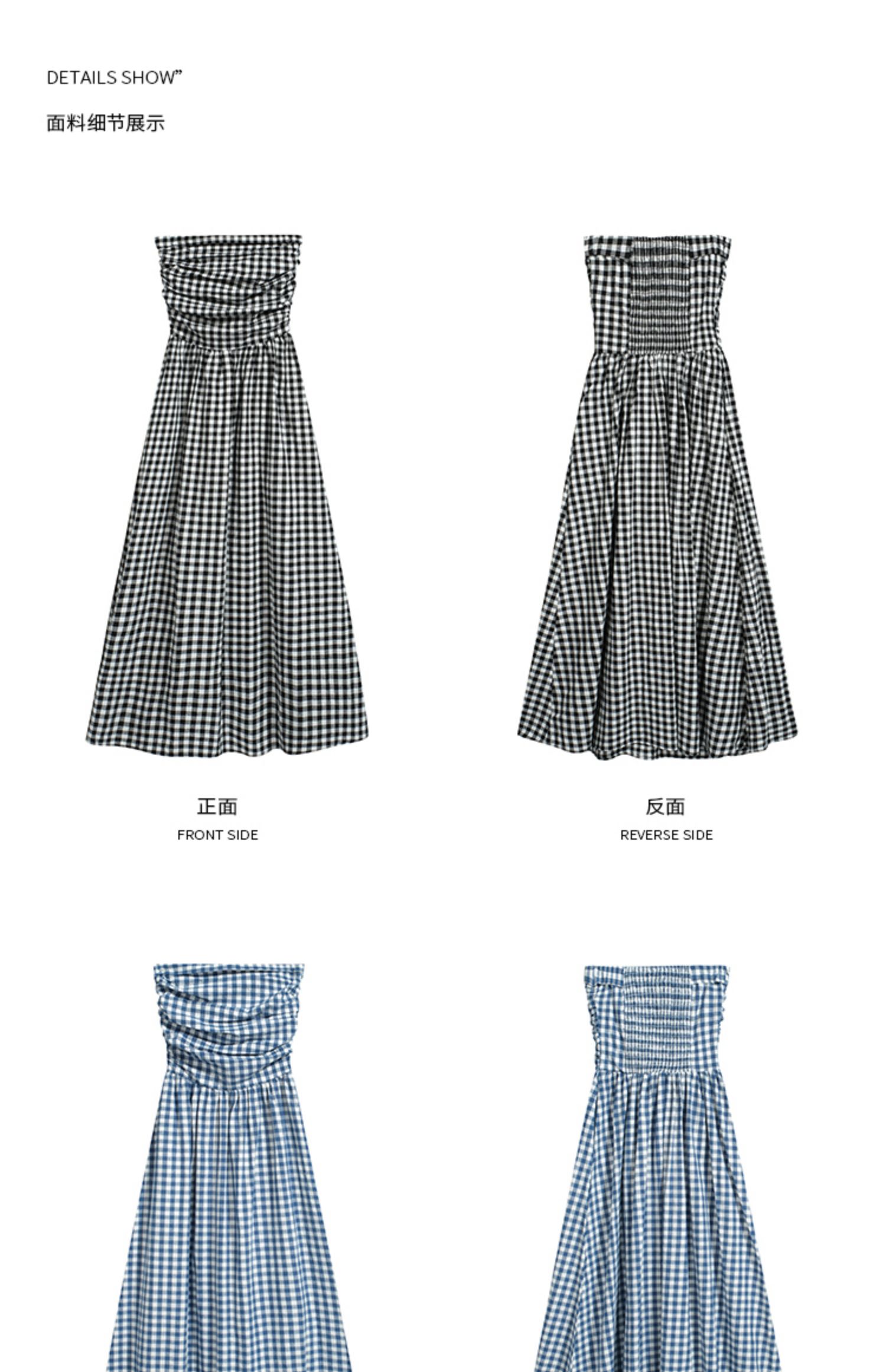 格子抹胸裙一字肩連衣裙女夏季法式氣質設計感收腰海邊度假長裙子