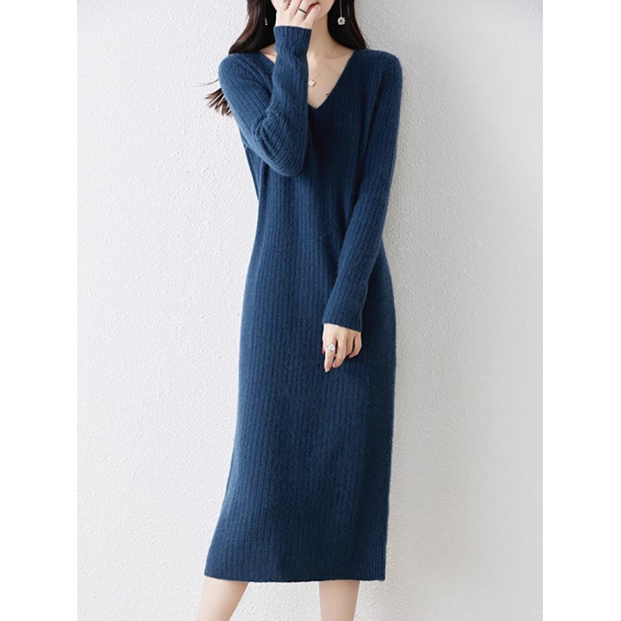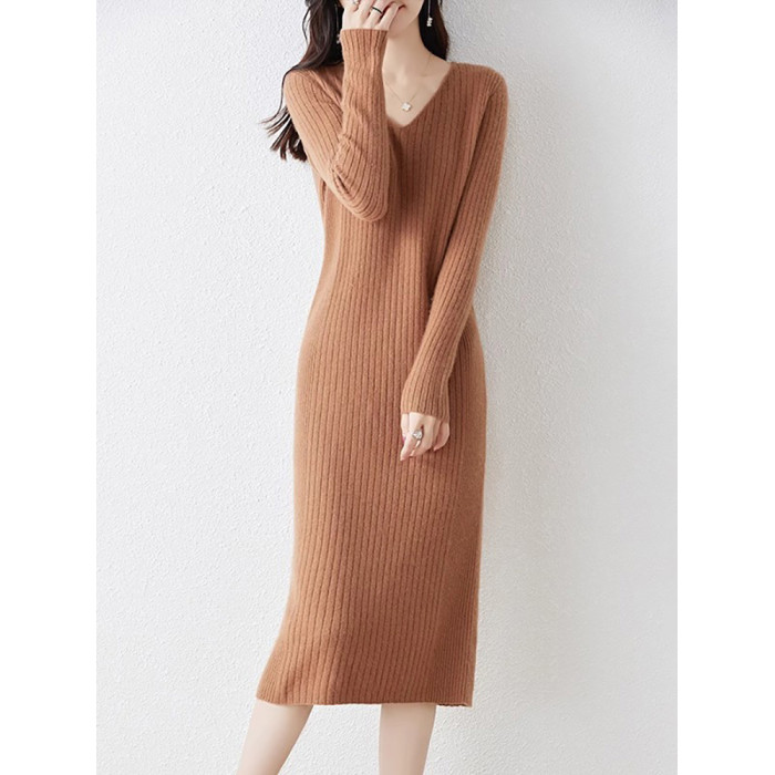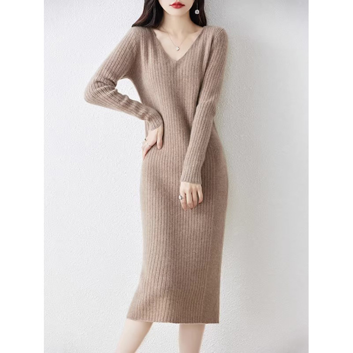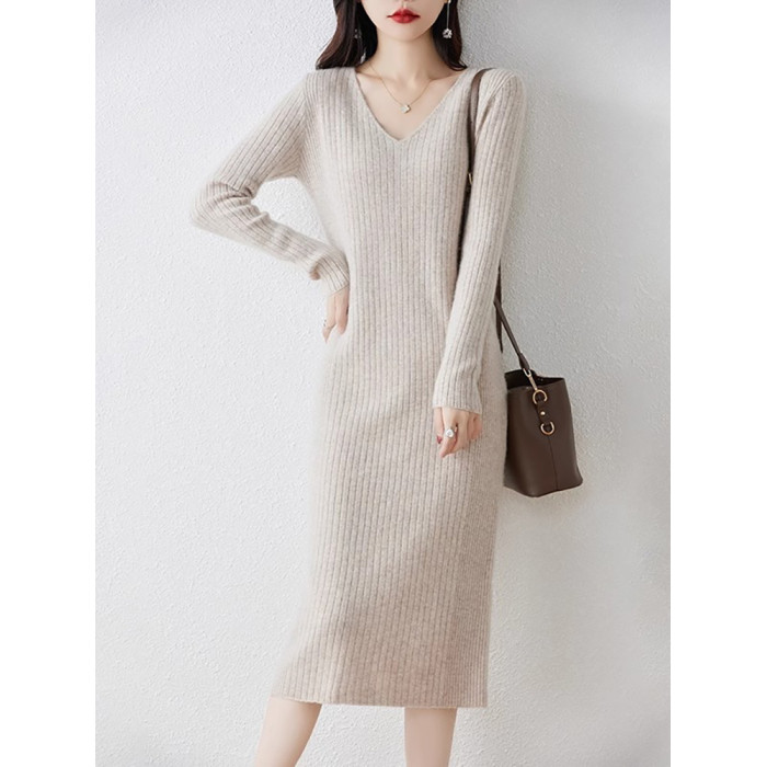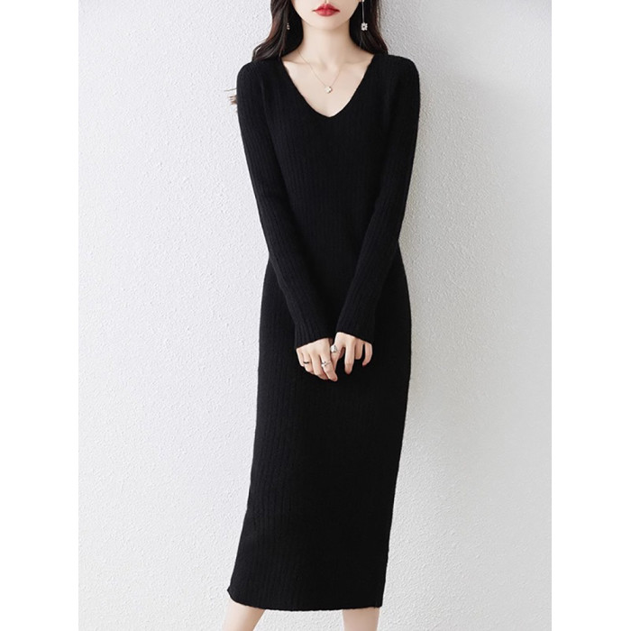 秋冬法式V領針織連衣裙女內搭小香風配大衣氣質顯瘦冬季打底長裙