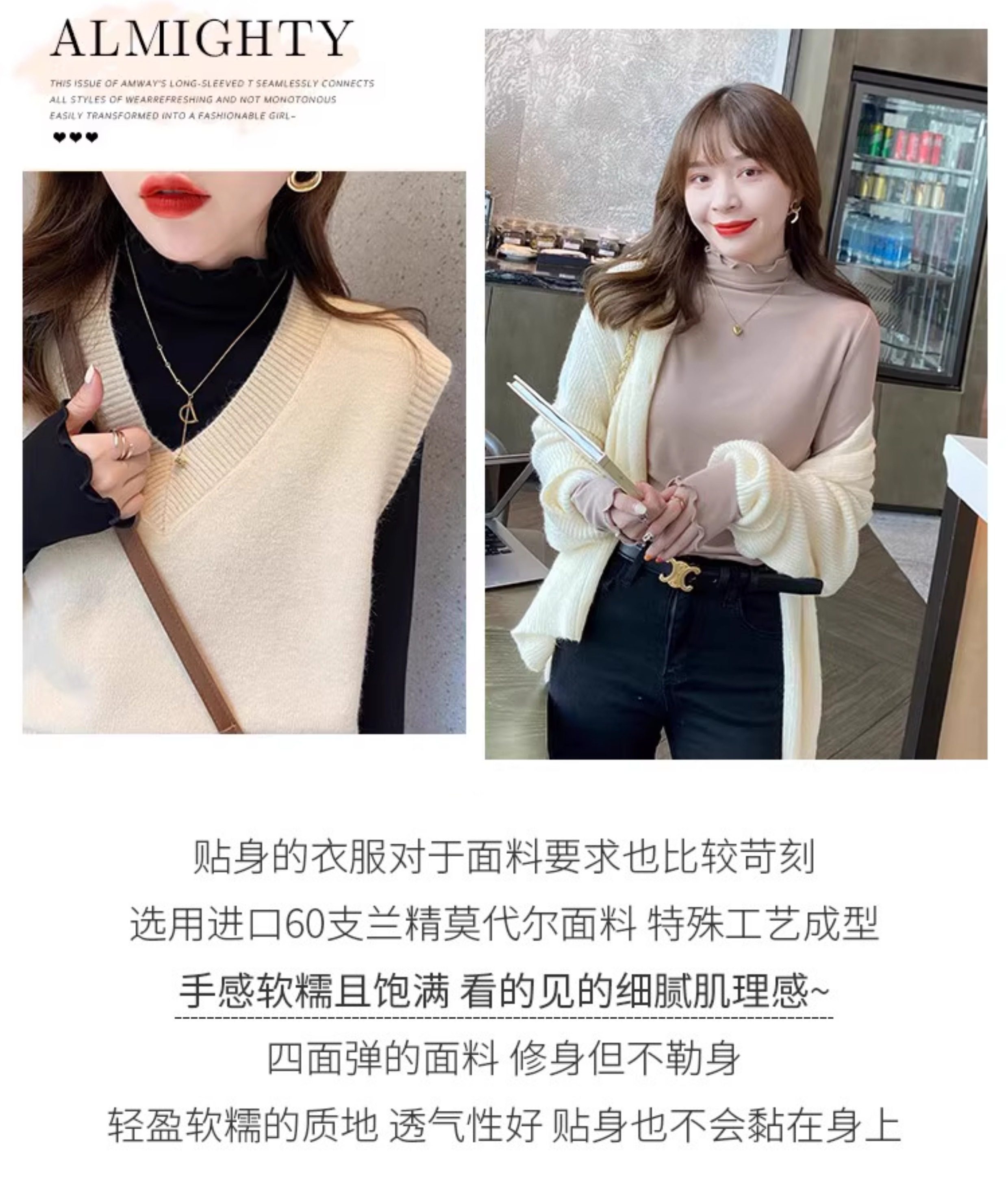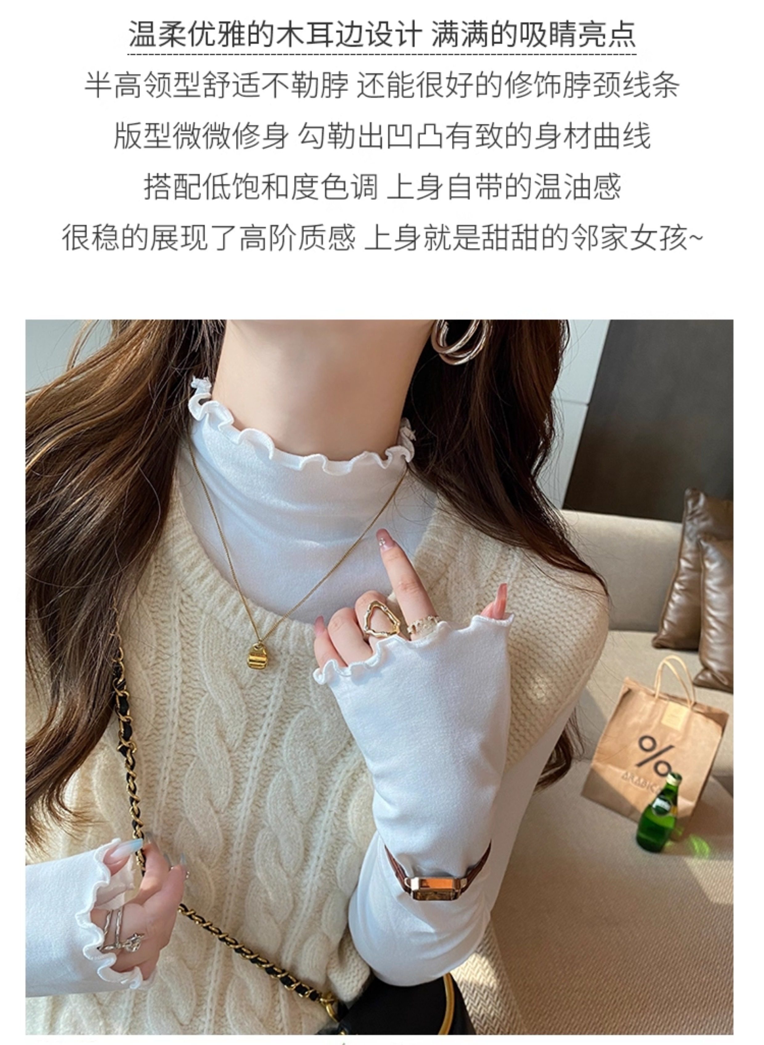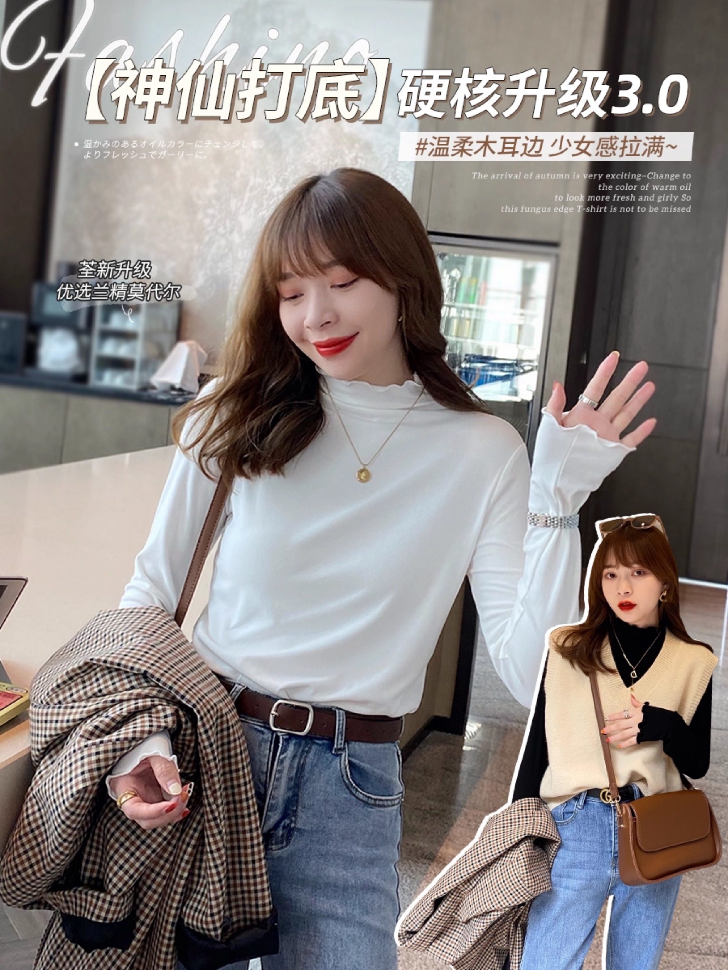 打底衫女內搭春秋2024新款黑色半高領莫代爾白色秋冬木耳邊上衣