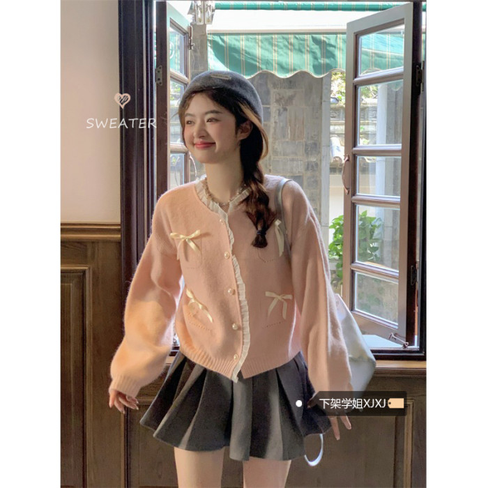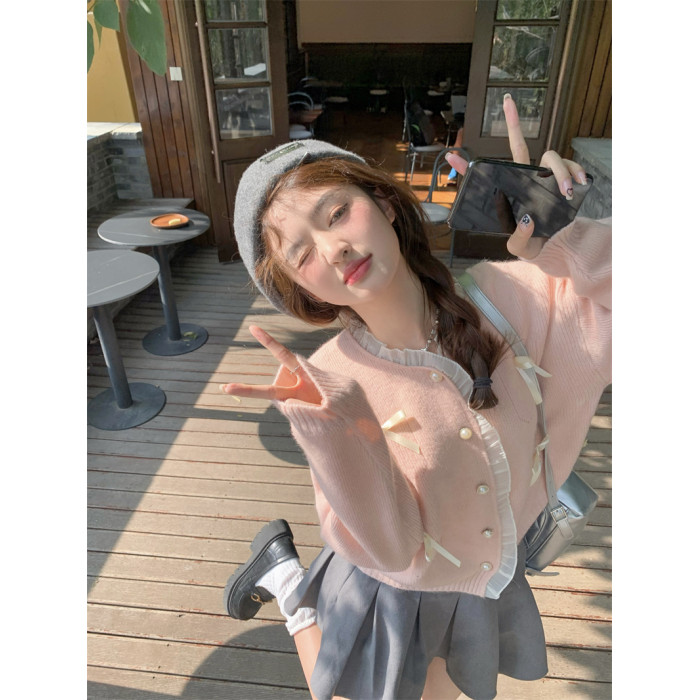 甜美粉色花邊拼接毛衣開衫女秋季2025新款蝴蝶結寬鬆短款針織上衣