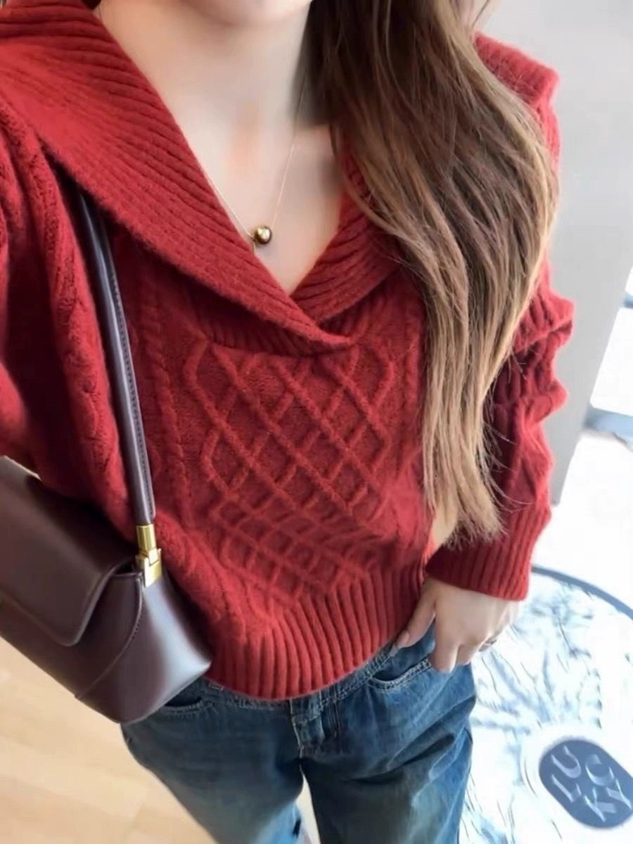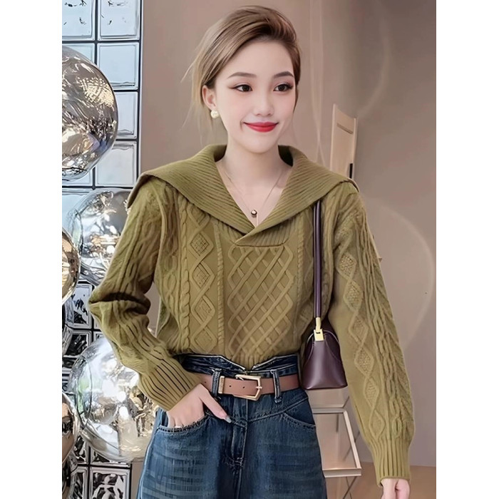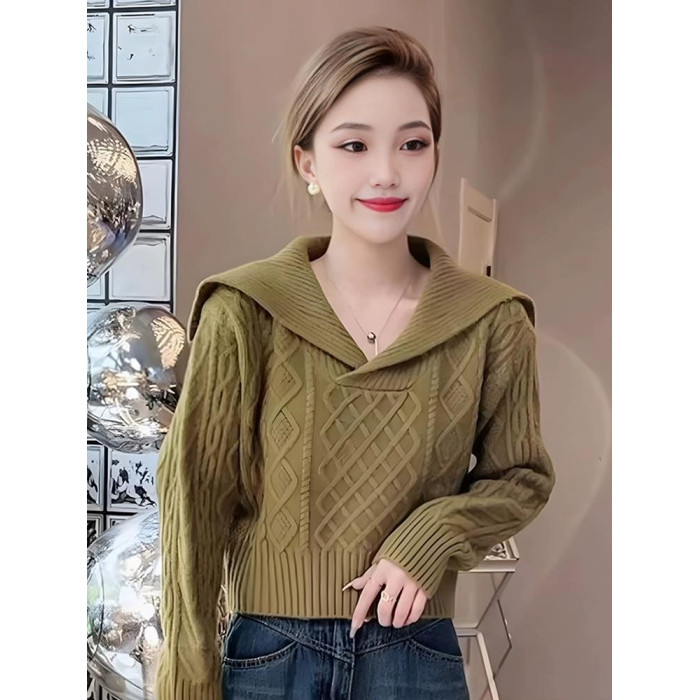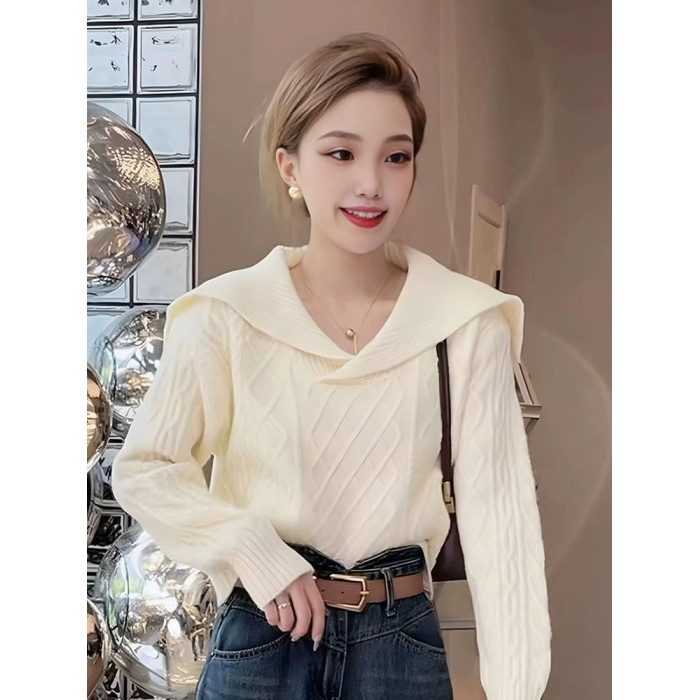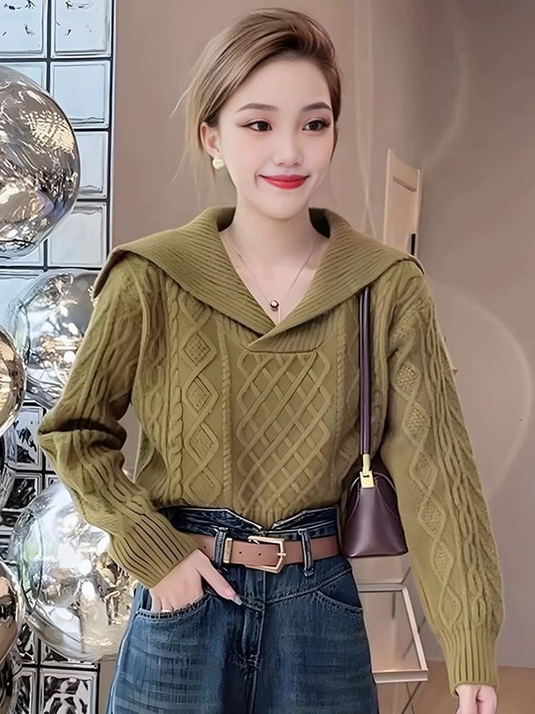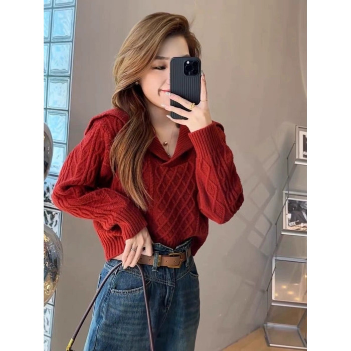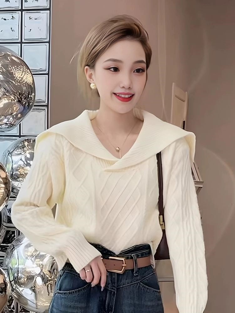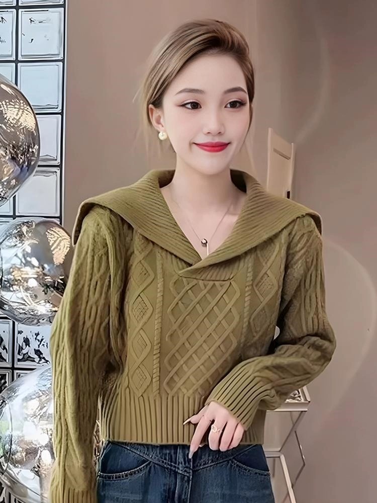 大翻領復古毛衣女春秋冬高腰短款小個子軟糯套頭海軍領長袖針織衫