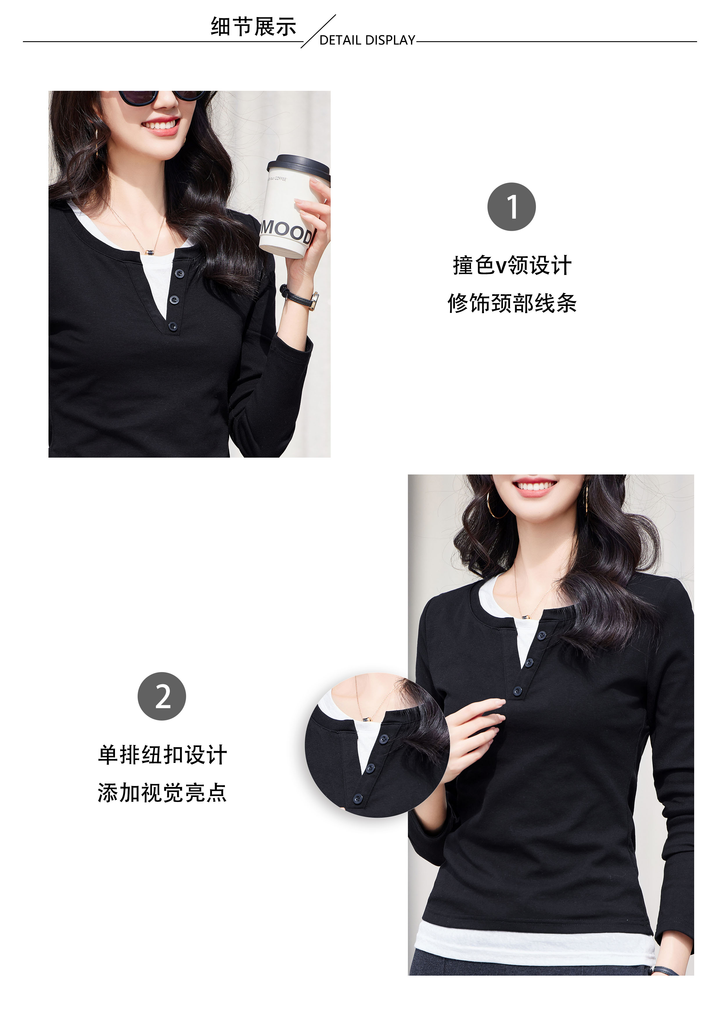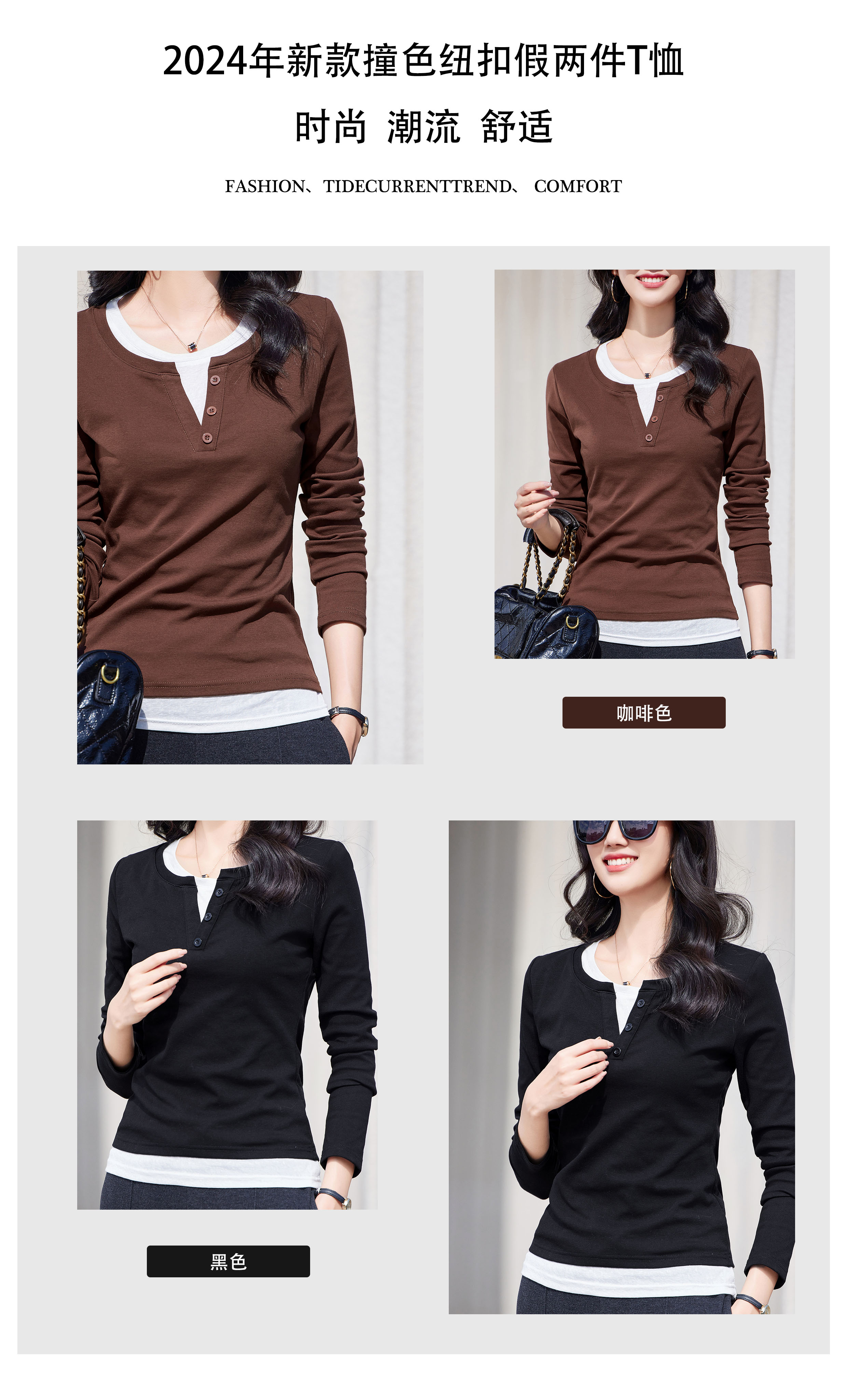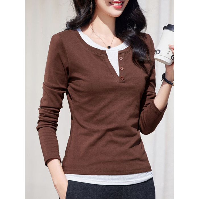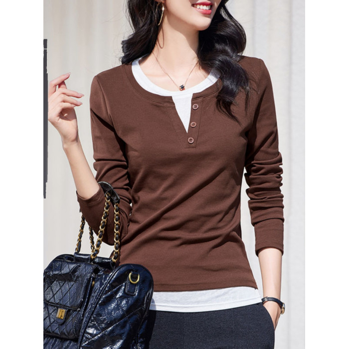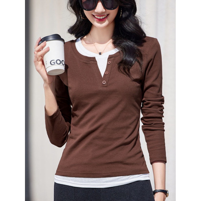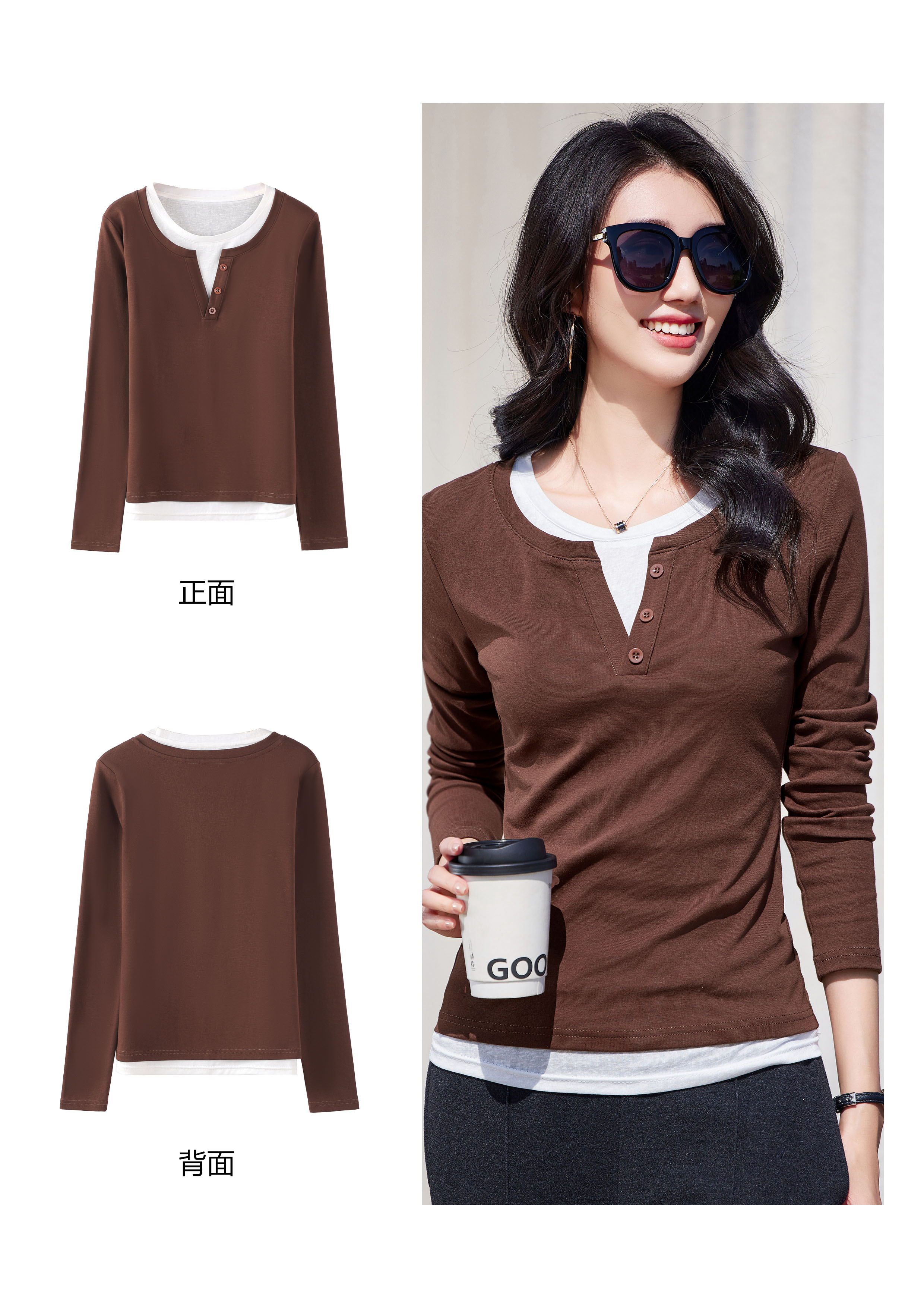 撞色假兩件圓領長袖t恤女秋裝新款2025年紐釦修身咖色上衣打底衫