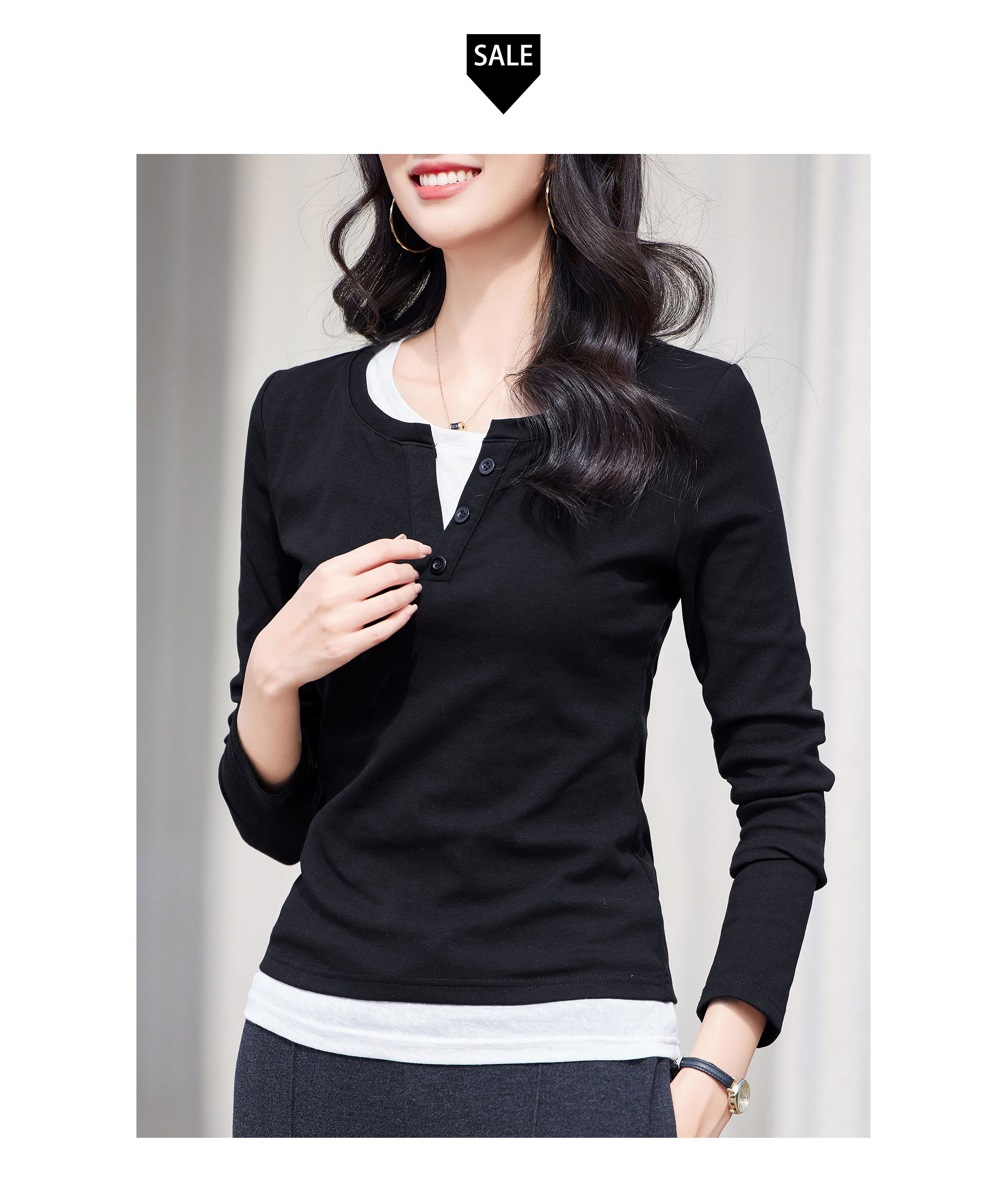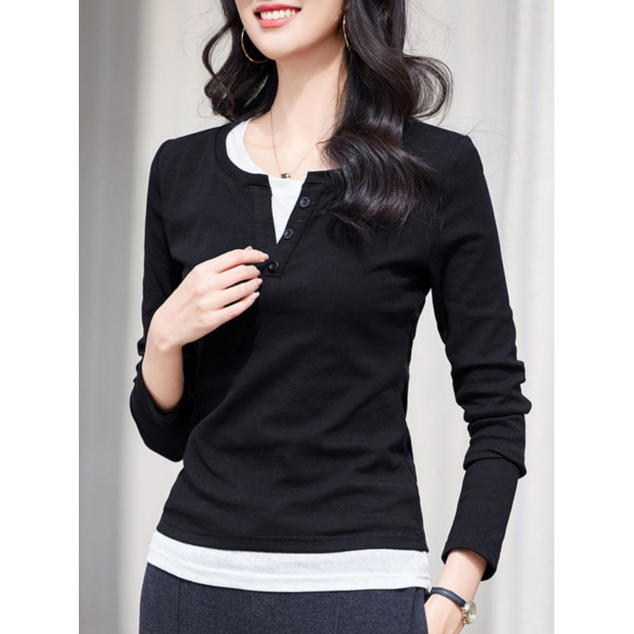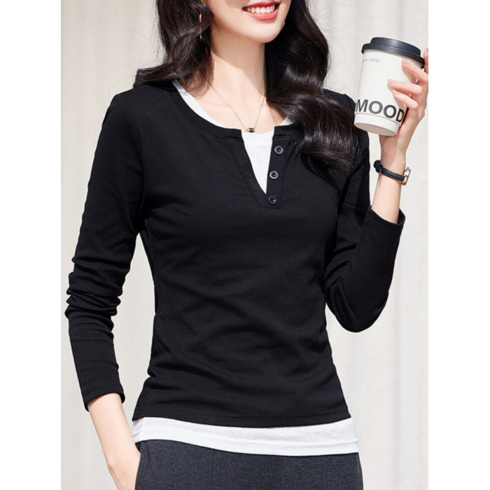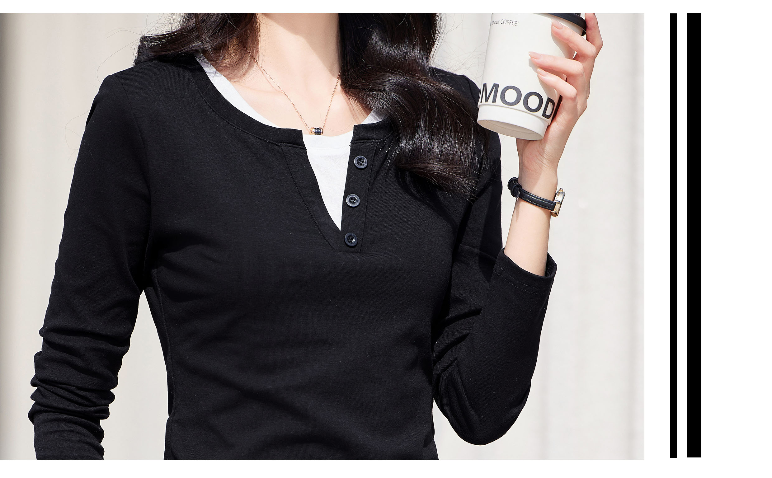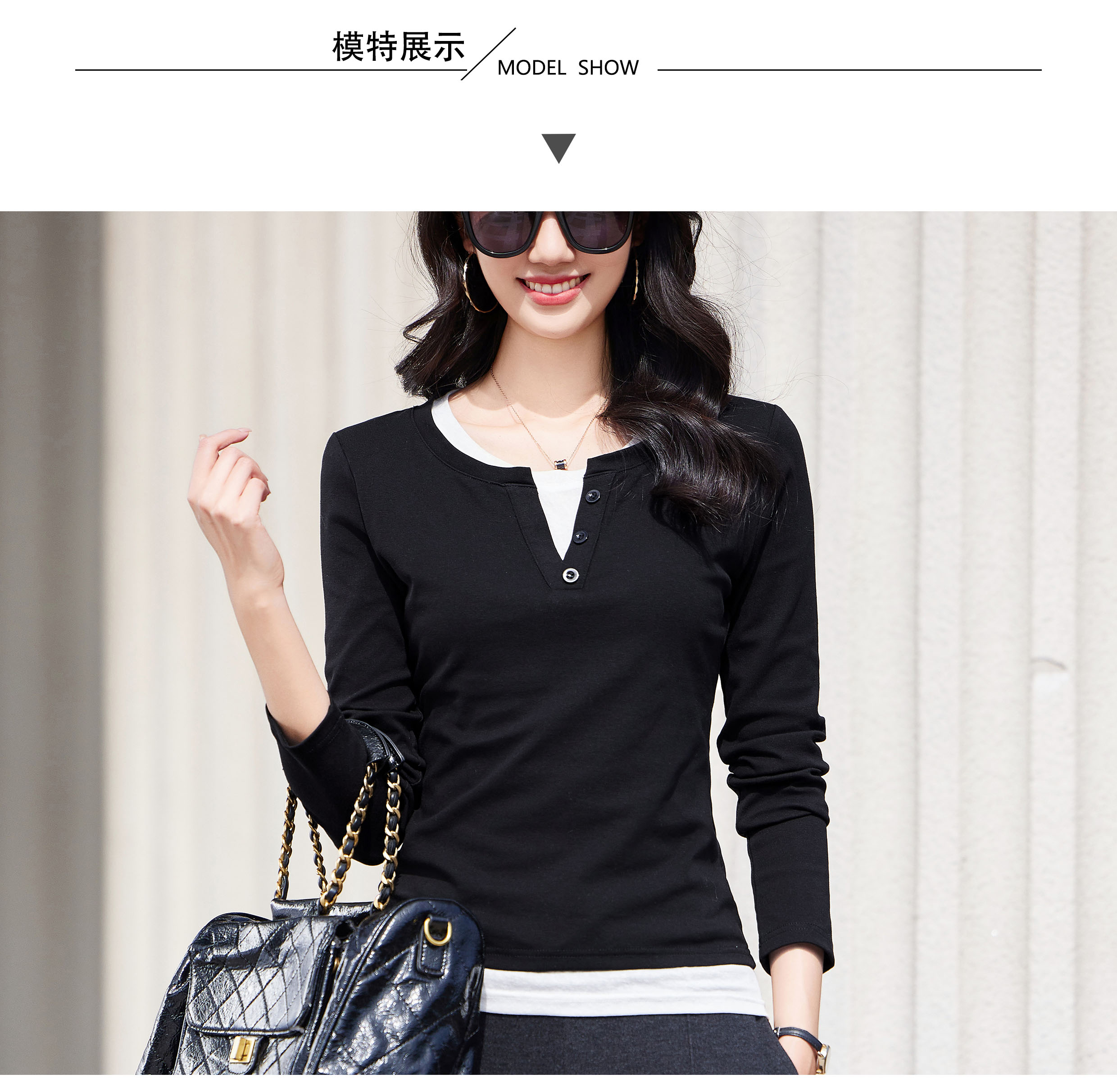 撞色假兩件圓領長袖t恤女秋裝新款2025年紐釦修身咖色上衣打底衫