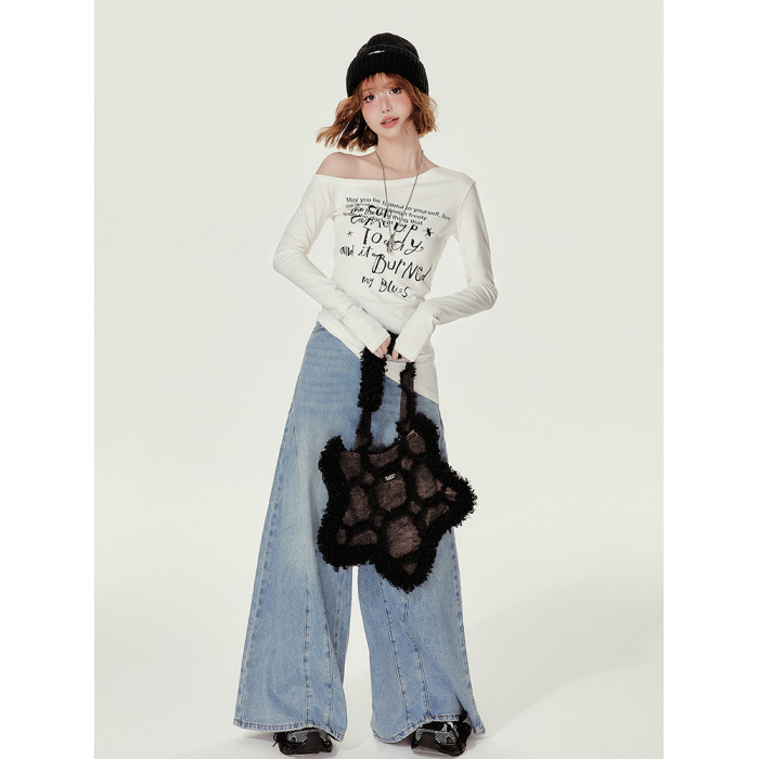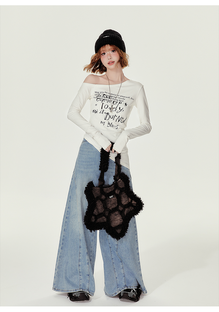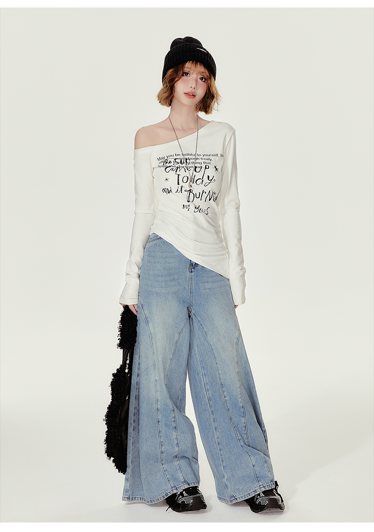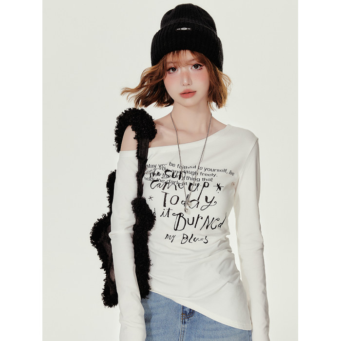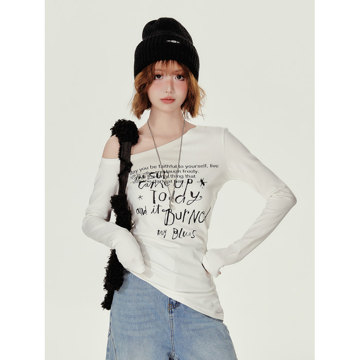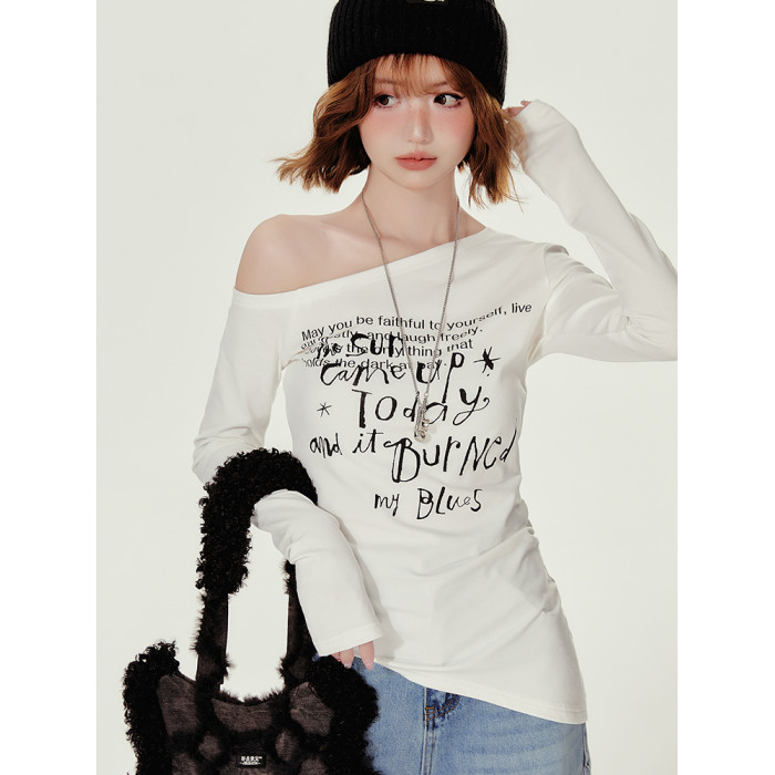 Girlyhalo美式復古辣妹斜領長袖t恤女秋季新款修身收腰顯瘦打底衫