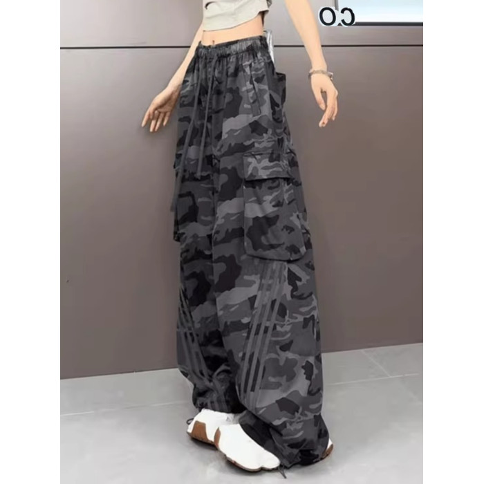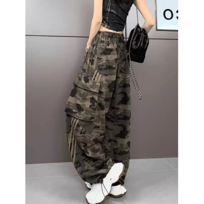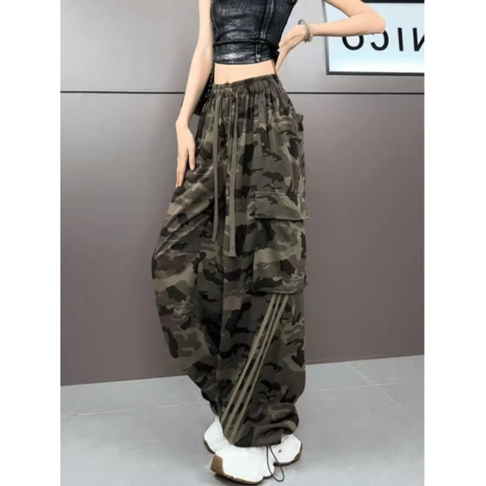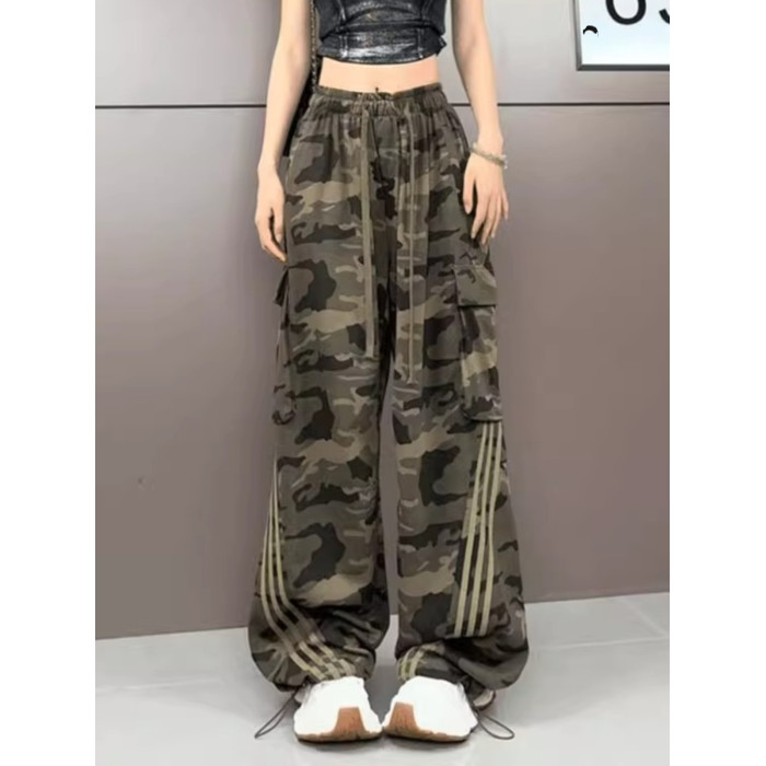 美式條紋迷彩運動工裝褲女2025秋季新款休閒寬松顯瘦直筒濶腿褲潮