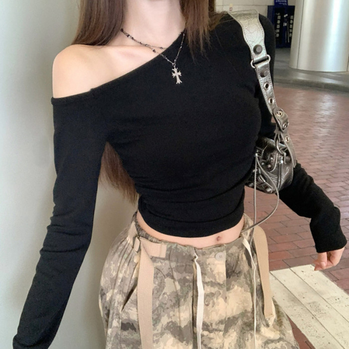 ins辣妹不規則斜肩磨毛長袖t恤女秋季新款小個子修身顯瘦短款上衣