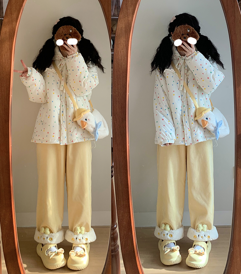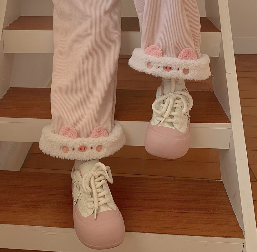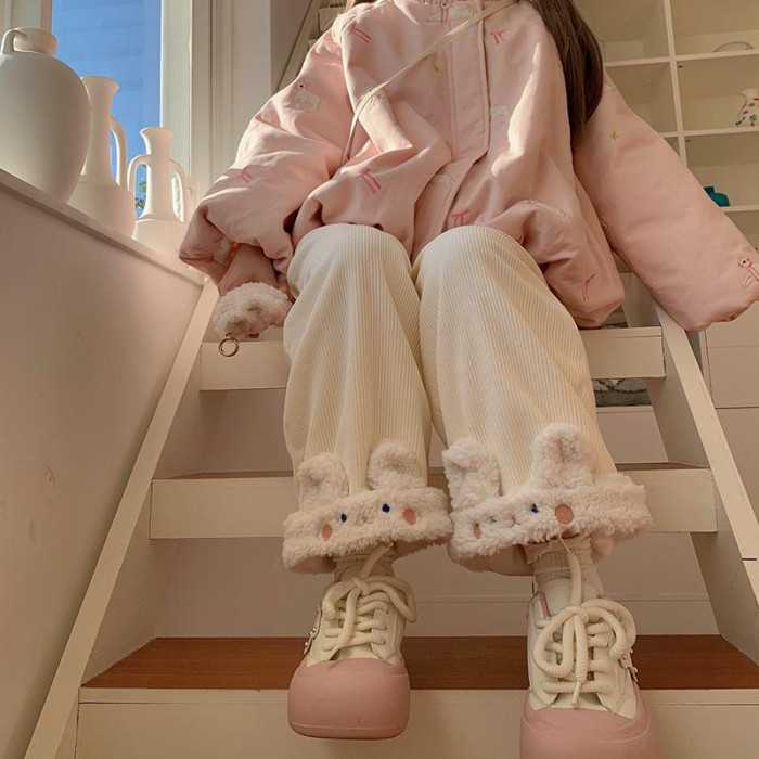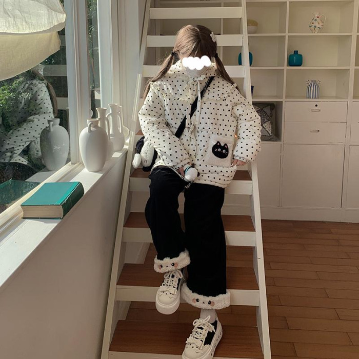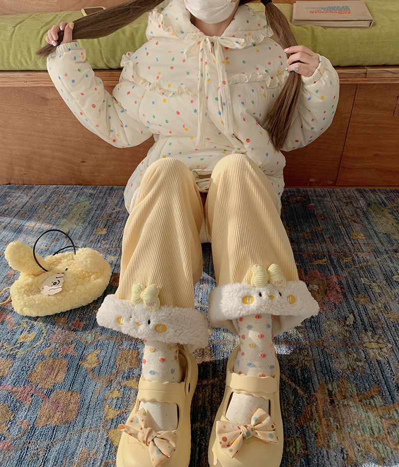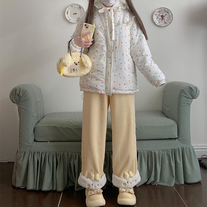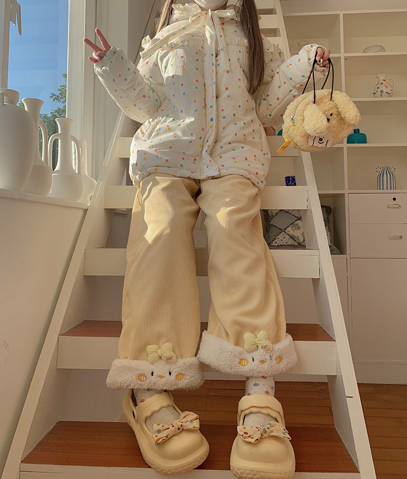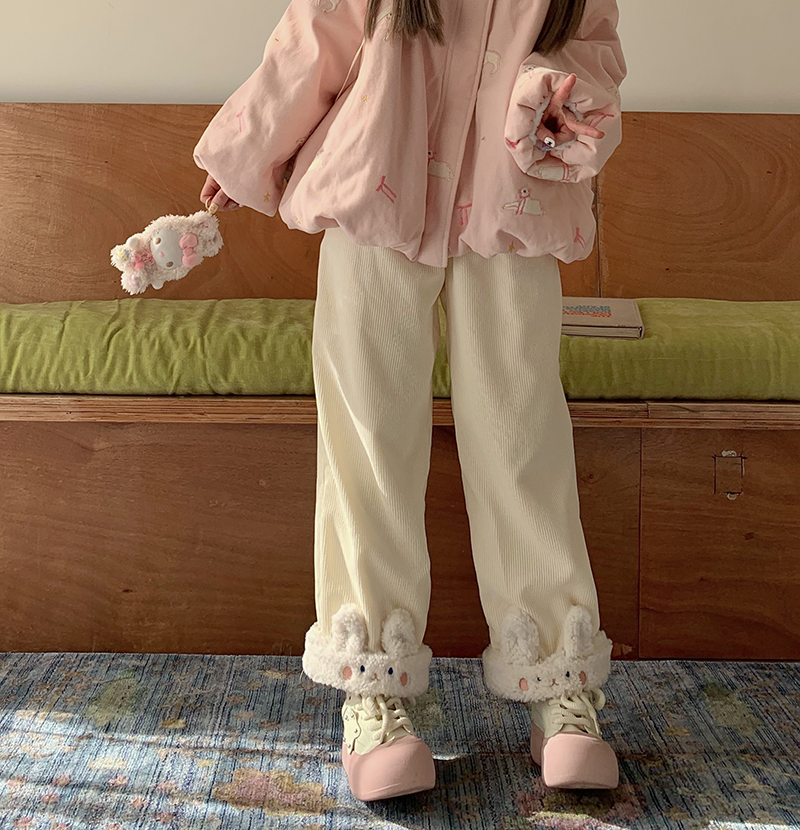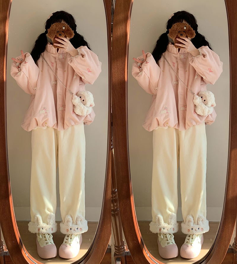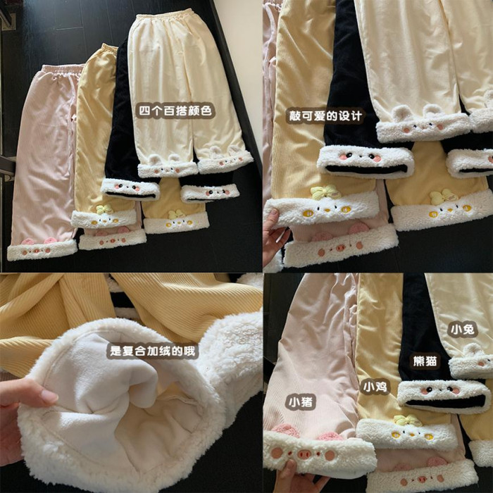 原創設計動物系列加絨直筒褲可愛冬季保暖休閒加厚褲子拼接刺綉