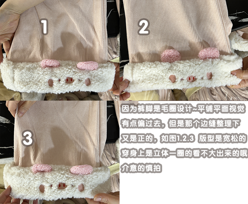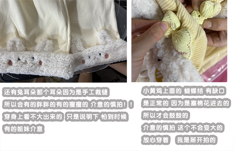 這款是做了升級版的兔子~上面的毛圈部分添加了表情的小刺綉~做了四個顔色,一個黃色做了小黃雞 粉色做了小粉豬 杏色做的小白兔和黑色的做了小熊貓~比較百搭的四個顔色都有哦~下面是做的立體的毛圈所以底下它會點點不平整有點堆起來的感覺 因爲那裡做的事折曡起來的 不是和布縫一起的 介意的慎拍!