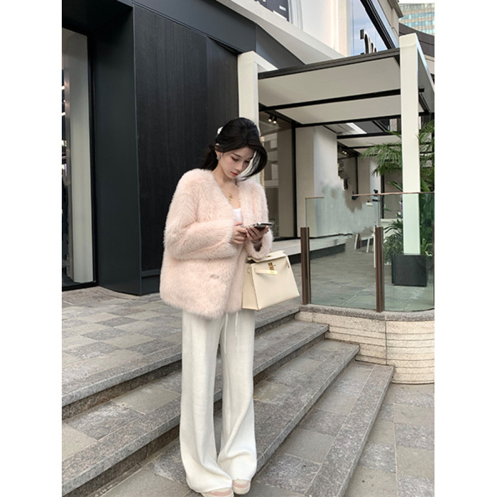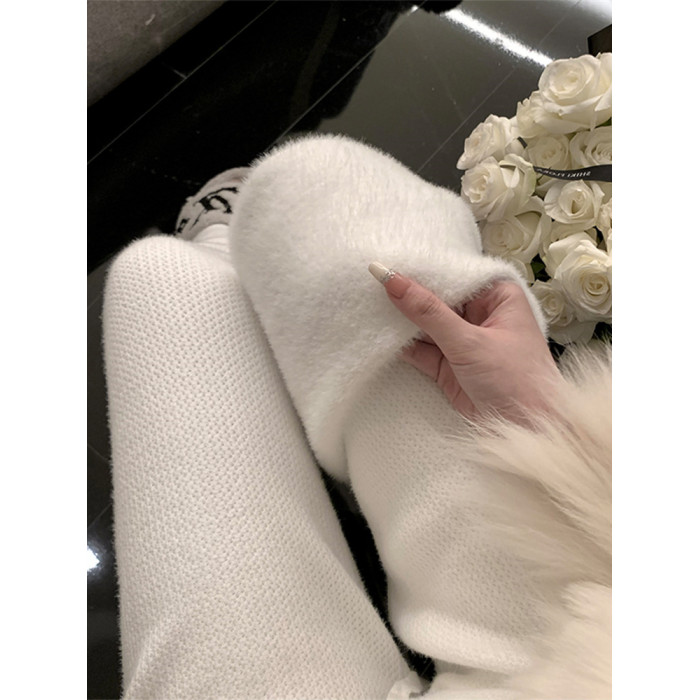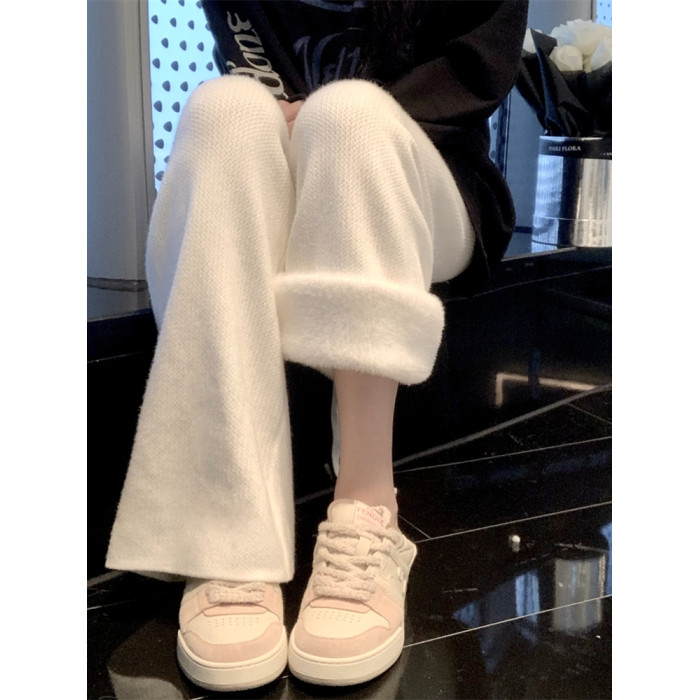 加絨加厚白色針織濶腿褲女秋冬季高級感溫柔風垂感休閒直筒拖地褲