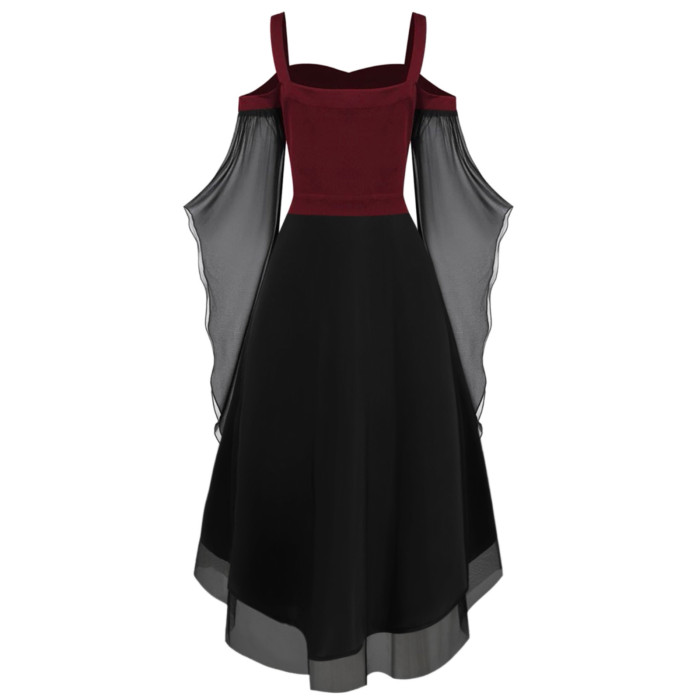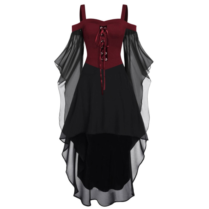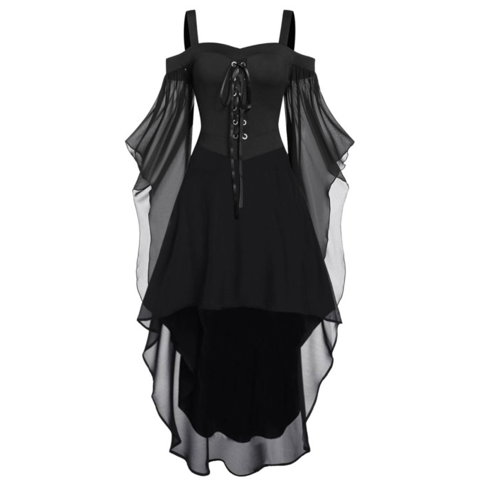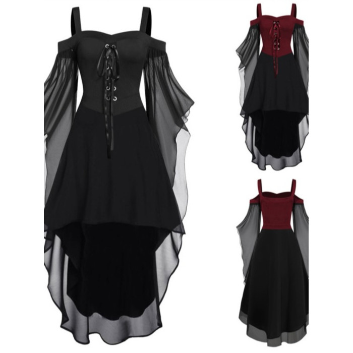 大碼女裝胖妹妹大擺袖不規則拼接萬聖節女巫吊帶綁帶中長款連衣裙