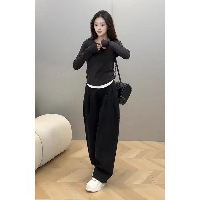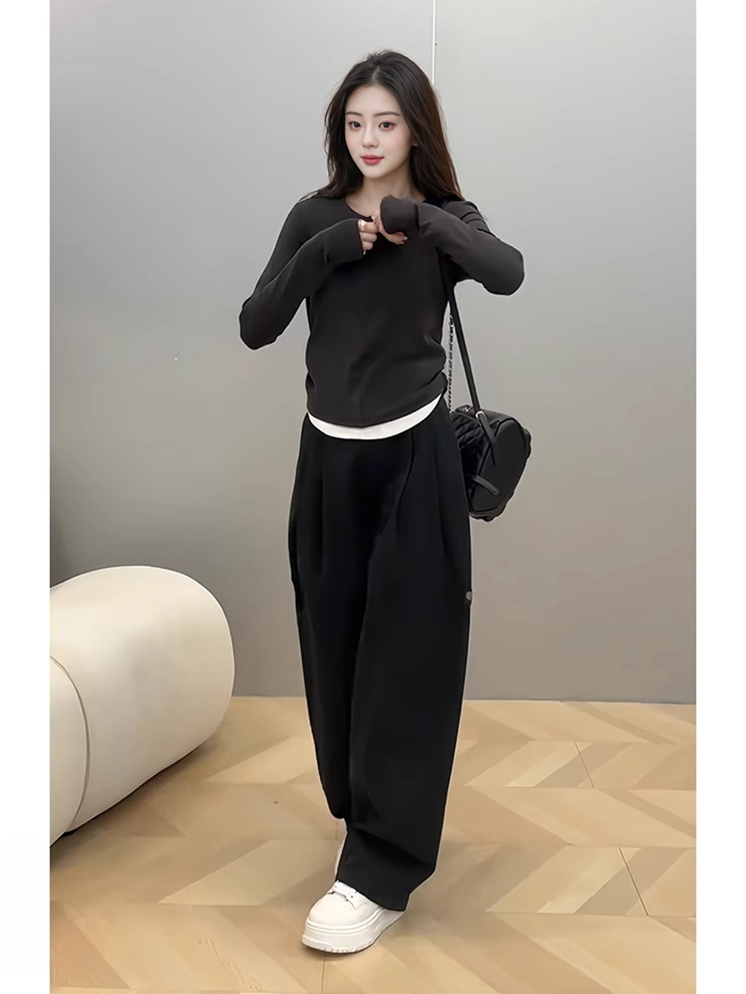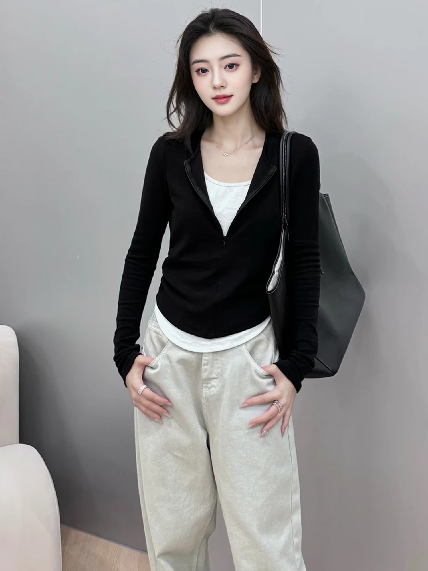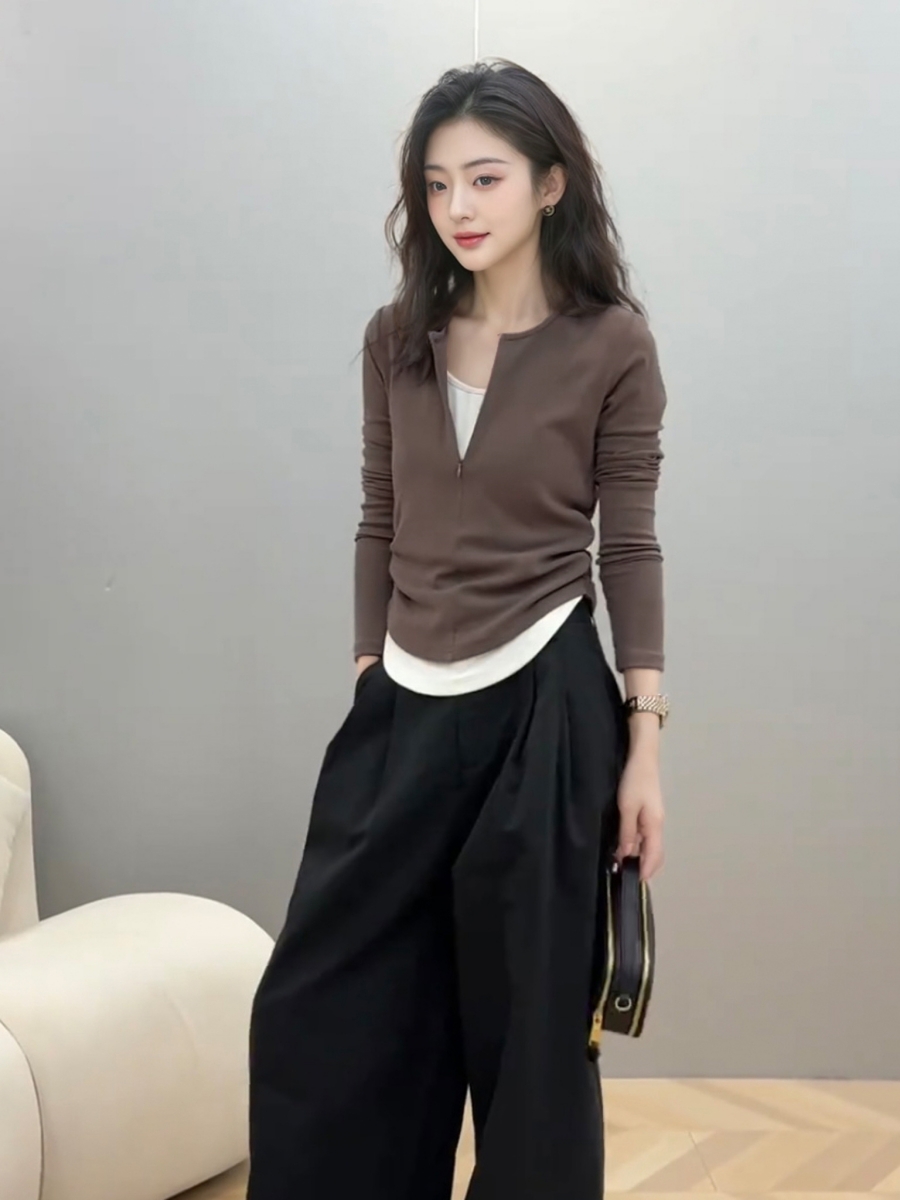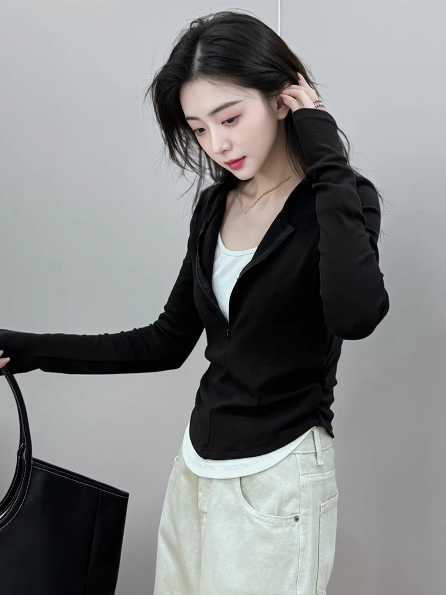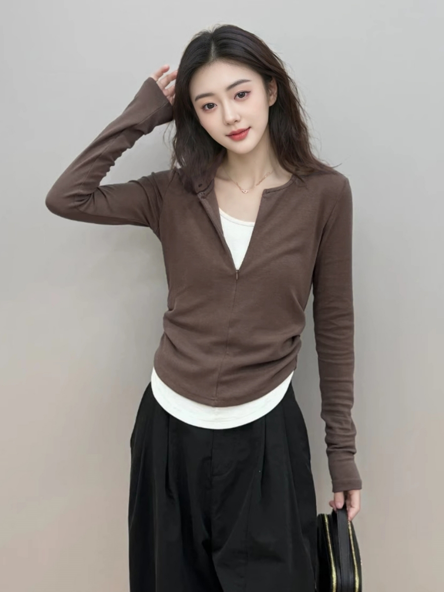 韓系修身假兩件褶皺收腰長袖T恤女2025秋季新款辣妹顯瘦拉鍊上衣