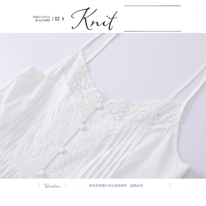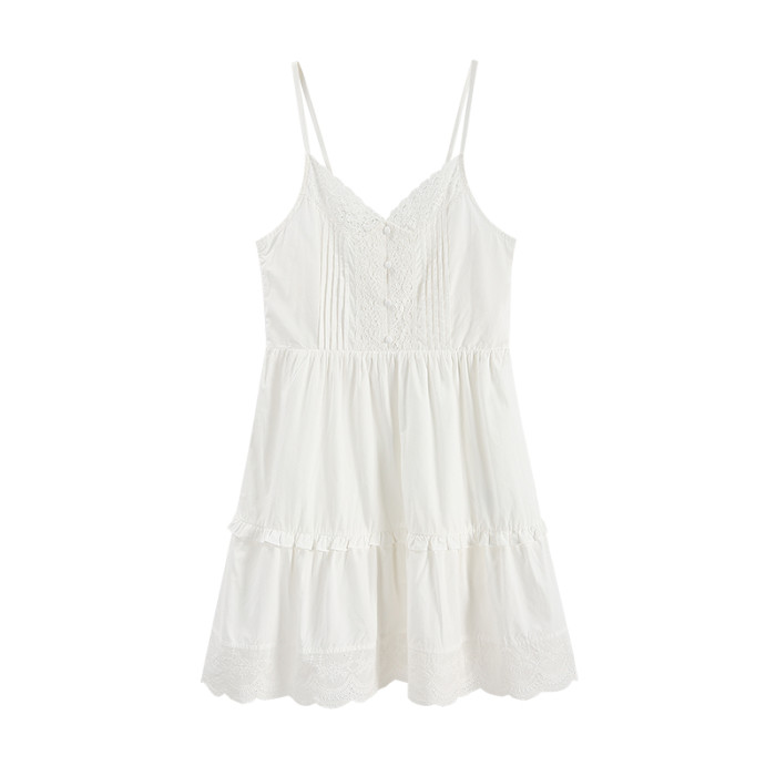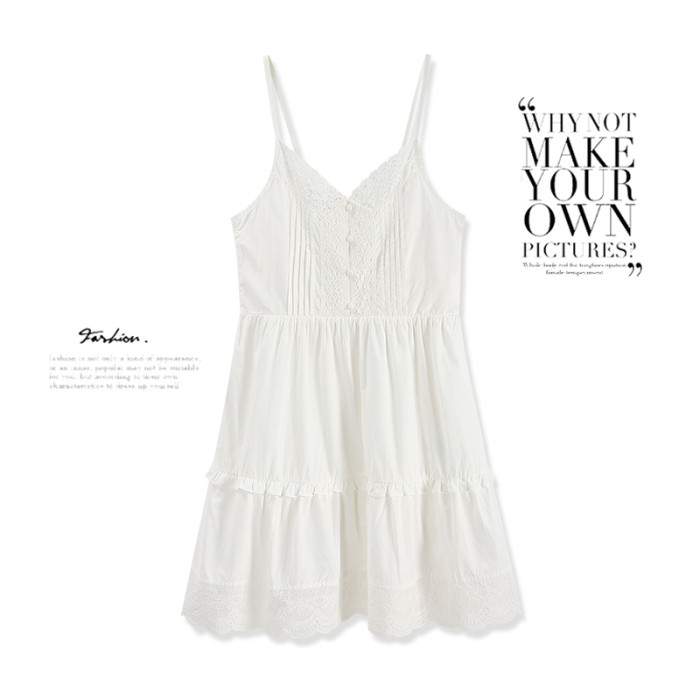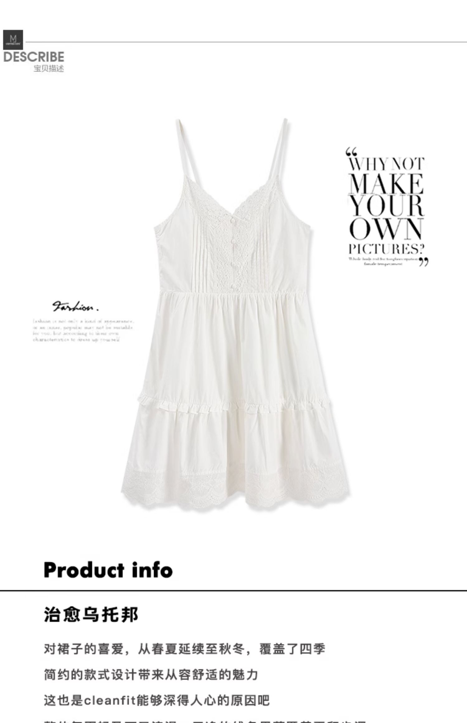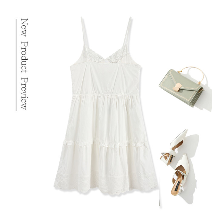 小雨日系少女感花邊蕾絲V領吊帶裙春夏季女白色曡穿短款連衣裙子