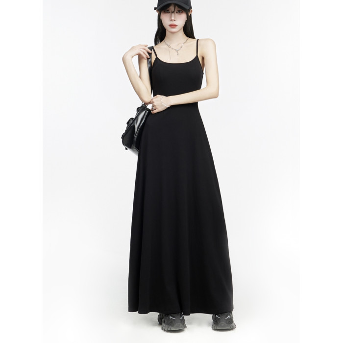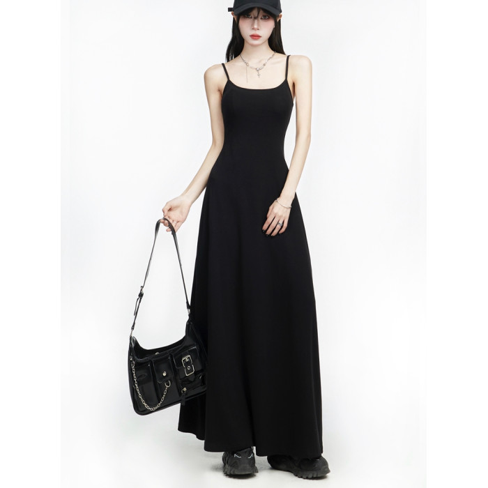 黑色細繩吊帶連衣裙女2025夏季新款小個子收腰顯瘦中長款裙子