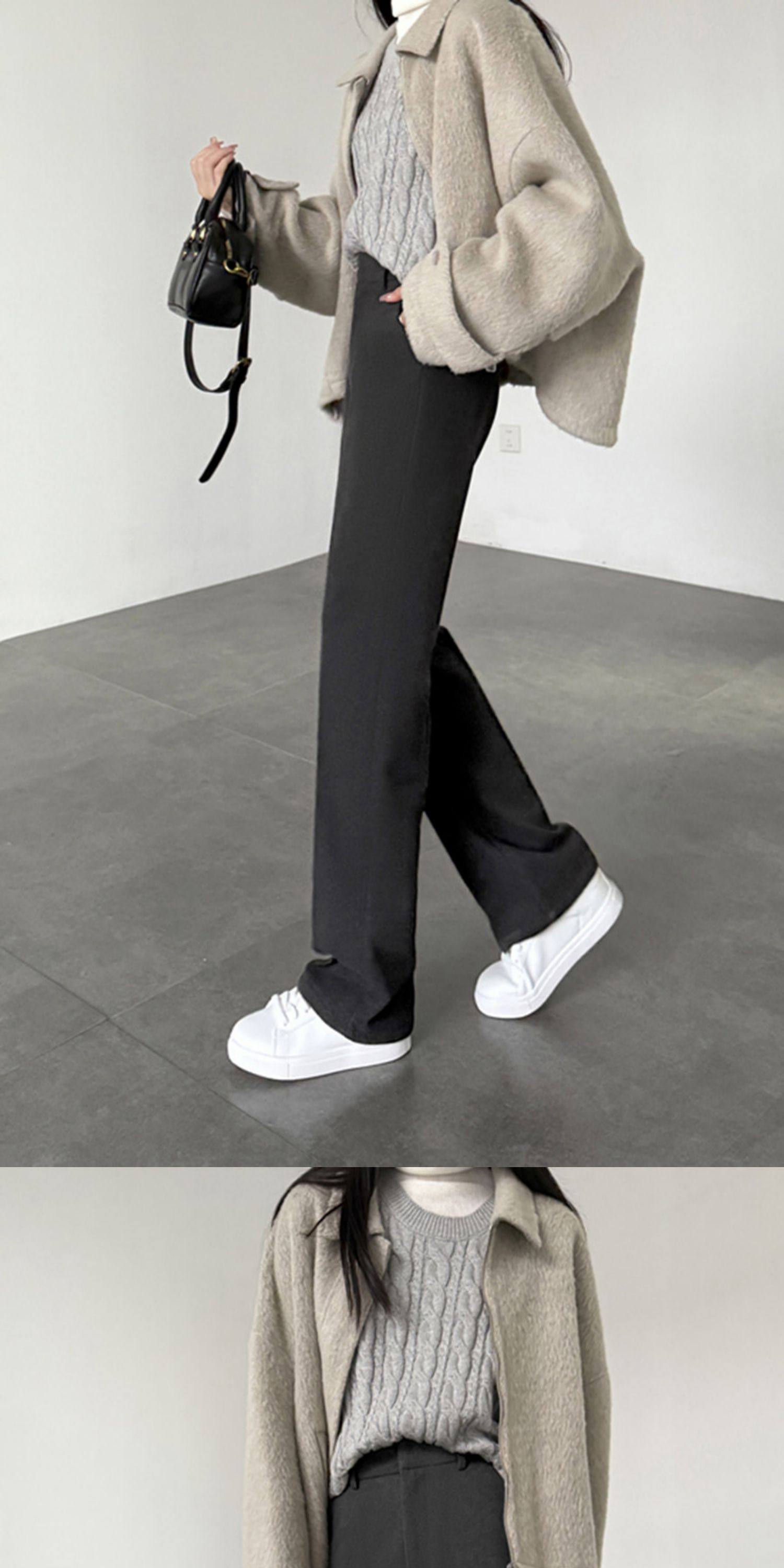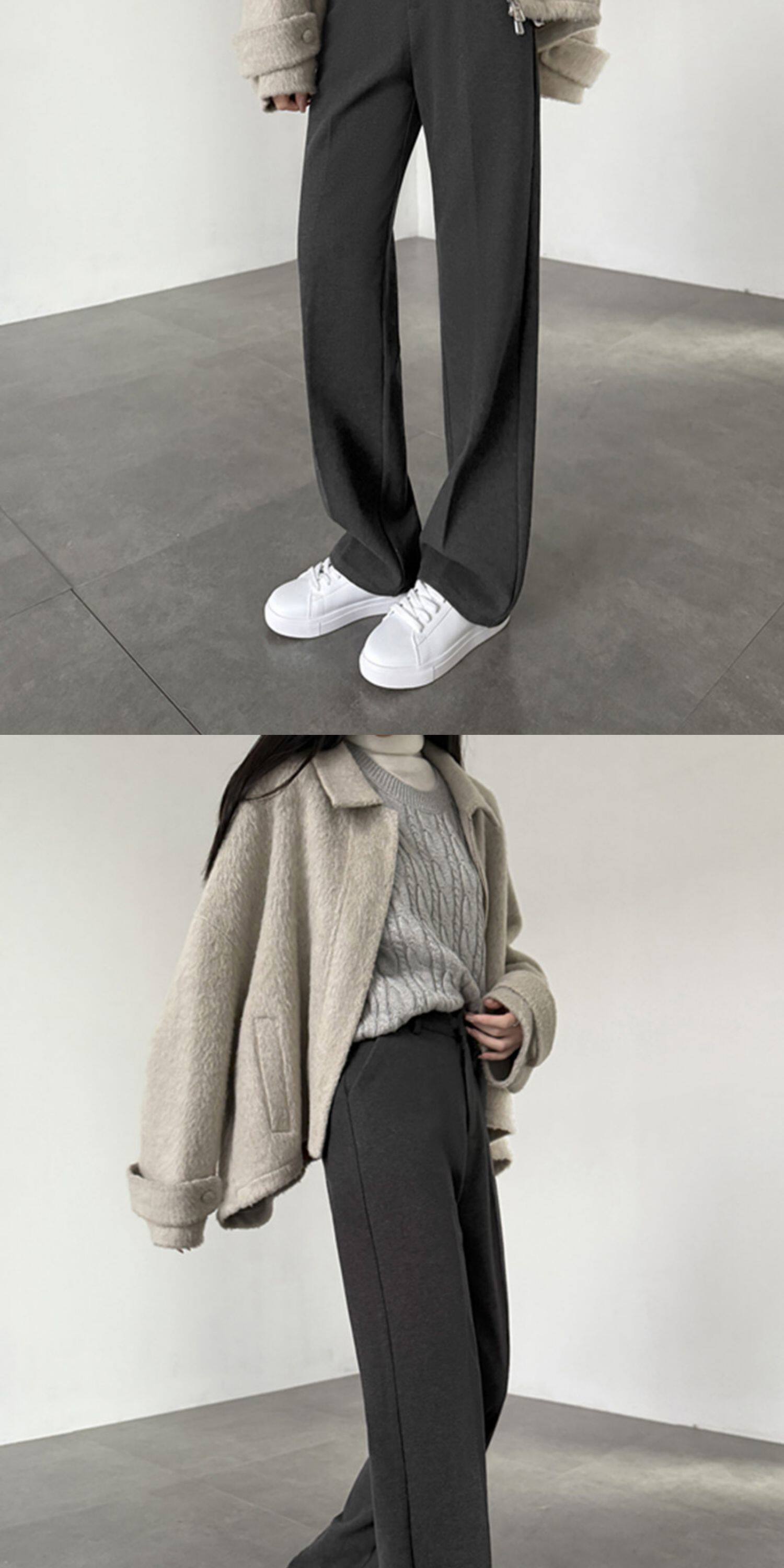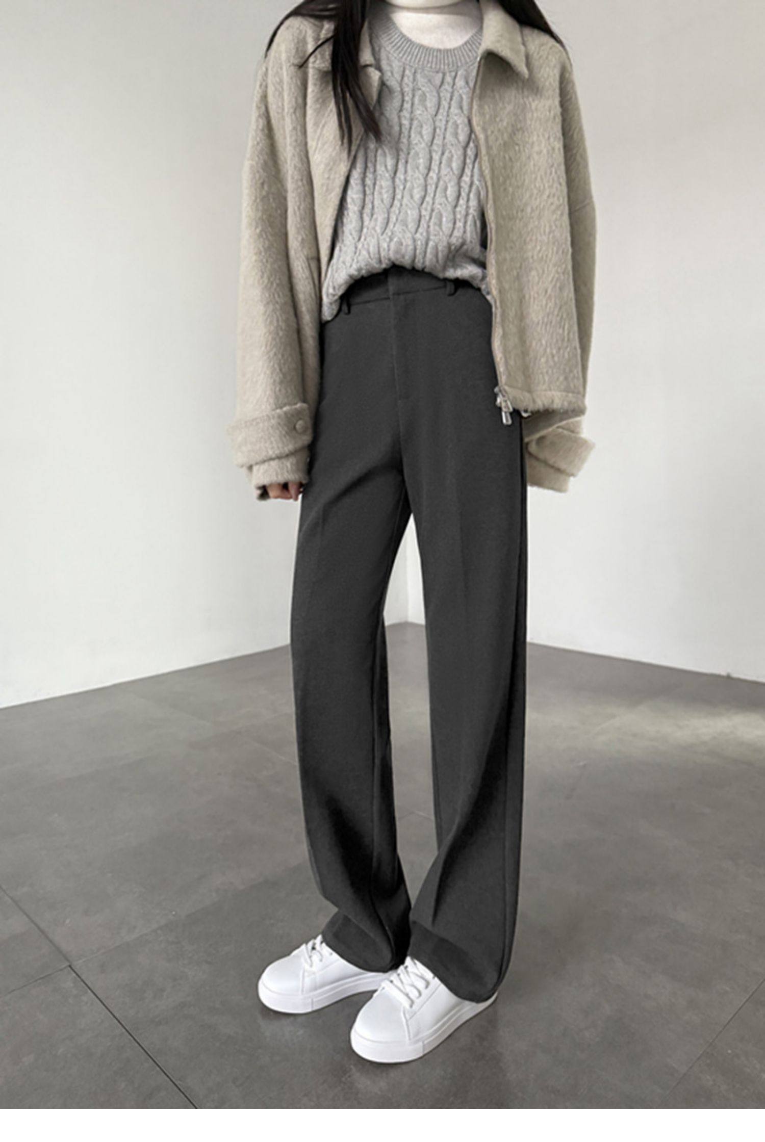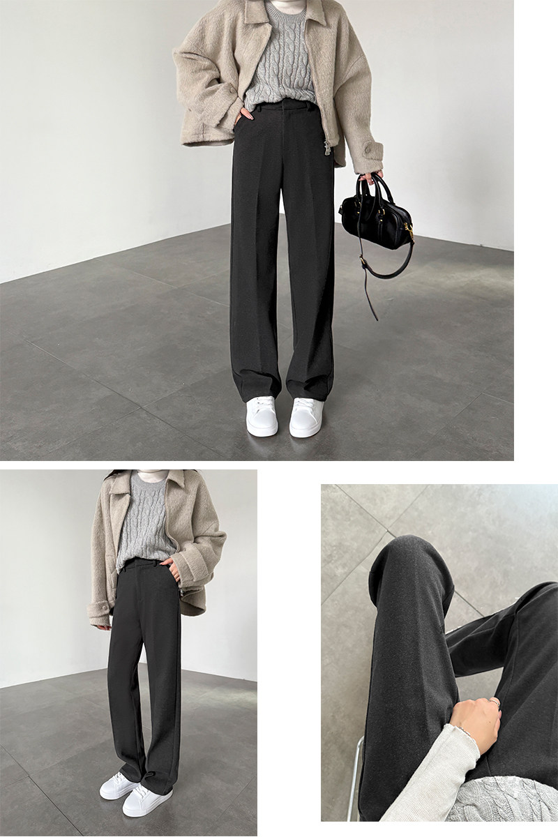 2025秋冬顯瘦加厚寬鬆休閒窄版長褲深灰色毛呢高腰直筒濶腿拖地褲