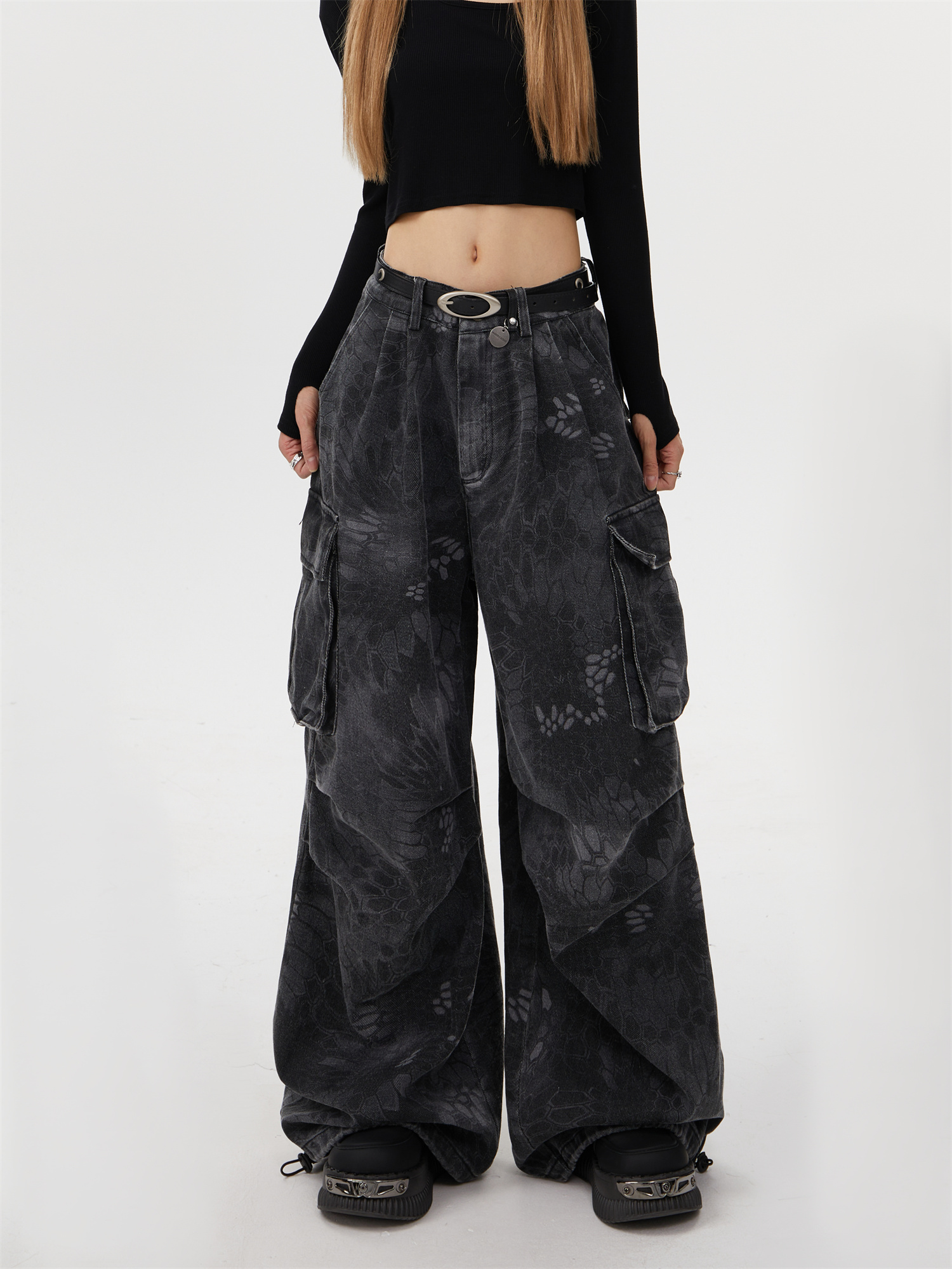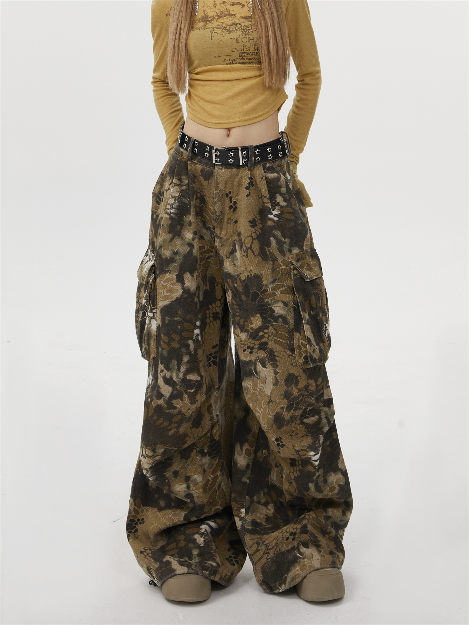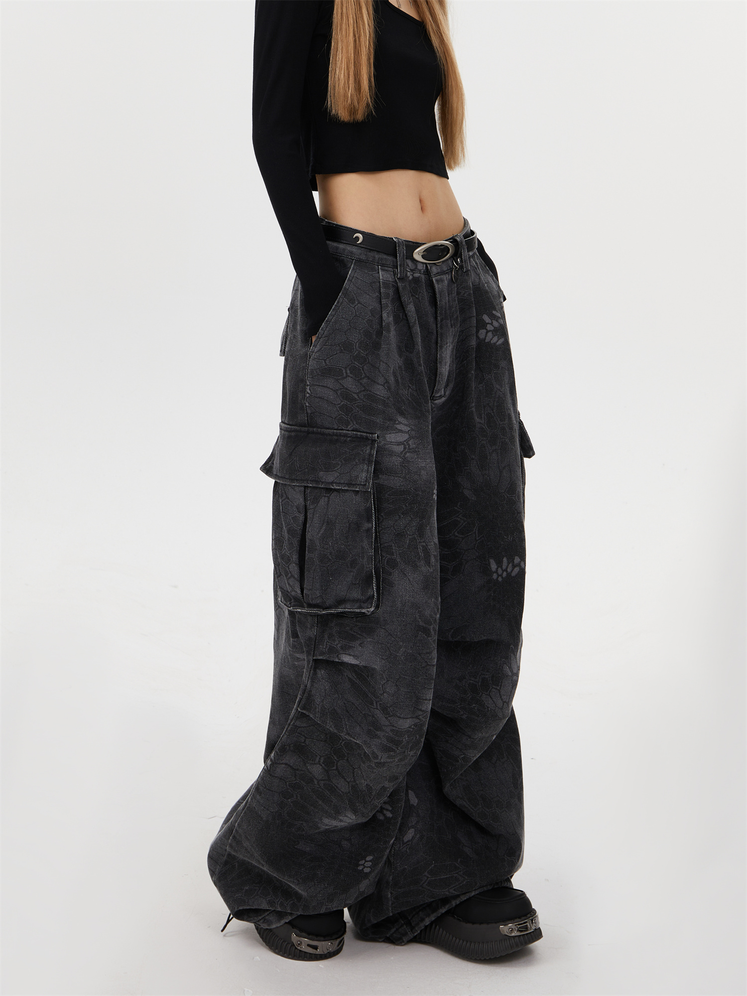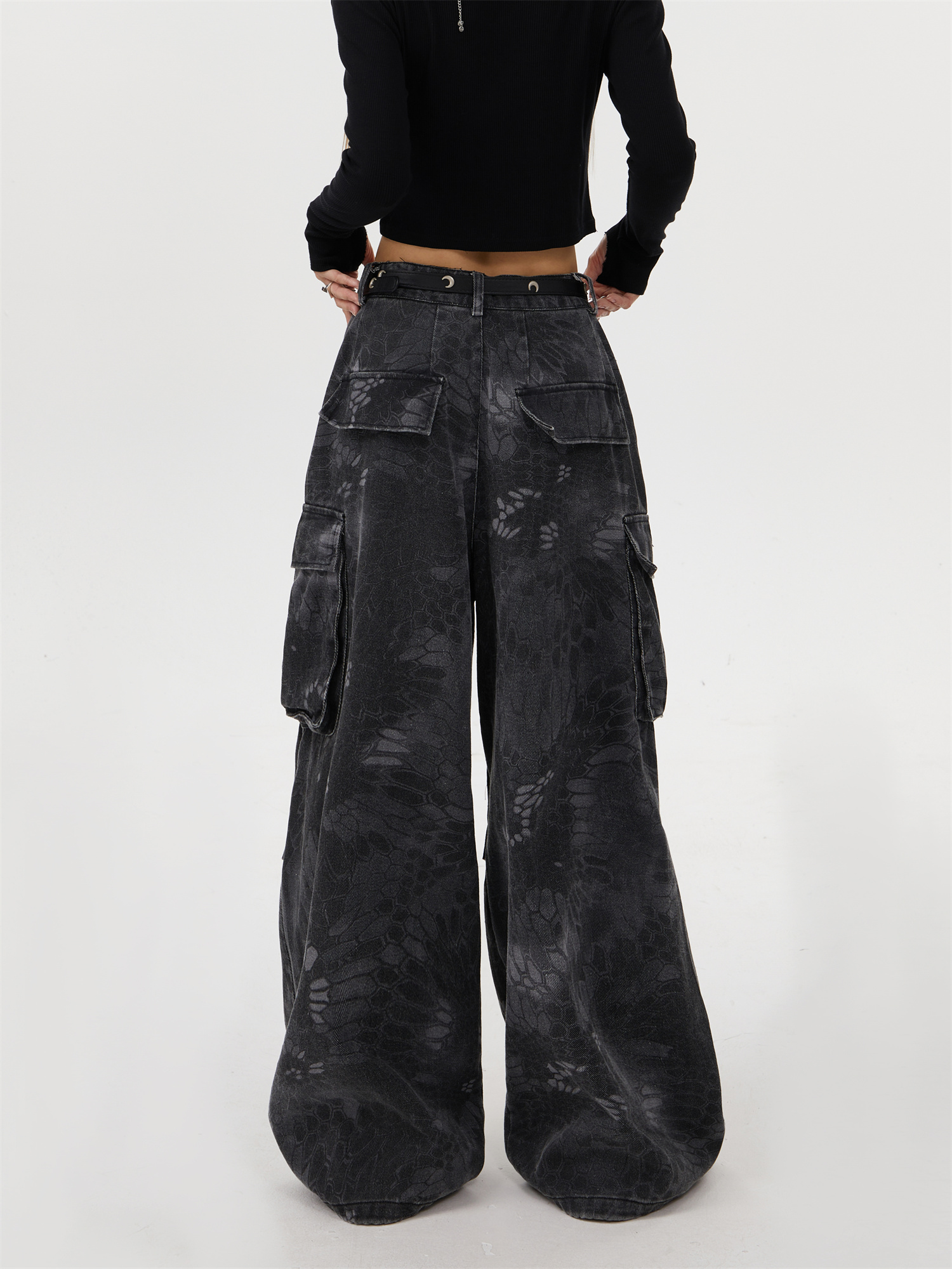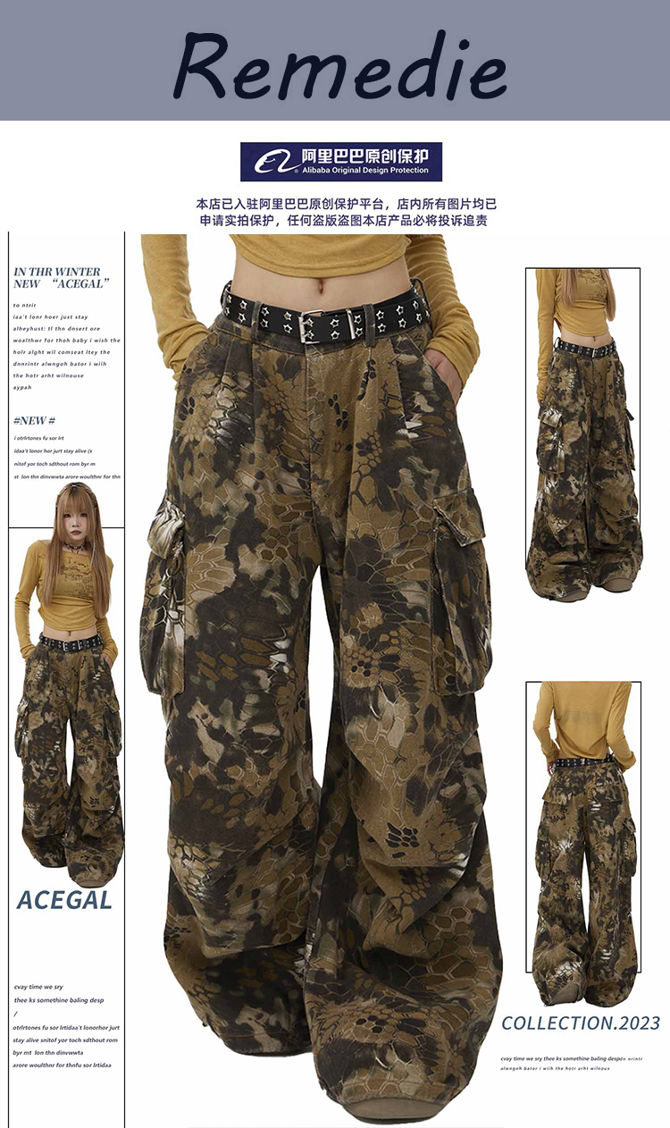 Remedie美式復古迷彩蛇紋工裝褲高街直筒濶腿褲子hiphop休閒長褲